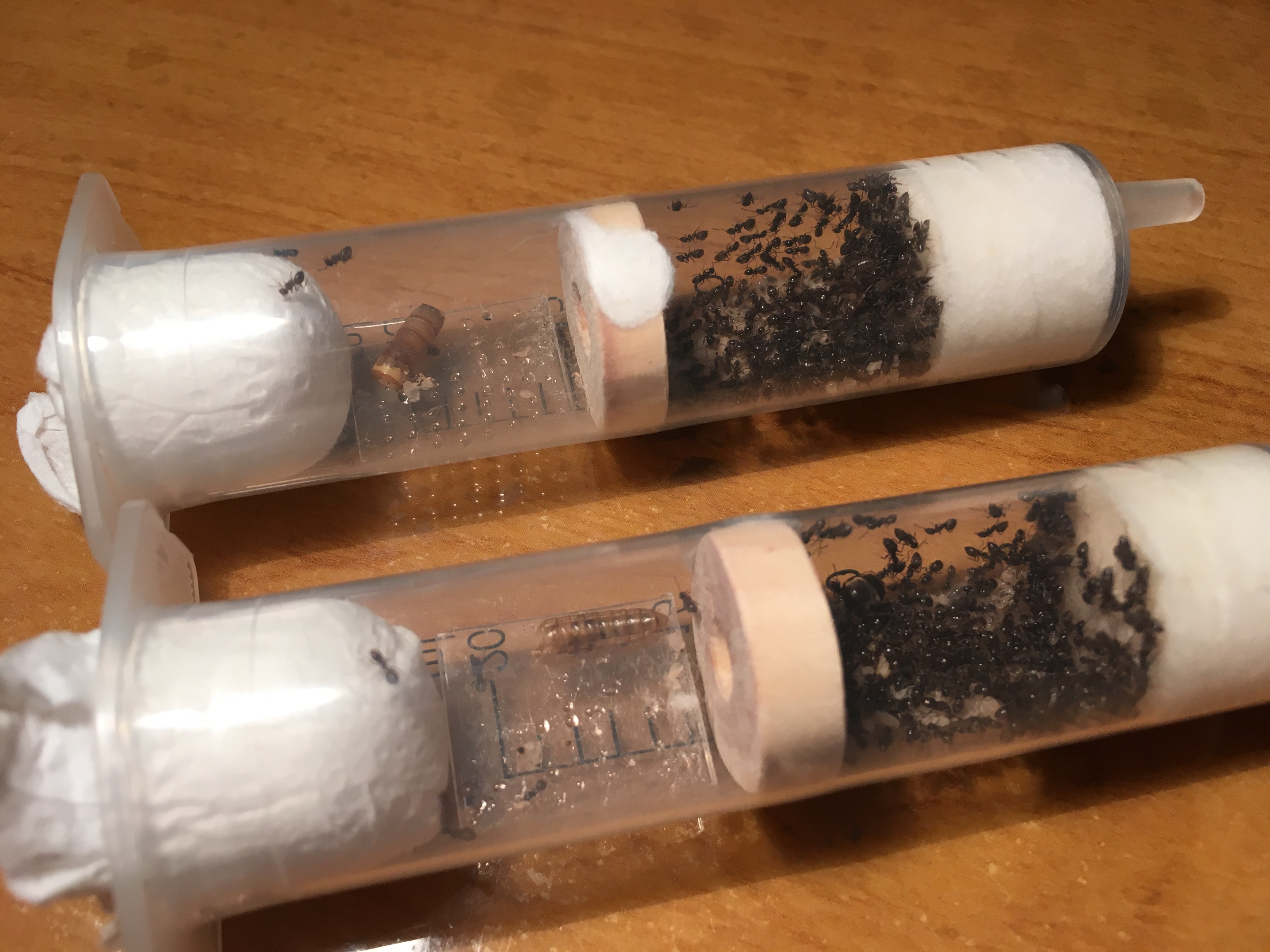 Wyjmuję zatyczkę, wyjmuje pinsetą blister ze strzykawki, zatykam. Jak wyczyszczę i nałożę nowa porcję to wkładam do strzykawki. Mrówki nie są aż tak skłonne do ucieczki jak mogłoby się wydawać:) Jak się doda przegrodę do probówki to tym bardziej.