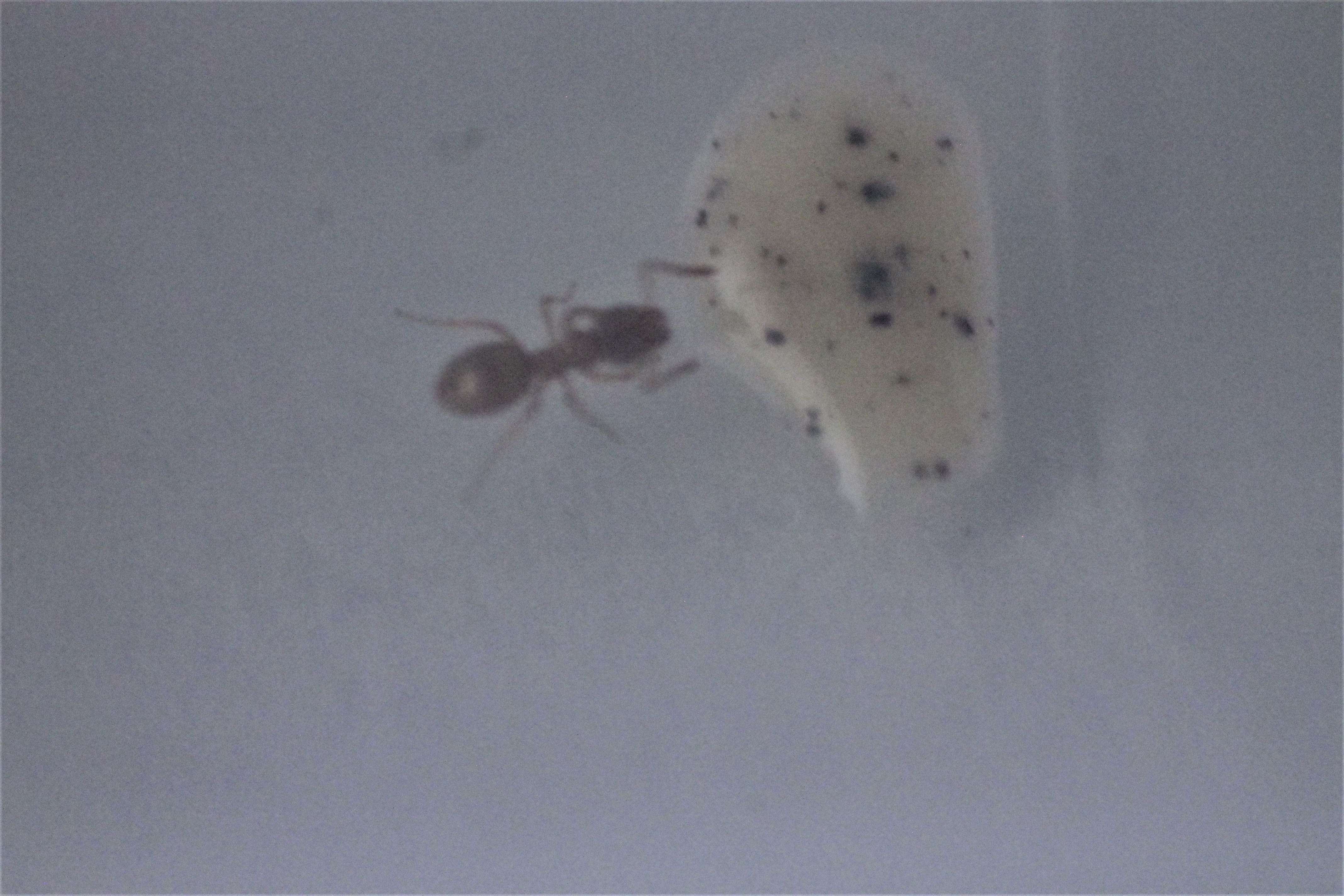 Mróweczki po chwili rzuciły się wygłodniałe na ekstrakt. Niestety, okazało się, że on szybko po zmieszaniu zastyga. Królowa była tak głodna, że cały pyszczek wsadziła w tę kropelkę (widać na zdjęciu) i tak zastygła! Złapałem się za głowę, ot i masz ci los. Czekałem trochę, mając nadzieję, że może robotnice ją poratują. Koniec końców pomogłem jej takim drucikiem delikatnie przepychając od drugiej strony ekstrakt, aż była wolna.