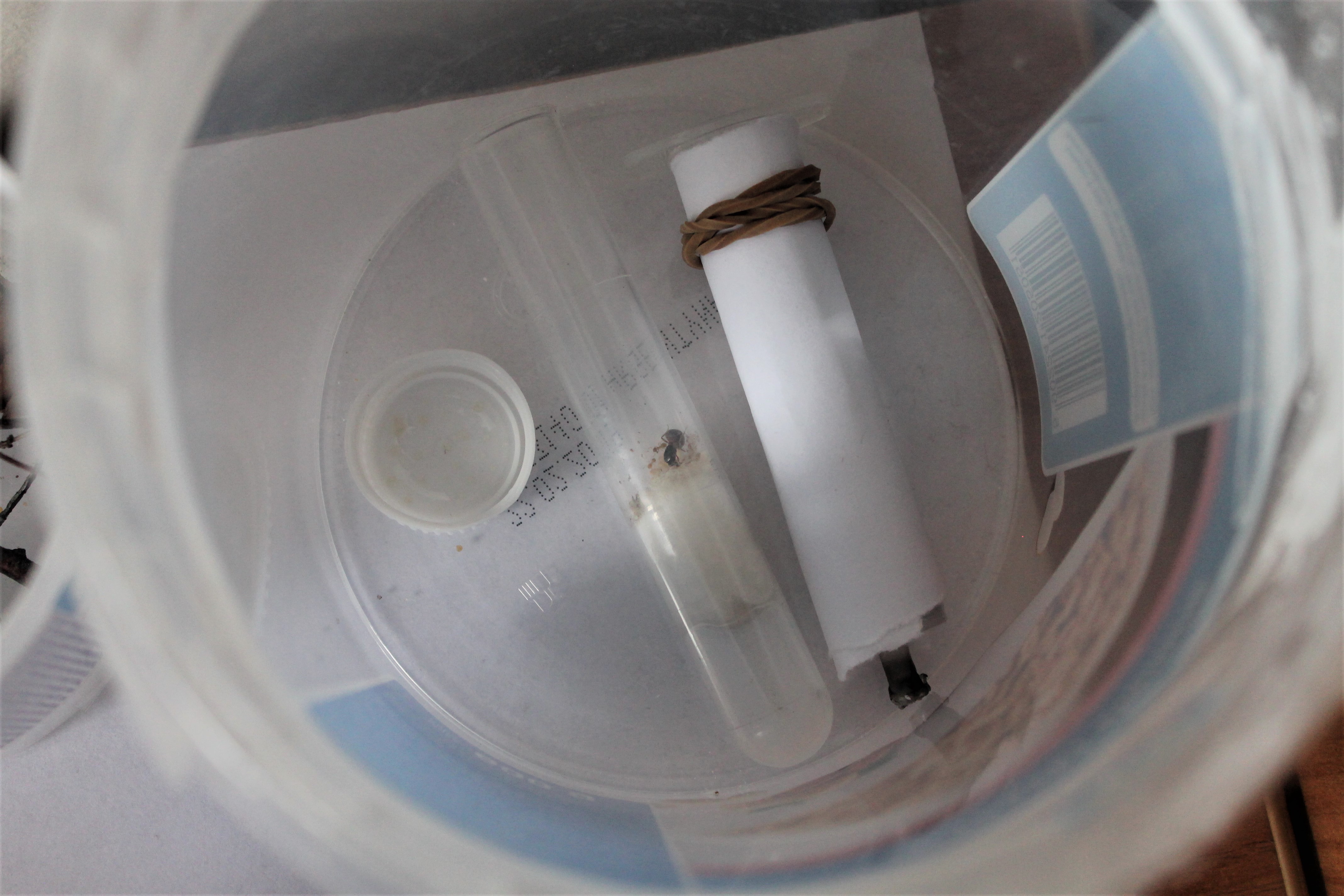 Ku mojej radości, po otwarciu nie dość, że królowa żyła, (a zamówiłem samotną królowe, to do tego po drodze musiała się sprężyć, bo ma teraz 5 robotnic (1 chyba jest imago, taka bielutka), 6 takich wielkich jaj, nie wiem jak to się nazywa, larwa i trochę jajeczek złożyła.