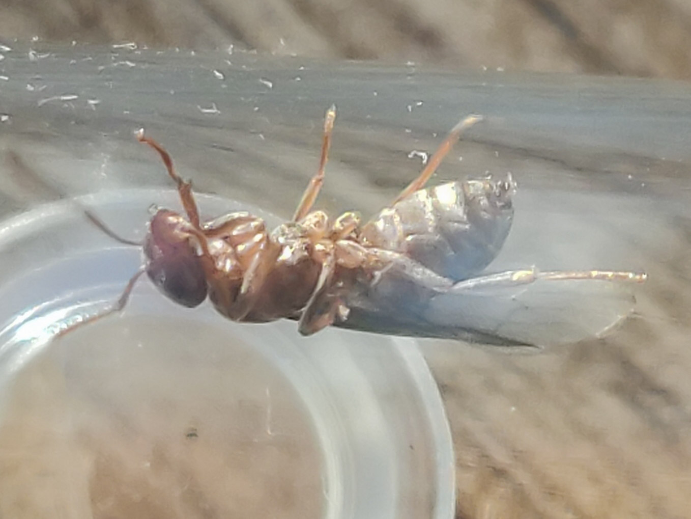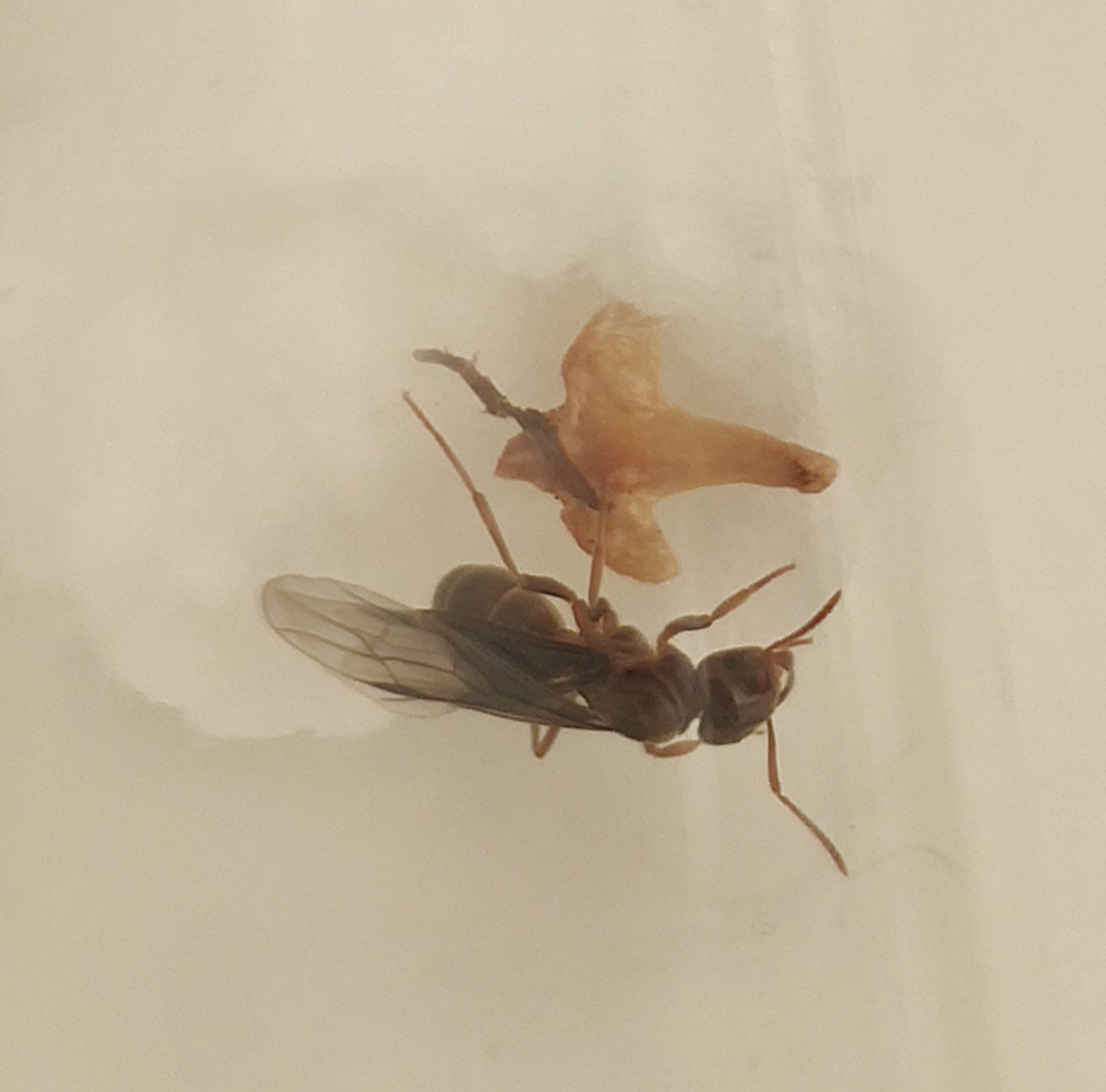 Na niektórych zdjęciach widać że ma czułka dwuczłonowe. Odleciał dopiero po dwóch dniach z otwartego pojemnika. Tak to ciągle w nim siedział i nie chciał uciekać. Ta druga mróweczka wykopała sobie gniazdo i sobie tam siedzi.