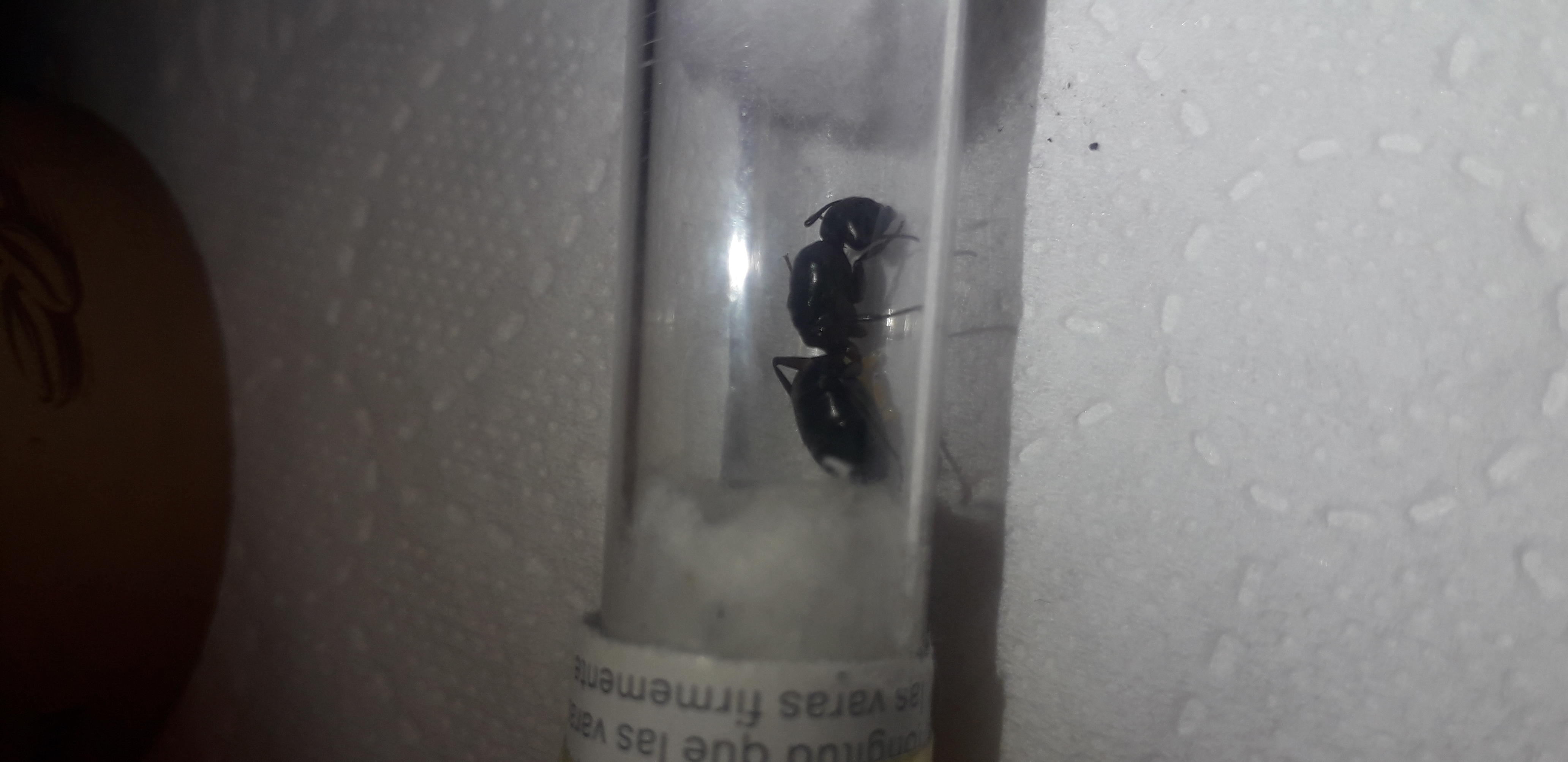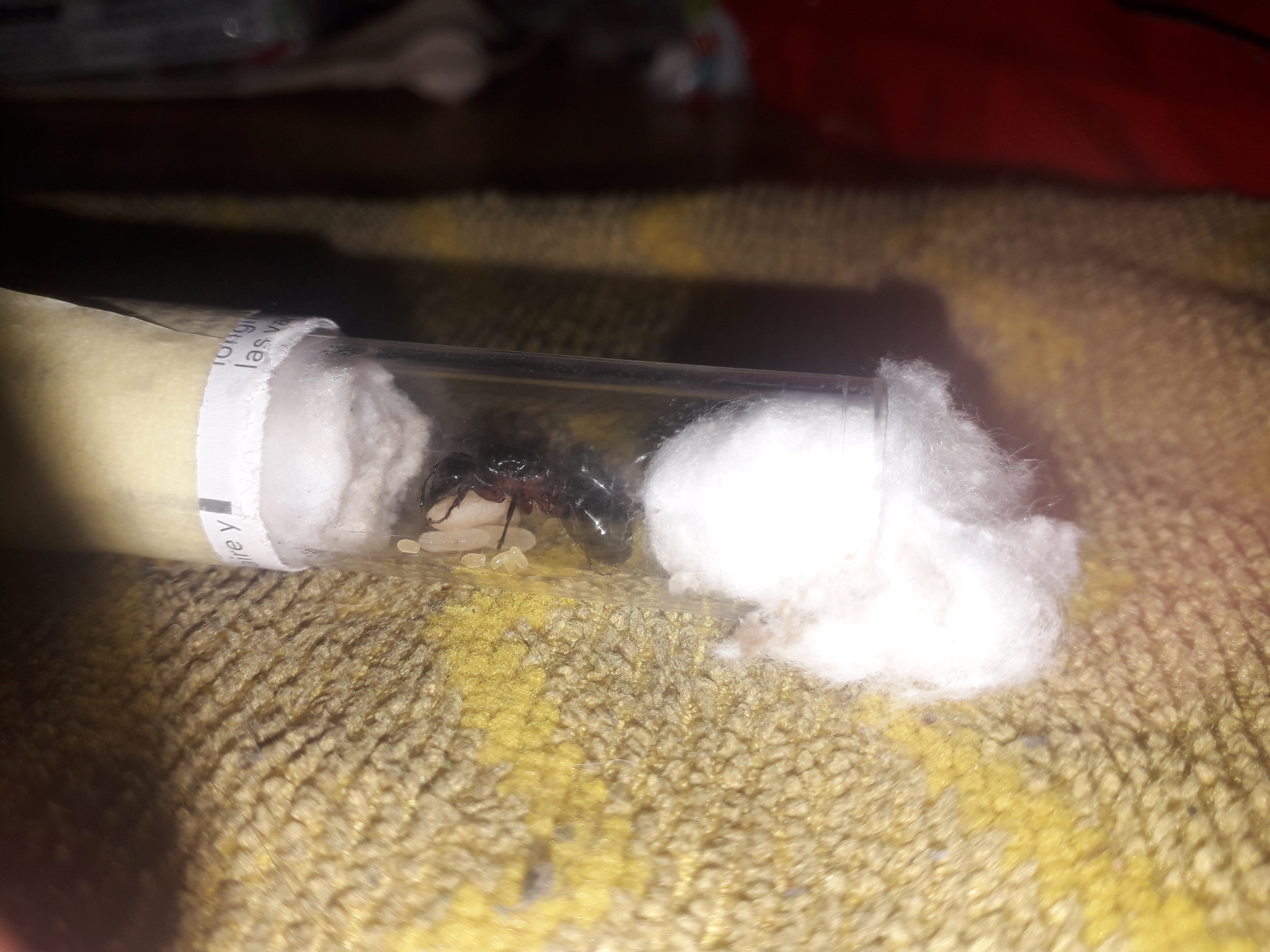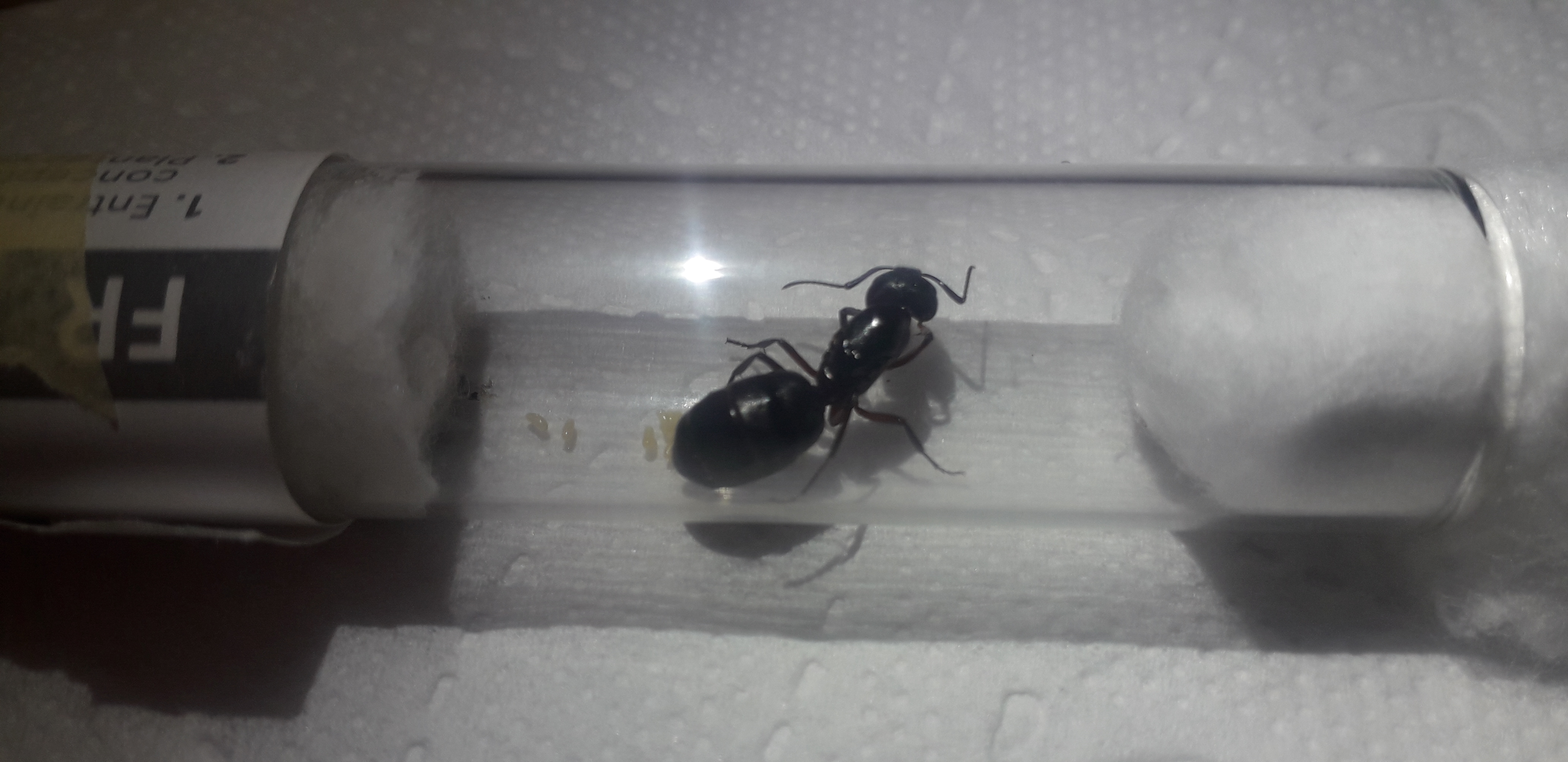 3. Ostatnia 'kolonia" jak posiadam to królowa Camponotus ligniperda- królowa znaleziona w kawału drewna w zimie. Wybudzona z hibernacji. Bardzo uparta składa jaja i je zjada. Ale od jakiegoś czasu jak wyladowała w szafie widać postepy.