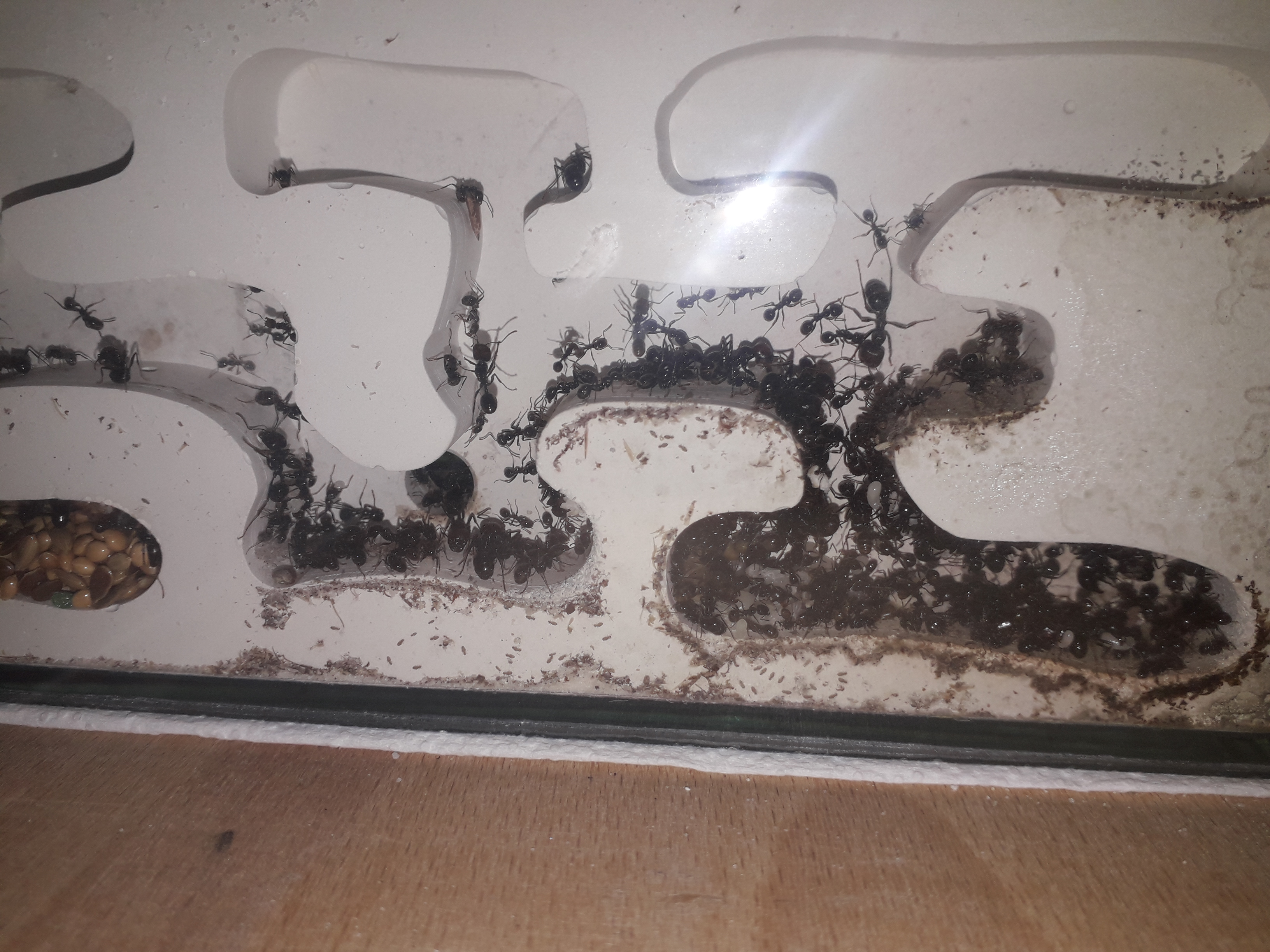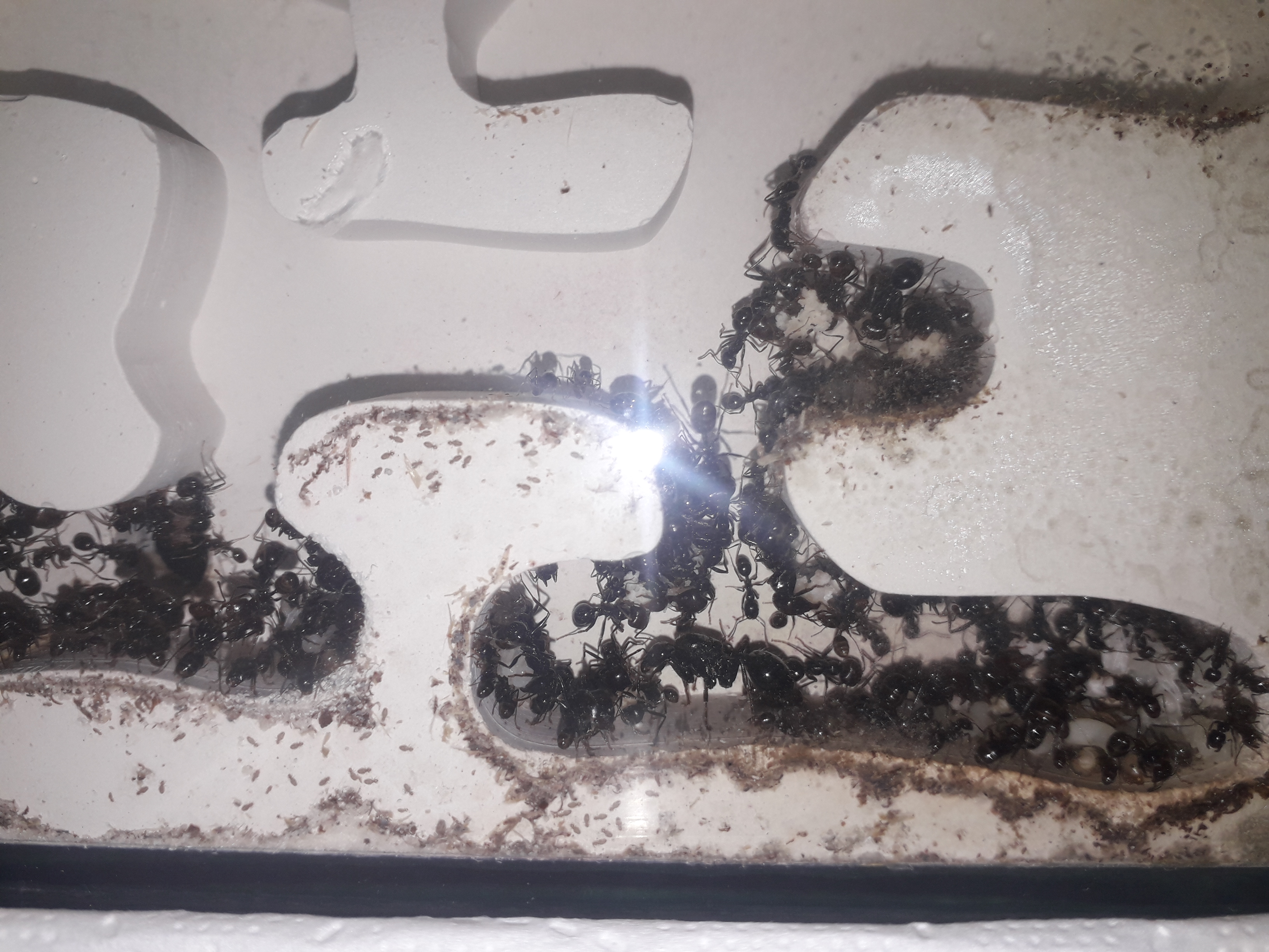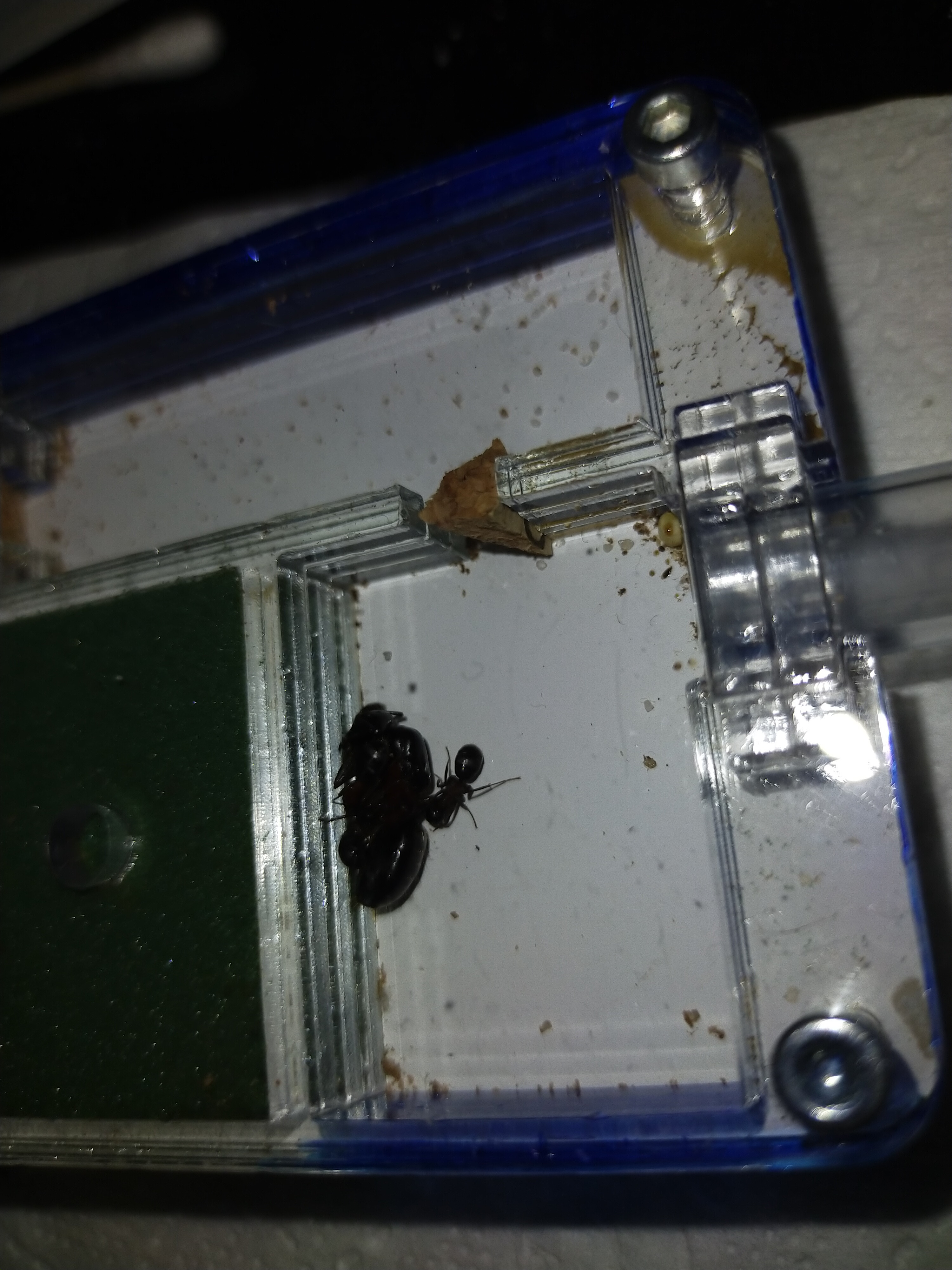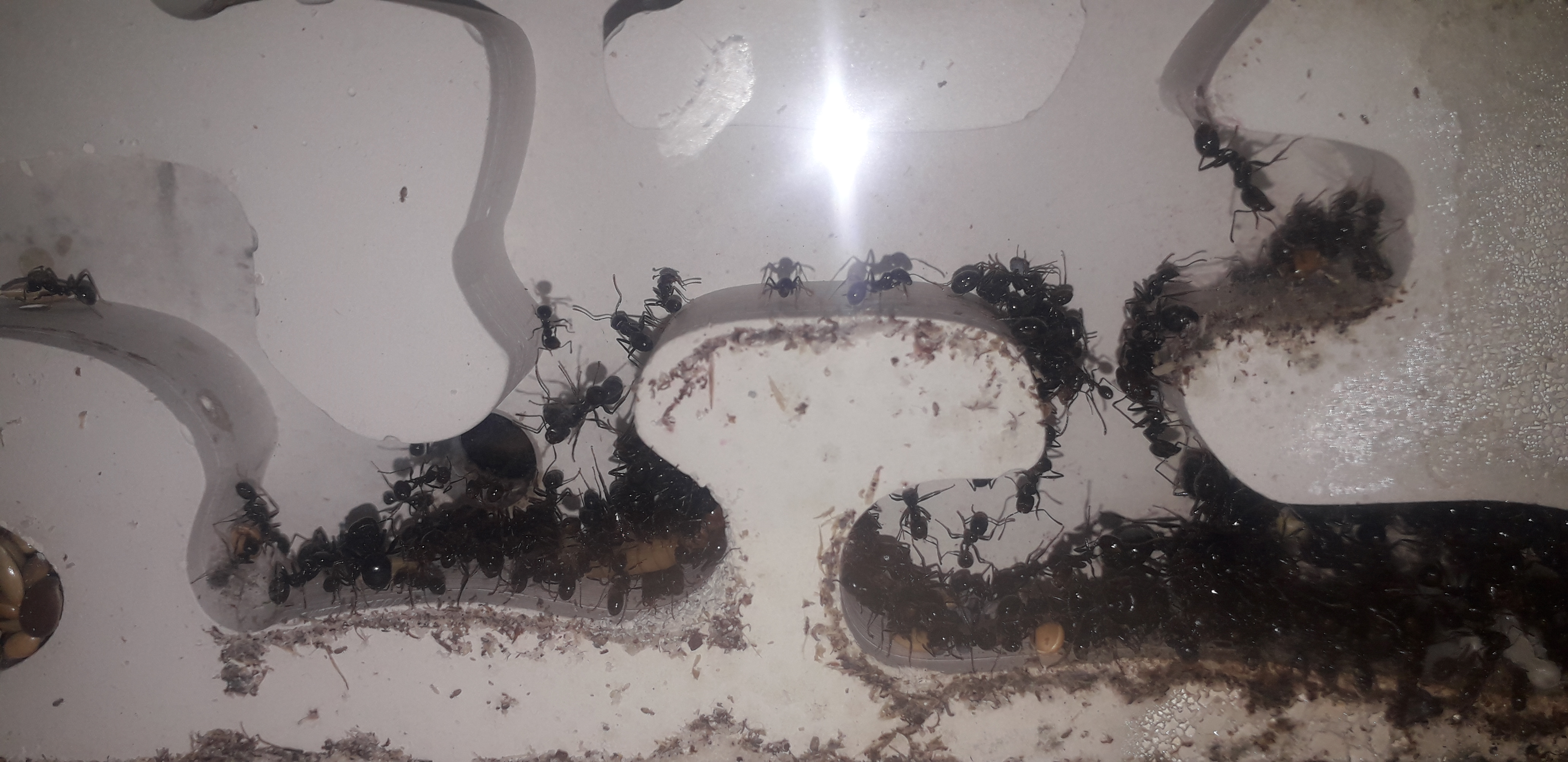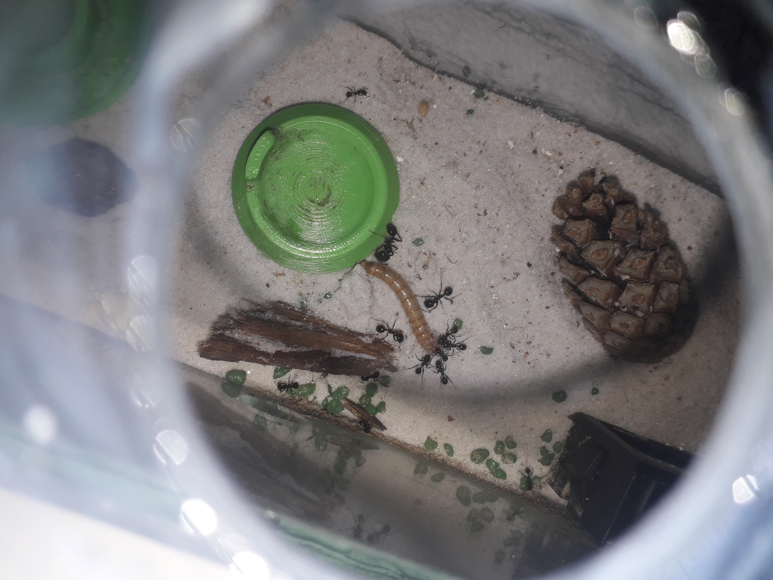 Kolonia bardzo dobrze sie rozwijała jednak od tygodnia zaobserwowałem popadanie w stagnacje.Jest dużo mniej larw i poczwarek. Również mniej ochoczo się rzucają na mączniki. Podłączyłem im tez dodatkowa arenę co ułatwiło mi karmienie oraz sprzatnie bo mrówki wynoszą śmieci do tej areny