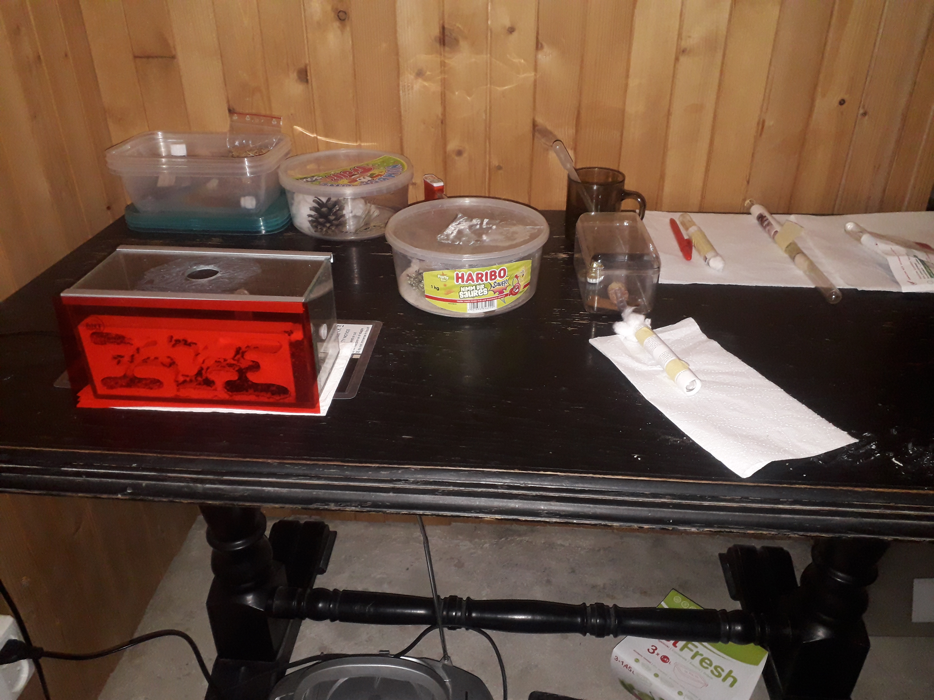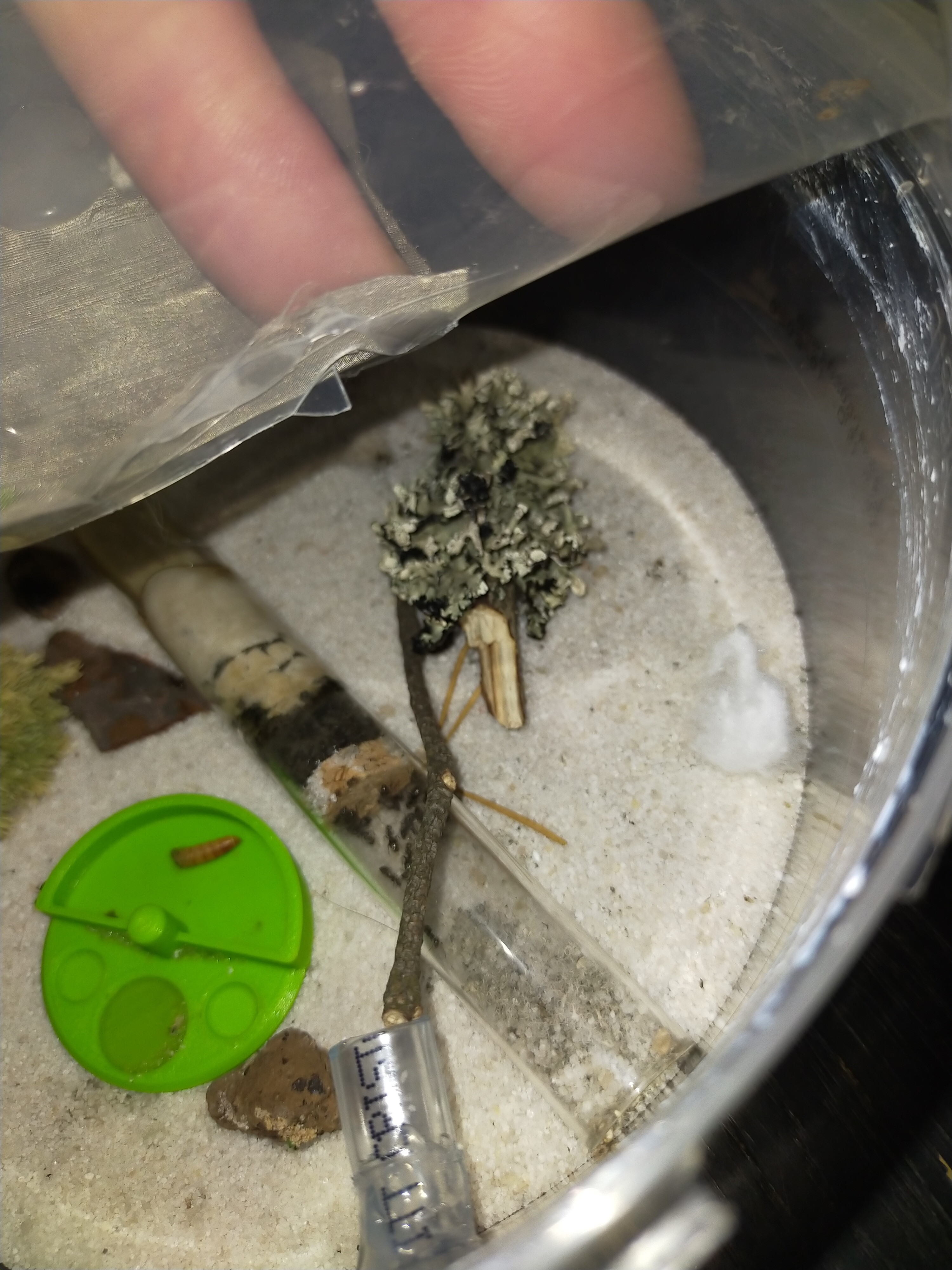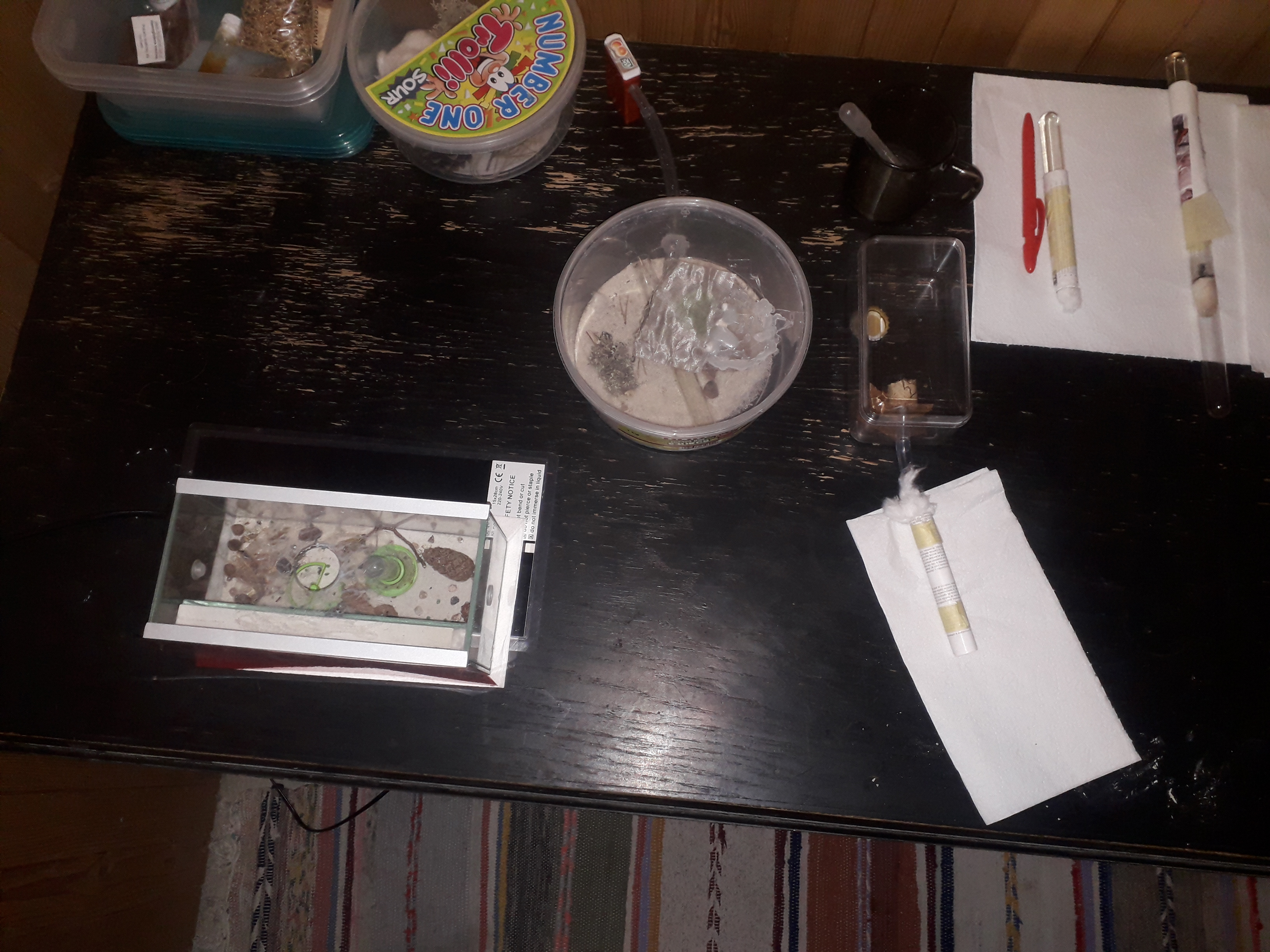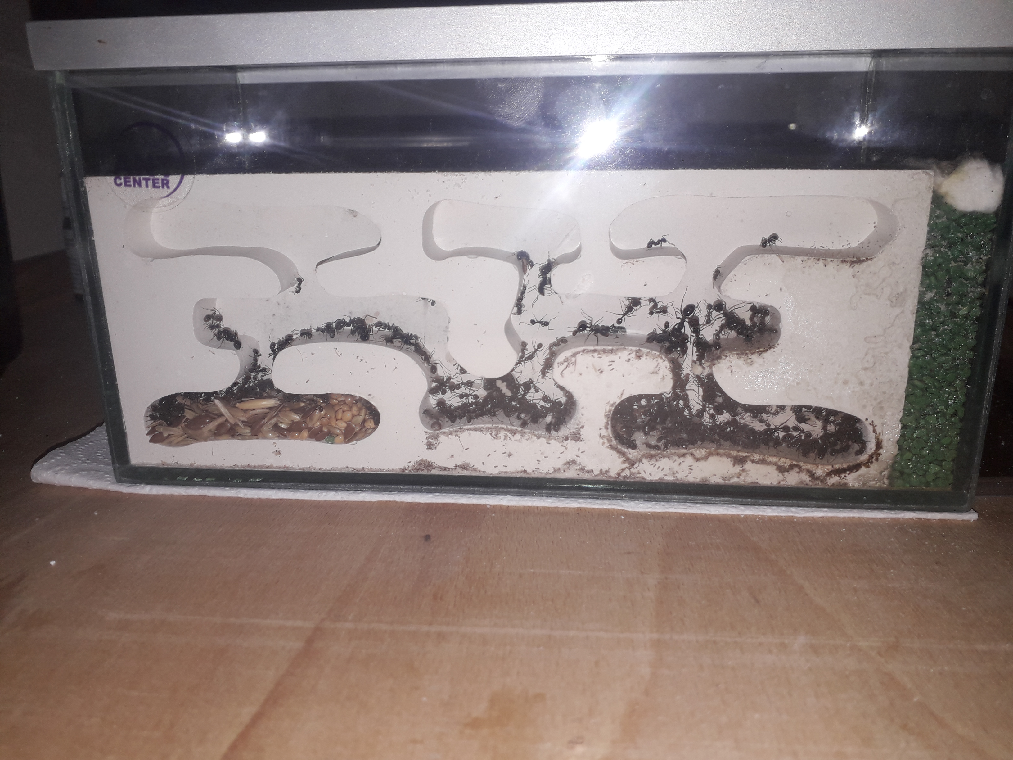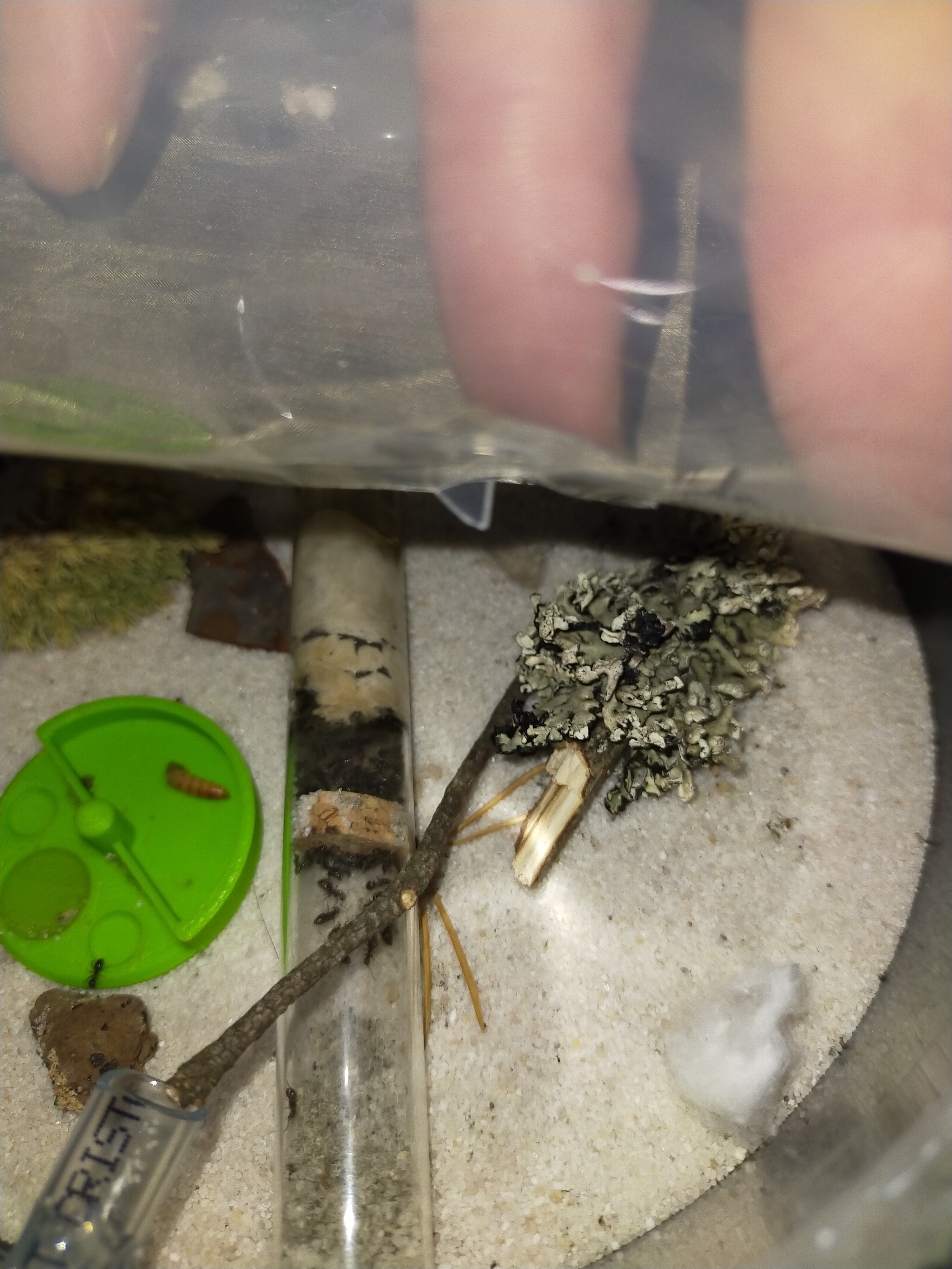 Kolonia bardzo dobrze sie rozwijała jednak od tygodnia zaobserwowałem popadanie w stagnacje.Jest dużo mniej larw i poczwarek. Również mniej ochoczo się rzucają na mączniki. Podłączyłem im tez dodatkowa arenę co ułatwiło mi karmienie oraz sprzatnie bo mrówki wynoszą śmieci do tej areny