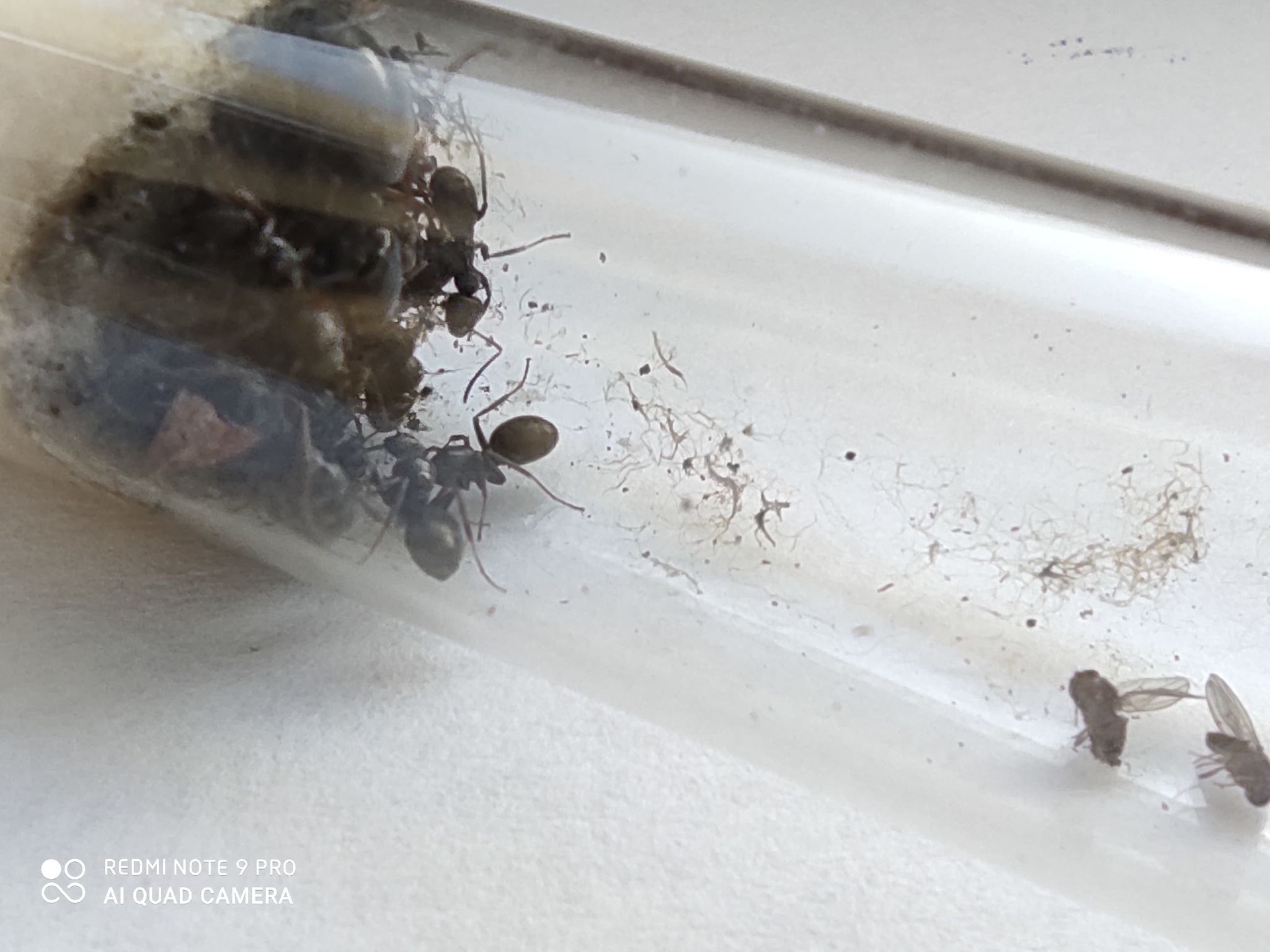 01.04.2021: Od tygodnia nie zauważałem mrówek na górnej części zbiornika, od dołu widziałem jedynie ze 2-3 poczwarki. Zacząłem się niepokoić i przeprowadziłem mrówki do małej probówki. Ale z 16 robotnic wprowadziło się tylko 4... i królowa oczywiście. Na arenie zaczęła gromadzić się pleśń wynikająca z wilgotności. Mrówki trzymam w probówce.