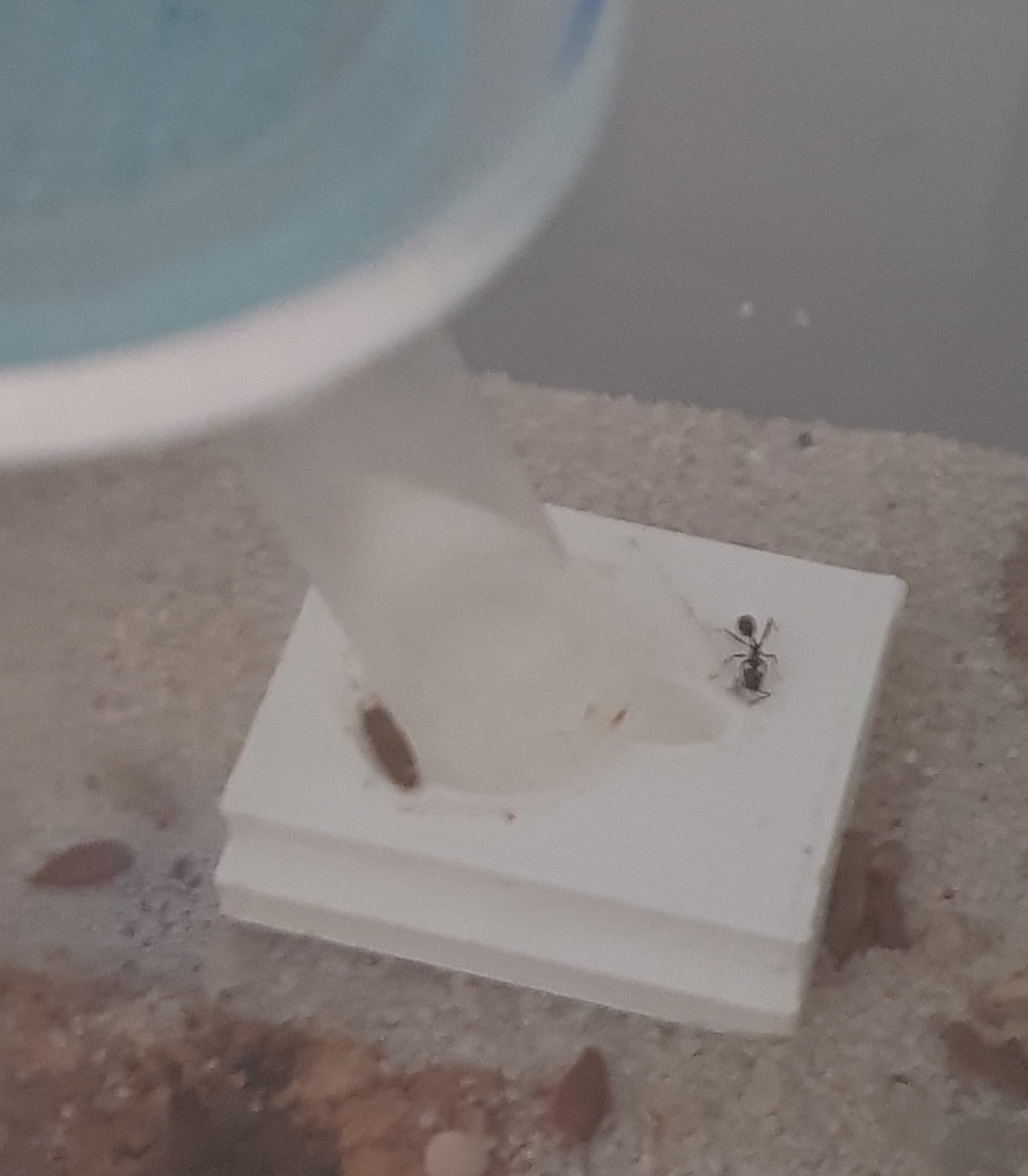 Ostatnio jak przez przypadek ruszyłem poidełko to kropla wody się wylała z probówki i pojawiła się w tym wycięciu i mam wrażenie, że dopiero wtedy mrówki zobaczyły, że tam jest woda i zaczęły ją pić, jednak pewności nie mam.