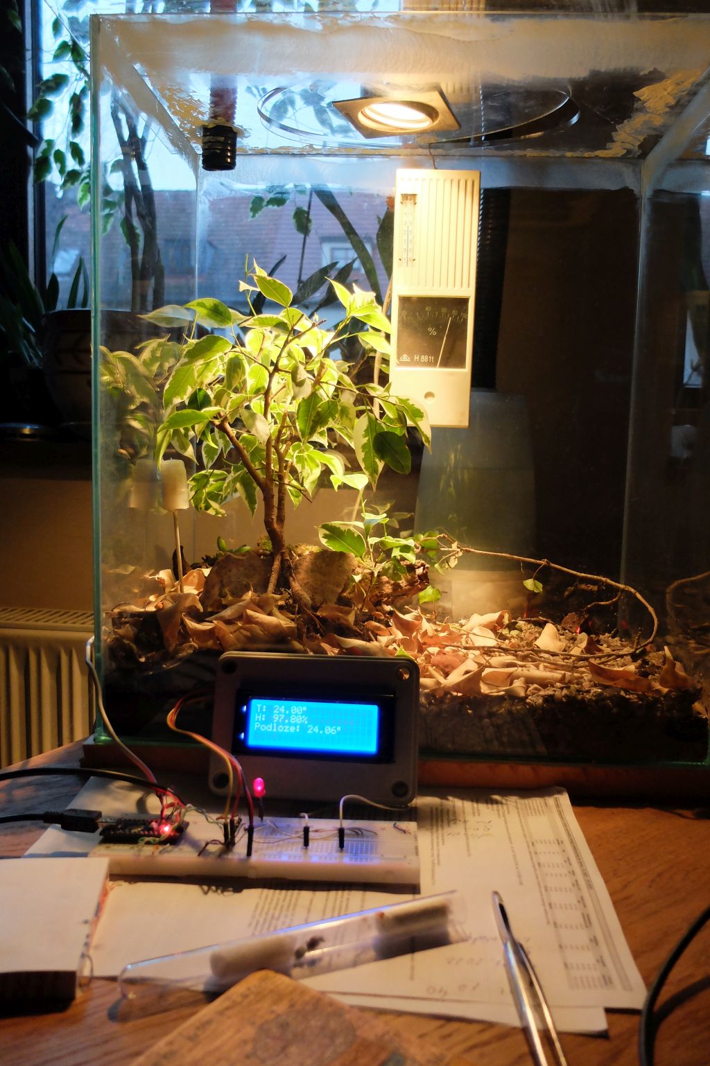 Co do sterowania to pracuję nad tym tylko z czasem cienko. Na razie pracuje tylko monitor temperatury i wilgotności. Ale planuję zrobić kompleksowy sterownik, pilnujący temperatury, załączający oświetlenie, zamgławiacz. I faktycznie aktualnie piszę w Arduino bo chyba najszybciej i jest mnóstwo gotowców.