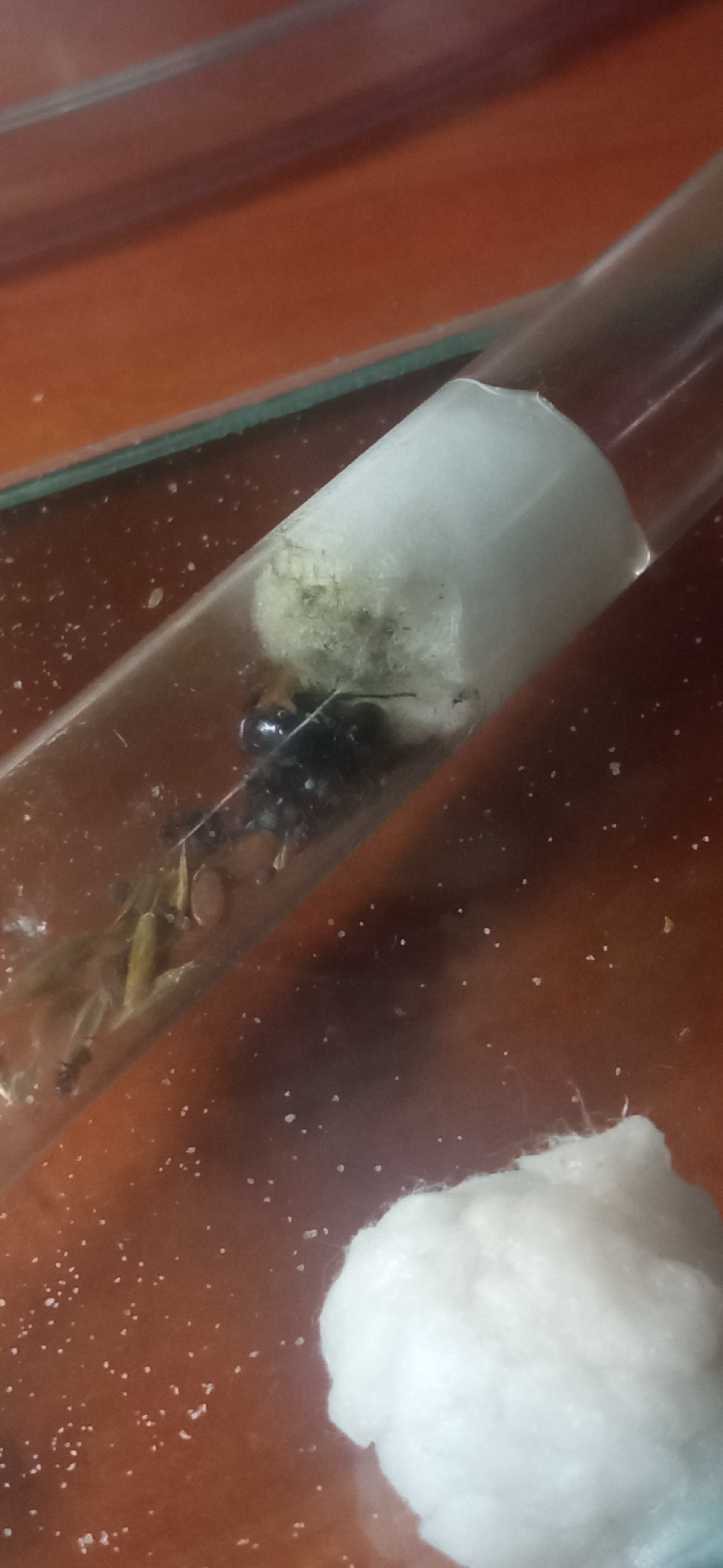 2. Na karmidełku i ścianach probówki pojawiła się przezroczysta ciecz, czy jest to kwestia tego, że mrówki przeniosły tam wodę? Martwić się?