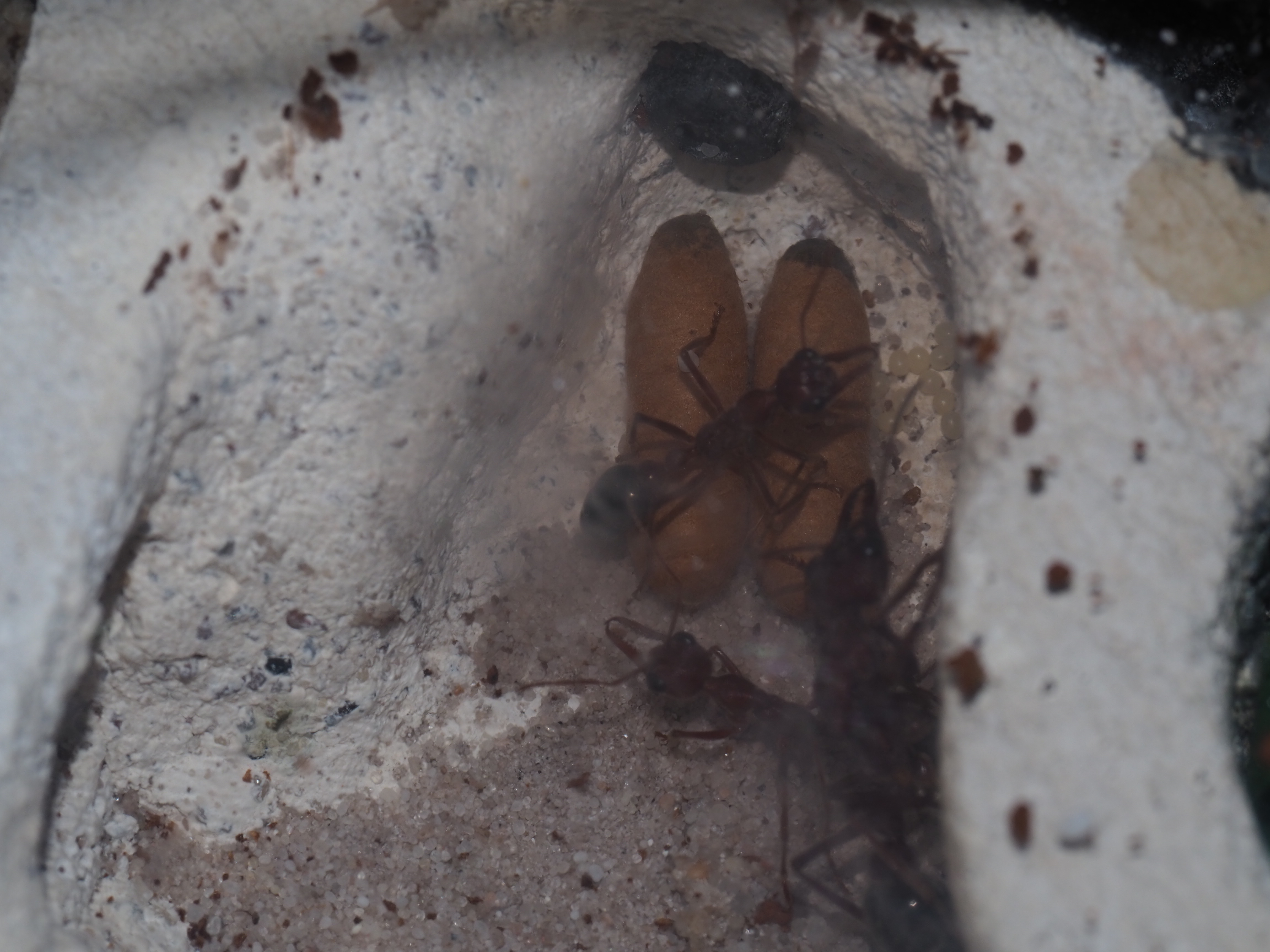 Na początku widziałęm jajka w probówce w której mrówka siedziała ale na zawsze znikały,od jakiegoś tygodnia mrówka prawie wcale nie wychodziła z probówki,no i wczoraj znalazłem ją martwą na arenie.