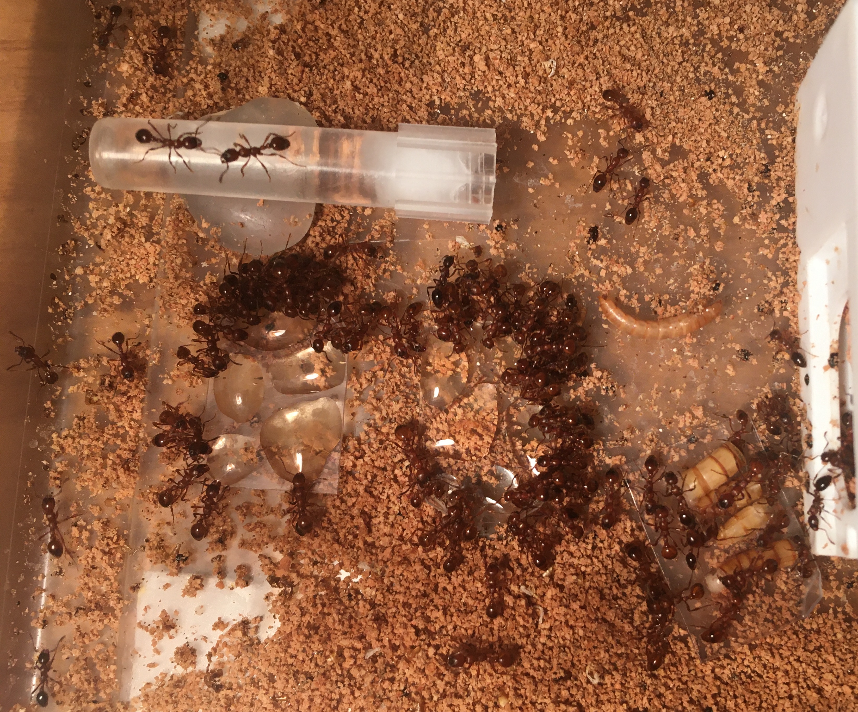 Zajmuje sie mrowkami od poczatku tego roku. Do tej pory mialem tylko Messor Barbarus. Manica wydala mi sie bardzo ciekawa i postanowilem kupic. Czytalem ze nie jest latwa w hodowli, szczegolnie na poczatku rozwoju kolonii. Moja krolowa ma jedna robotnice i kilka larw. Jest w probowce podlaczonej do mini areny zeby latwiej bylo mi podawac jej jedzenie. Wydaje sie byc bardzo ruchliwa i zywa. Pozdro
