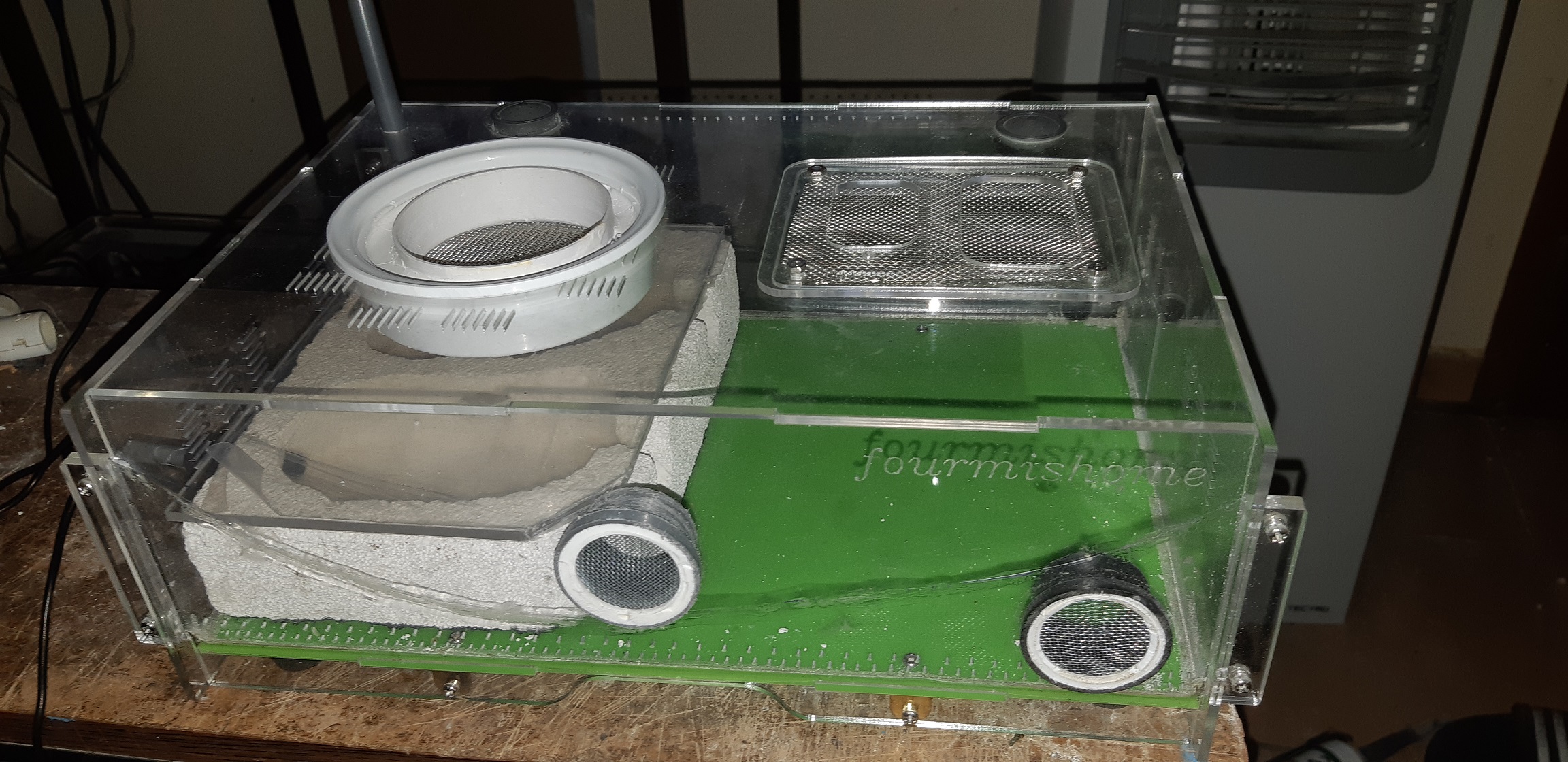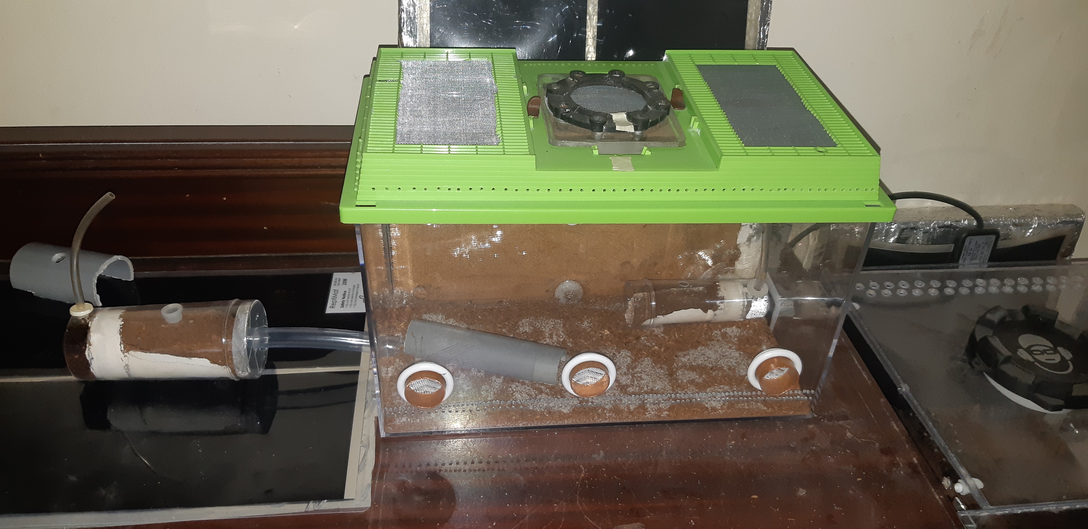 Trzymałem ją w fauna boxie takim jak na zdjęciu,tzn probówka w której przyszła do mnie była na arenie,oprócz tego było jeszcze jedno gniazdo na arenie(pojemnik zalany betonem z włoknem kokosowym,oprócz tego w tylnej ścianie areny było gniazdo korkowe i na zewnatrz areny jeszcze jedno gniazdo.Mrówka cały czas przebywała w probówce w której do mnie przyszła.