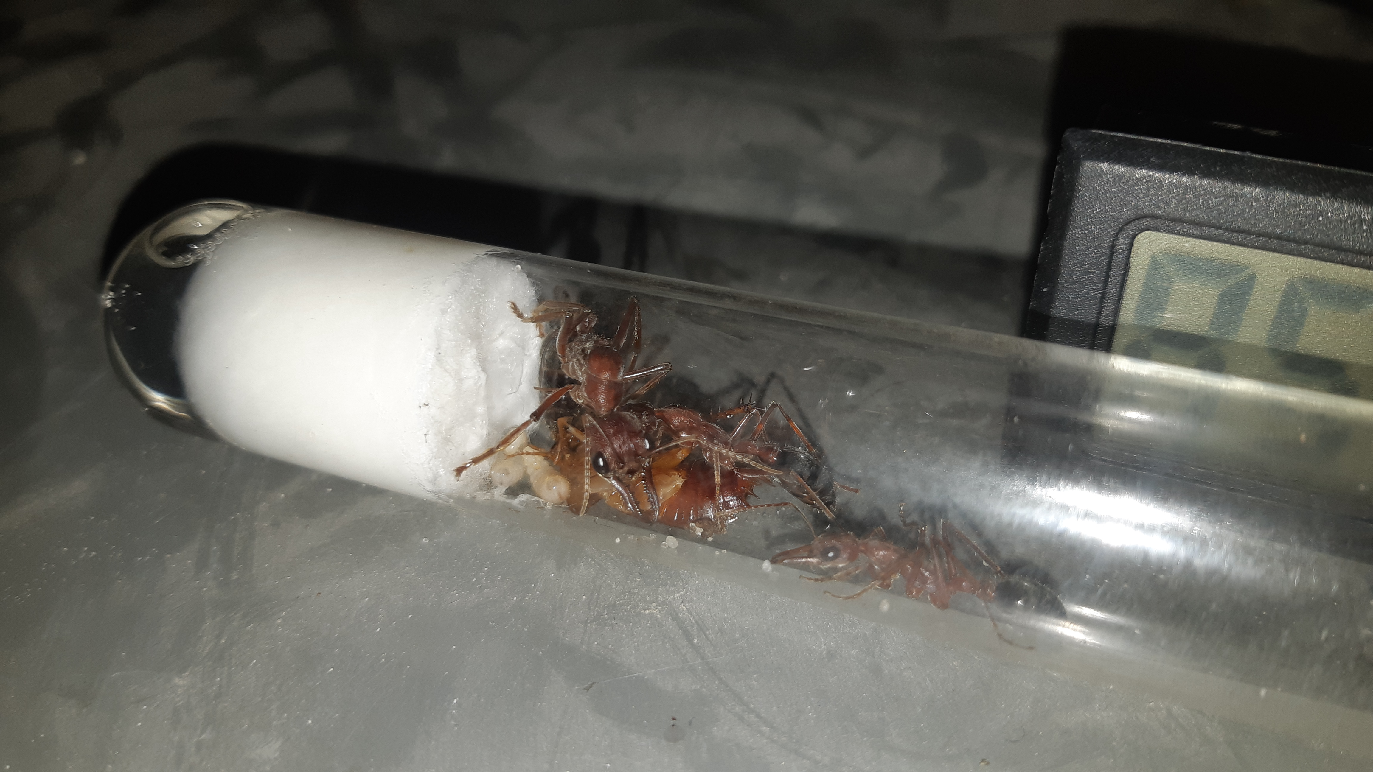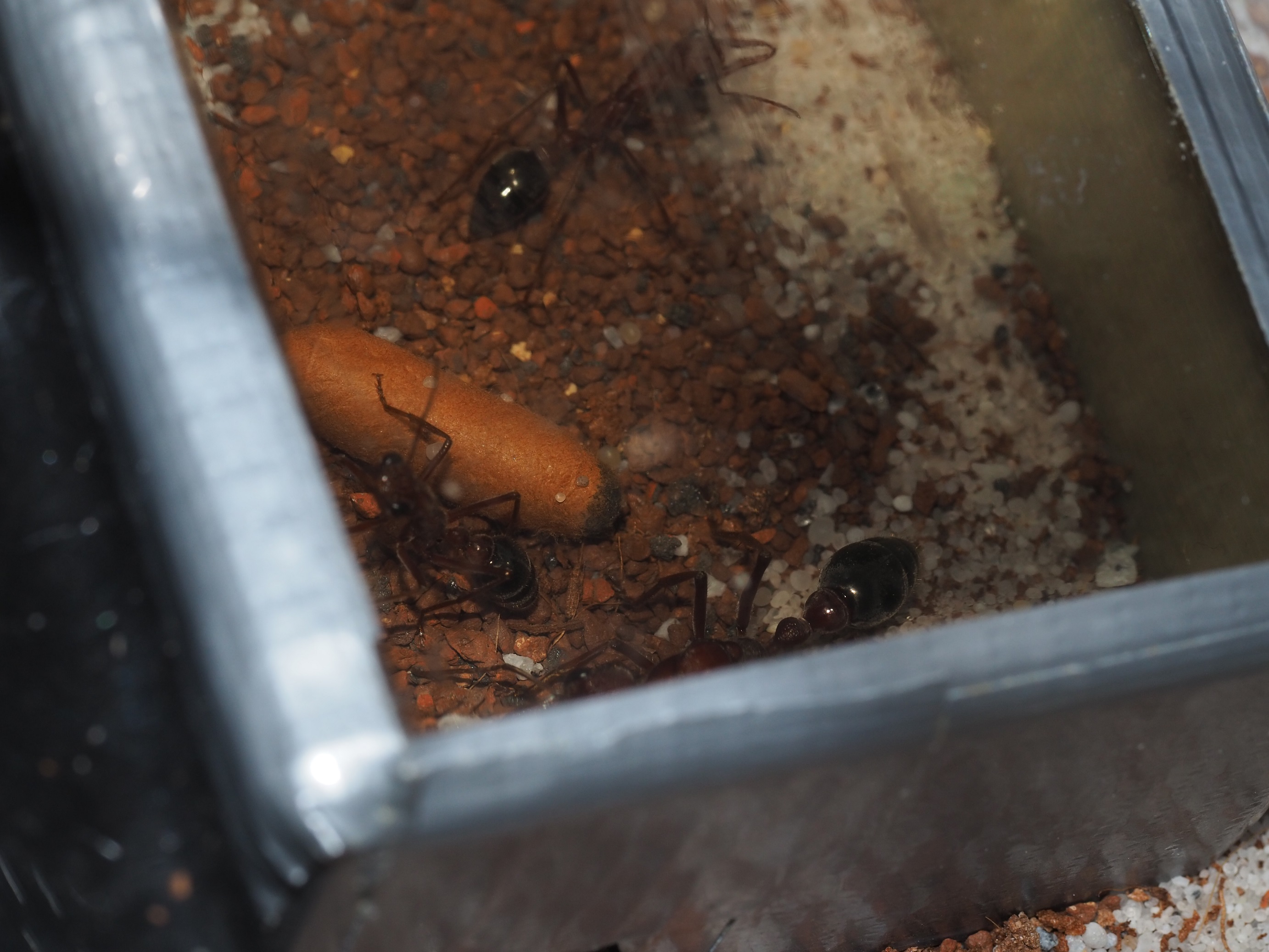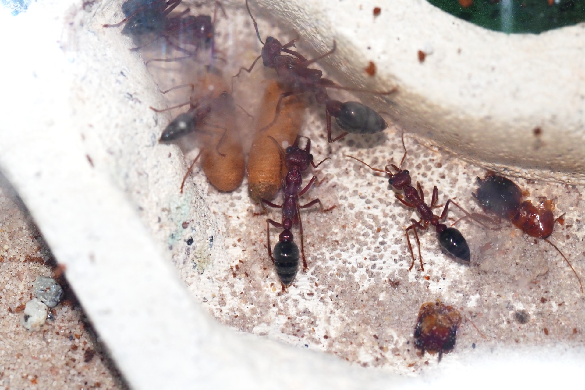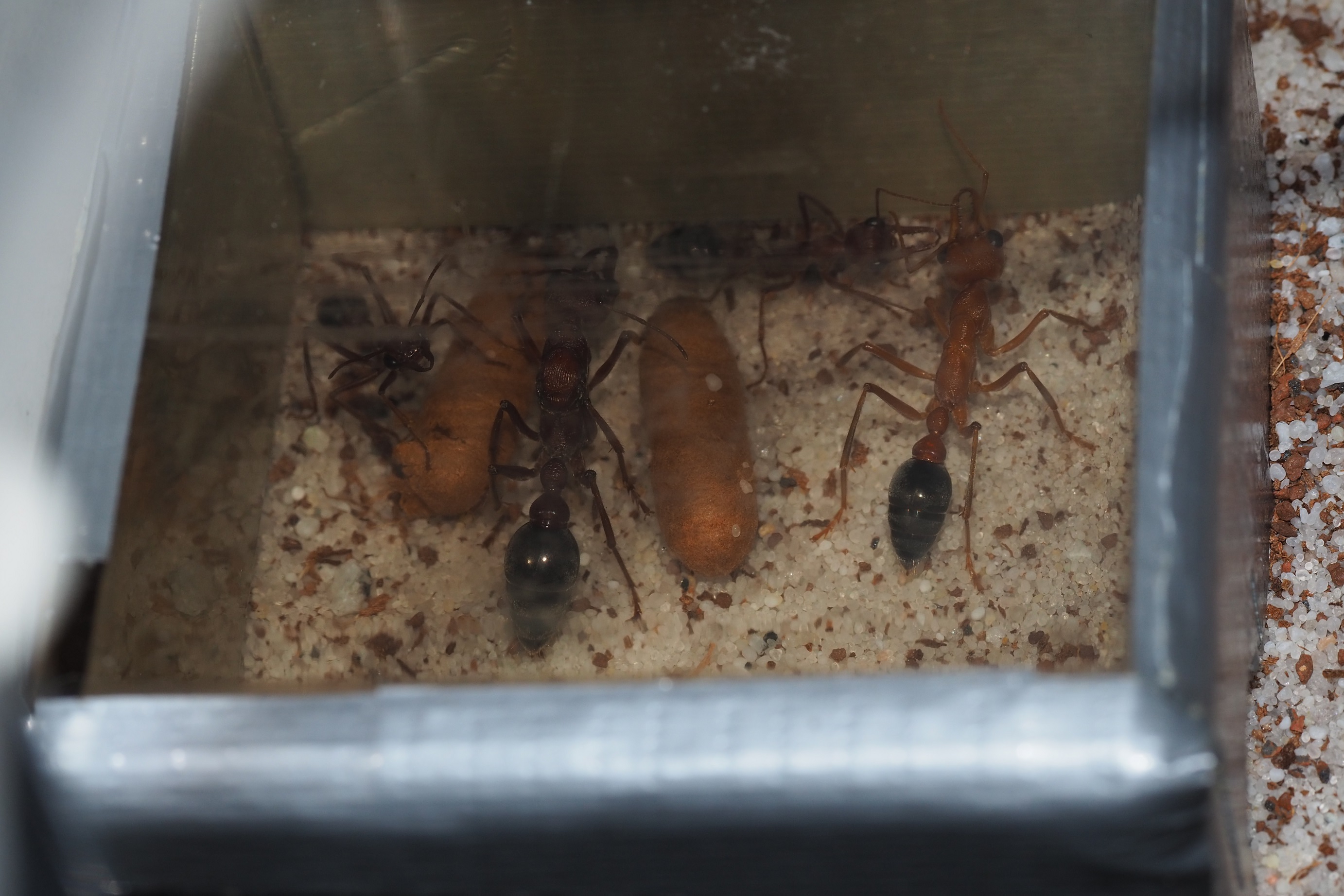 Na początku widziałęm jajka w probówce w której mrówka siedziała ale na zawsze znikały,od jakiegoś tygodnia mrówka prawie wcale nie wychodziła z probówki,no i wczoraj znalazłem ją martwą na arenie.