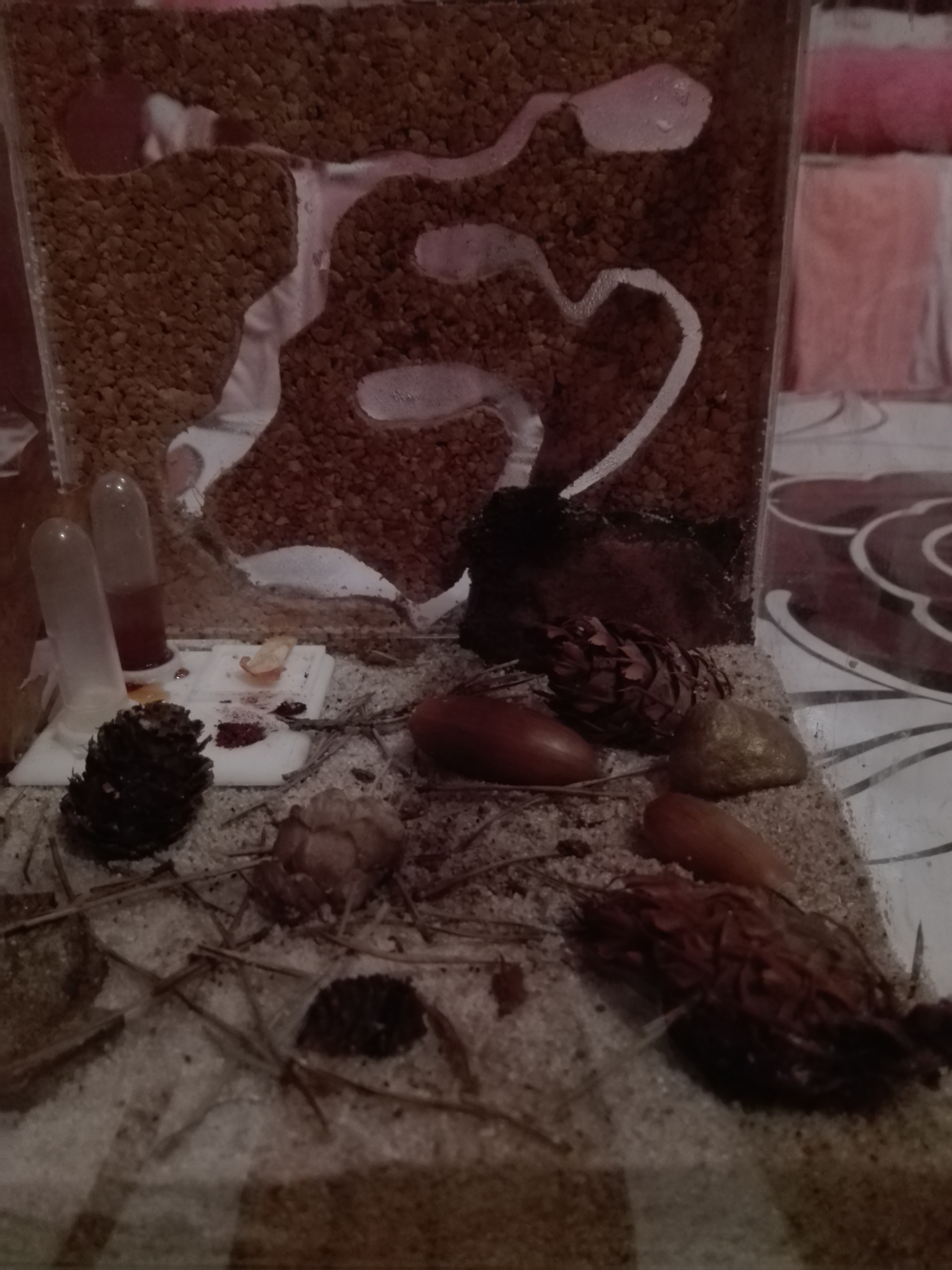 Taką kolonie najlepiej trzymać w probówce lub bardo małym gnieździe. Jeżeli masz większe formikarium możesz podpiąć do niego probówkę, dodatkowo ją zaciemnić. Teraz mrówki zaczynają wpadać w stagnację i przyszedł czas na zimowanie, możliwe że u Ciebie również nastał ten czas. Piasek mrówki zazwyczaj znoszą by zmniejszyć otwór wyjściowy oraz zaciemnić sobie komory, oblepiają wtedy szybę.