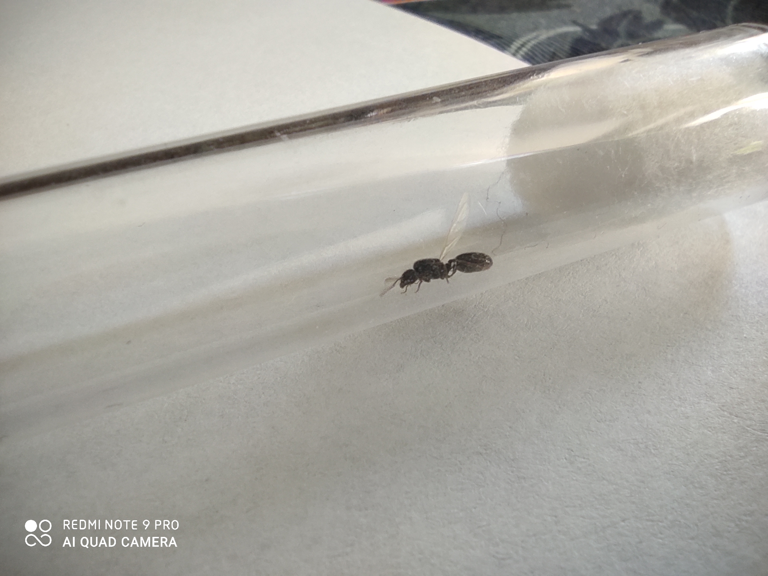 witam :!: dziś na chodniku znalazłem rójkową królową solenopsis fugax albo tetramorium znalazłem ją dokładnie w tym samym miejscu co wczoraj. Tylko że wczoraj znalazłam martwą z pasożytem w odwłoku. Byłem tak uradowany że prawie nie od tańczyłem tańca szczęścia. :naglowie: .a no tak ma jeszcze jedno skrzydło ale wnioskuję że skoro pozostałe odrzuciła jest za plemiona.