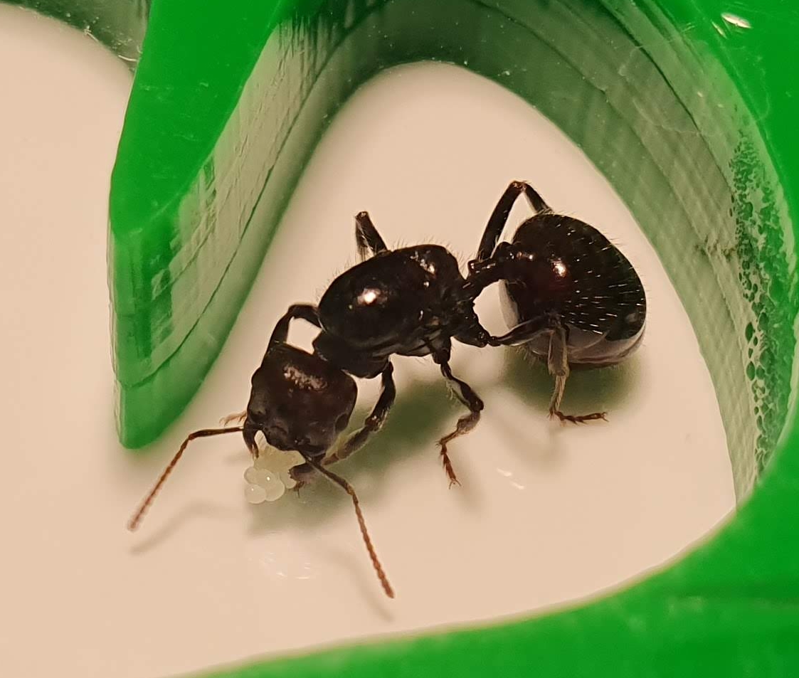 Mam samotną królową Messor Barbarus około 2 mies. , przez ten czas złożyła kilka jajek które ze sobą nosi od czasu do czasu, ale niestety nie ma żadnych larw z tych jajek.