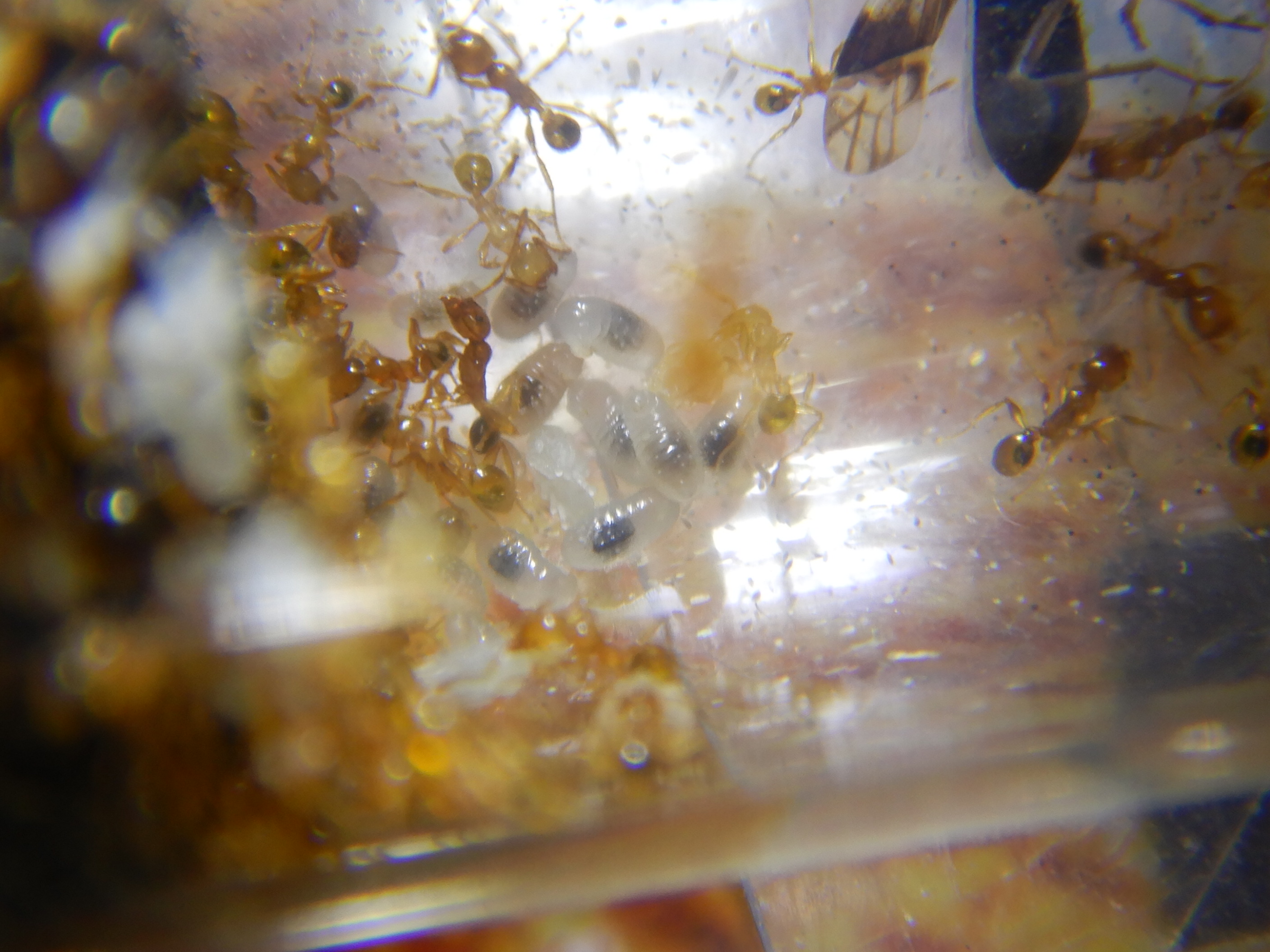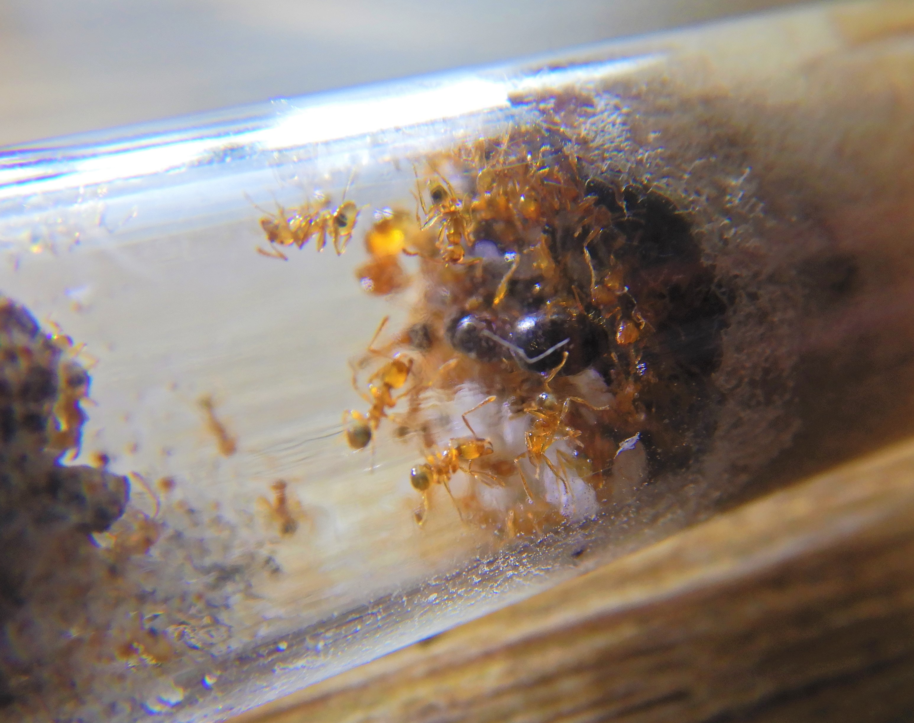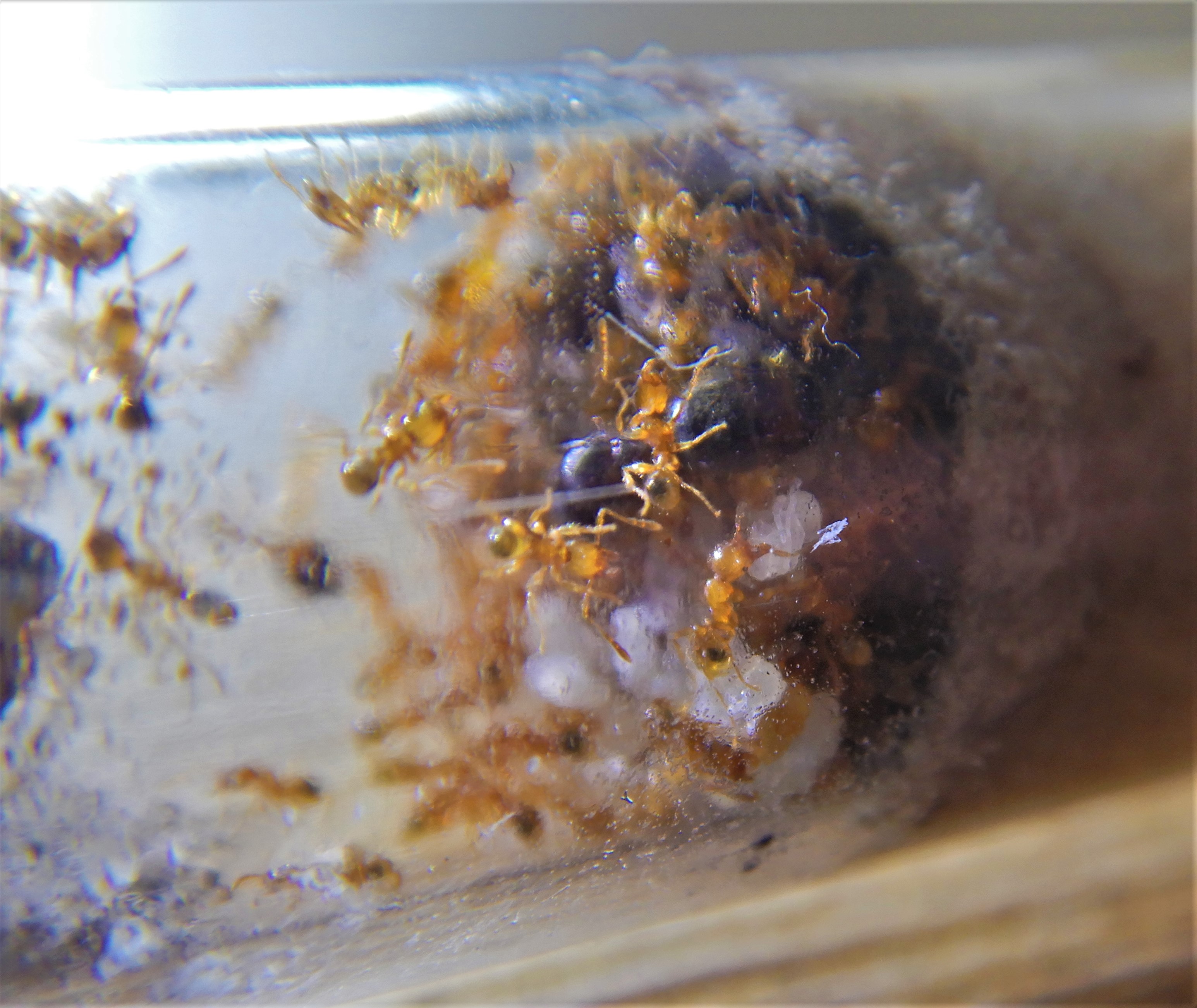 Probówkę z nimi włożyłem od razu na arenę. Kiedy zapoznały się już z nowym miejscem postanowiłem, że nadszedł czas karmienia. Dałem im małą kropelkę miodku, jednak nie były nim zainteresowane. Robotnica dotykała tylko przez chwilę czułkami i na tym się skończyło. Spróbowałem też z mącznikiem - ta sama historia.