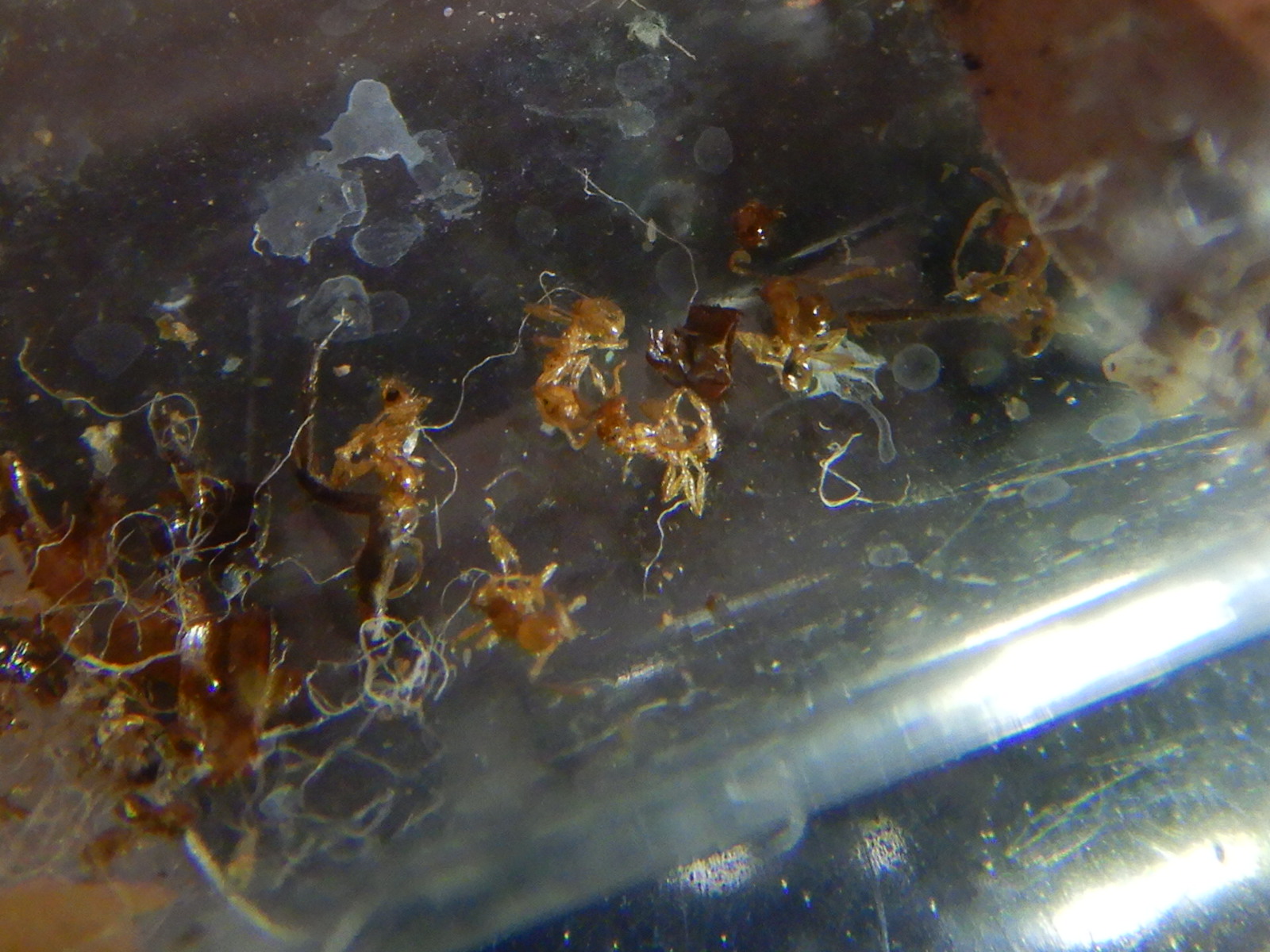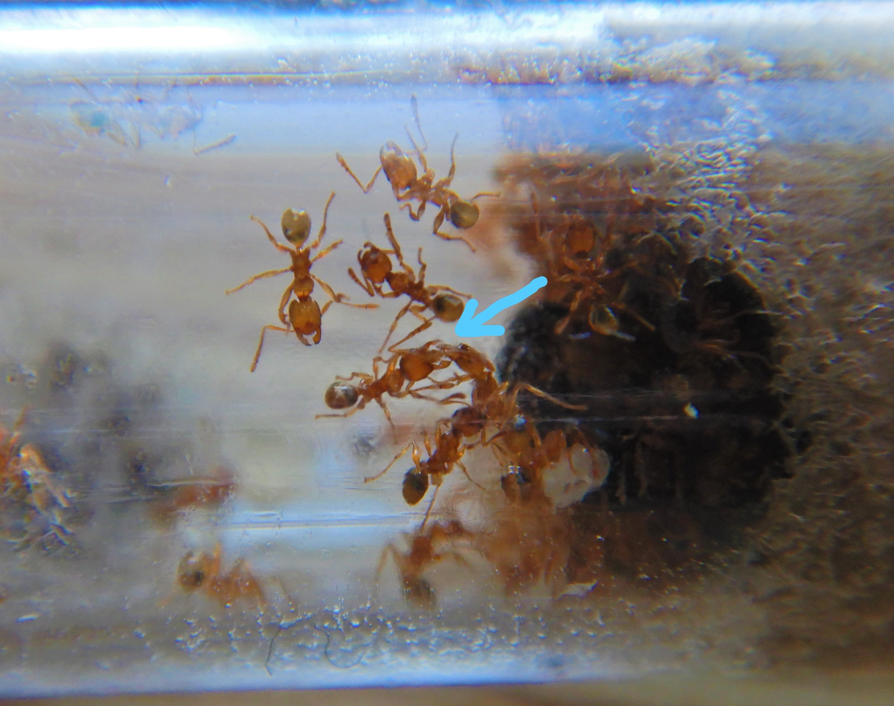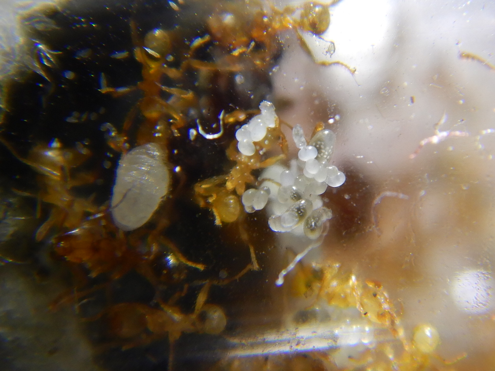 Probówkę z nimi włożyłem od razu na arenę. Kiedy zapoznały się już z nowym miejscem postanowiłem, że nadszedł czas karmienia. Dałem im małą kropelkę miodku, jednak nie były nim zainteresowane. Robotnica dotykała tylko przez chwilę czułkami i na tym się skończyło. Spróbowałem też z mącznikiem - ta sama historia.