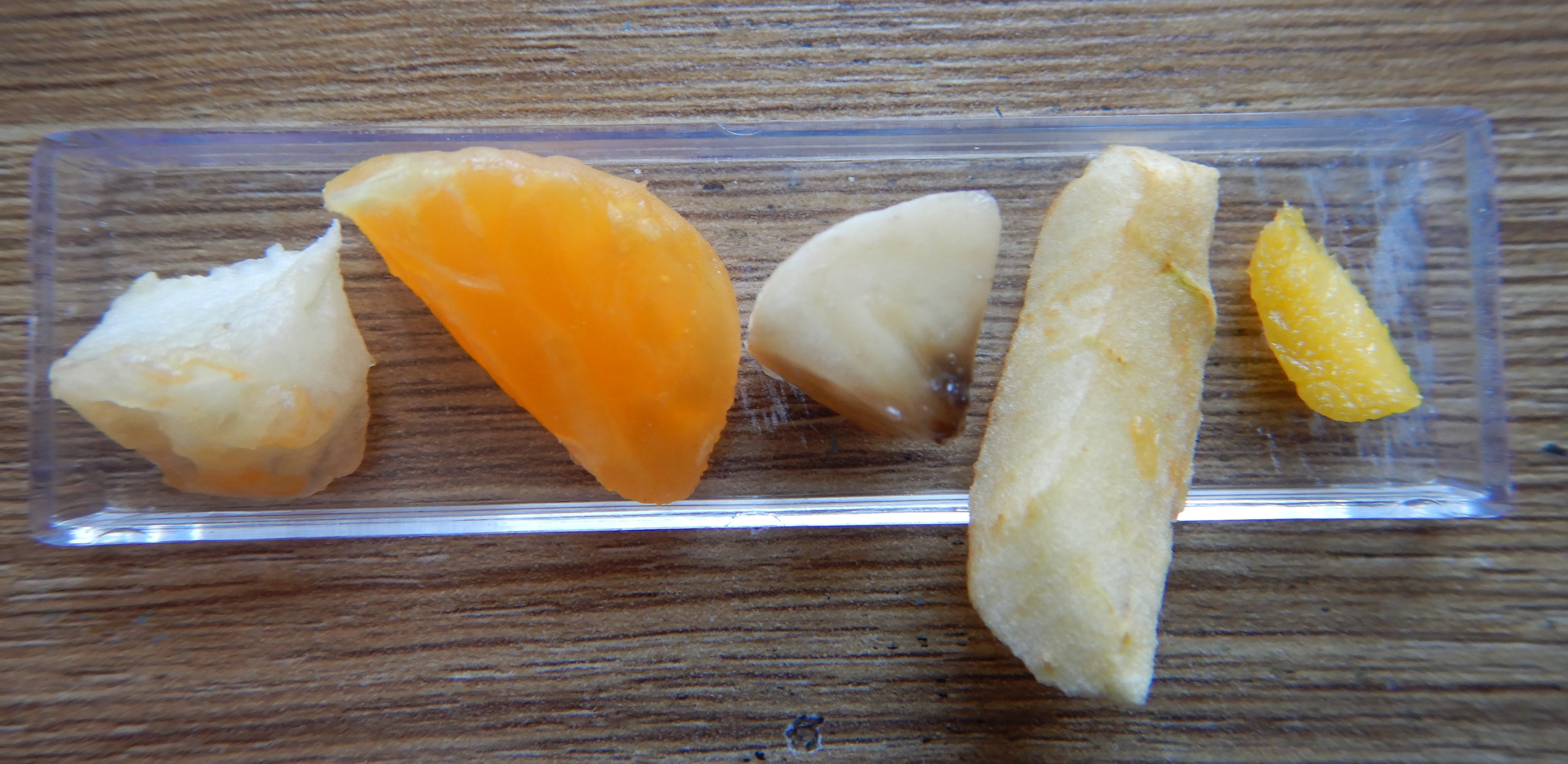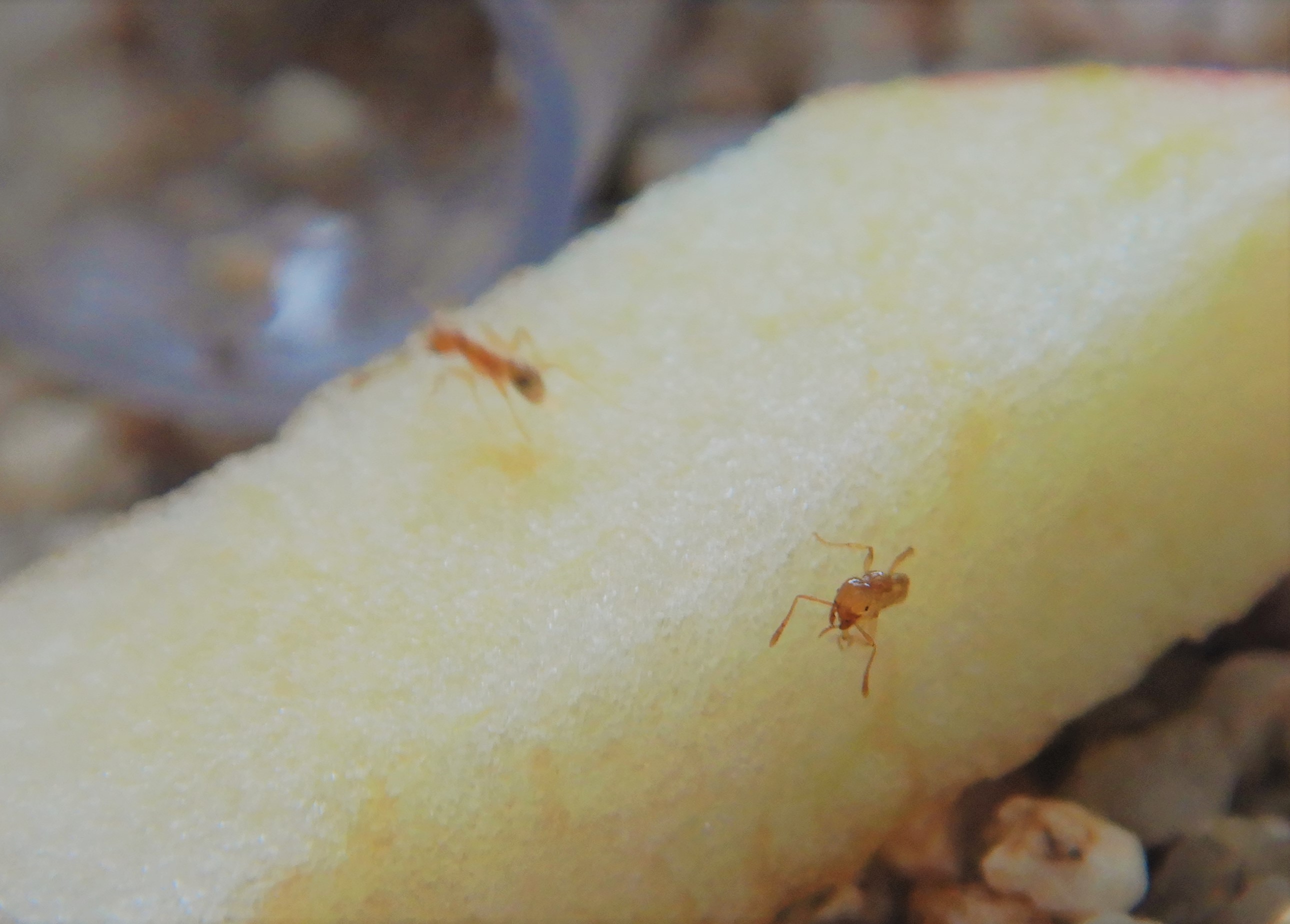 Więc zacząłem eksperymenty żywieniowe. Najpierw zająłem się węglowodanami - na arenkę trafił kawałek jabłka, banana i pomarańczy. Potem przez kolejny dzień kilka zmieniających się co jakiś czas mrówek pożywiało się jabłkiem i wracało aby nakarmić przez trofolaksję resztę kolonii.