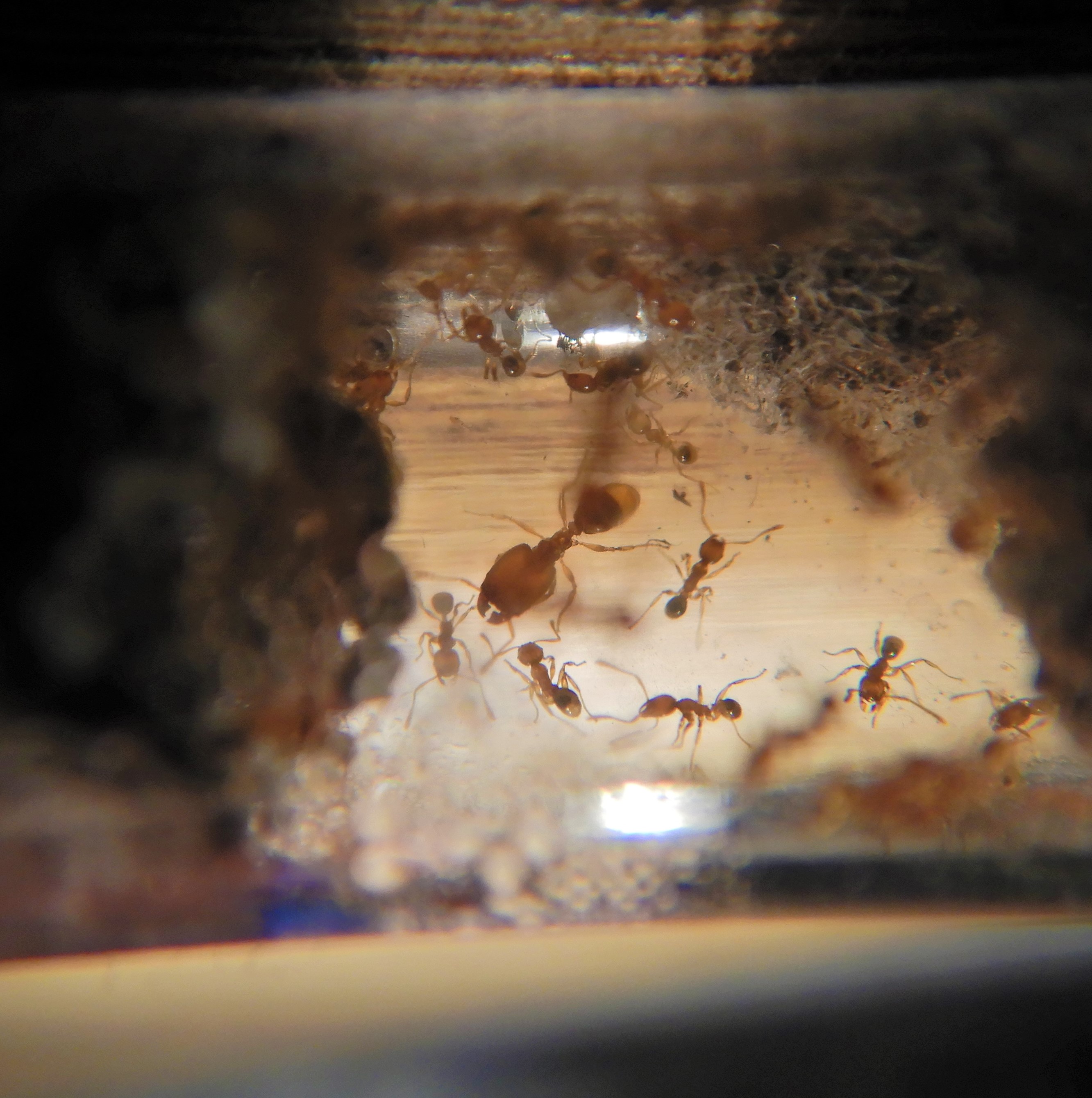 Teraz jestem na etapie przeprowadzania mrówek do nowej probówki, bo w starej jest już naprawdę dużo pleśni. Odłączyłem je od areny i podłączyłem do nowej probówki. Jako że stare mieszkanko było z plastiku to zrobiłem tam gdzie jest woda dziurkę, którą odprowadziłem wodę. Dodatkowo oświetlam je lampką, ale światło nie wydaje się im przeszkadzać