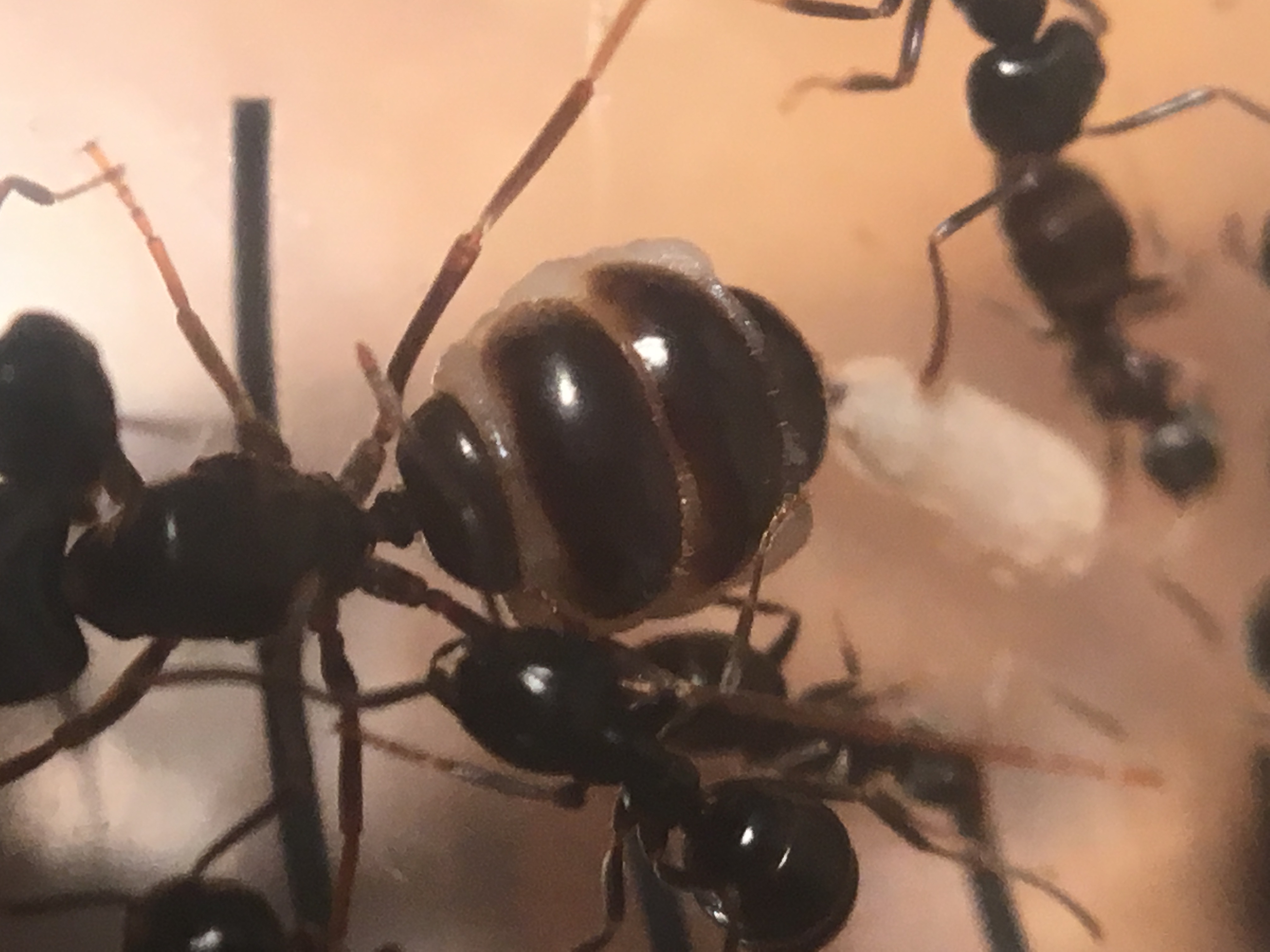 Może to po prostu była fizogastria? Poniżej zdjęcia odwłoku u L. fuliginosus którą miałem, przez tą błonę było widać jaja wewnątrzSzarańcza4227 pisze: czw 21 maja, 2020 zrobiły jej się 2 duże białe plamy na odwłoku a on sam zaczoł wydawać się przeźroczysty na wieszchu,