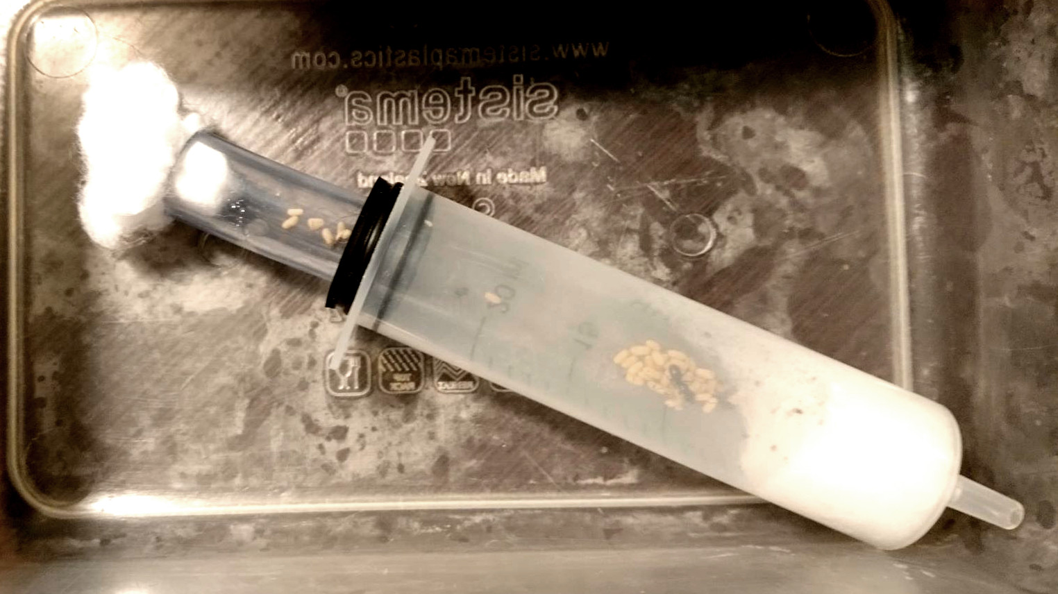 Dzisiaj z samego rana królowa dostała ok 25 kokonów i jedną wybarwioną robotnicę, wcześniej chłodzoną. Cały dzień siedzą razem w lodówce, królowa na większości poczwarek po jednej stronie strzykawki, robotnica z paroma poczwarkami na drugim. Wyciągnęłam je ze trzy razy na 10 minut, jeżeli robotnica zdecydowała się ruszyć z miejsca to wyglądało na to że królowa ją atakuje.