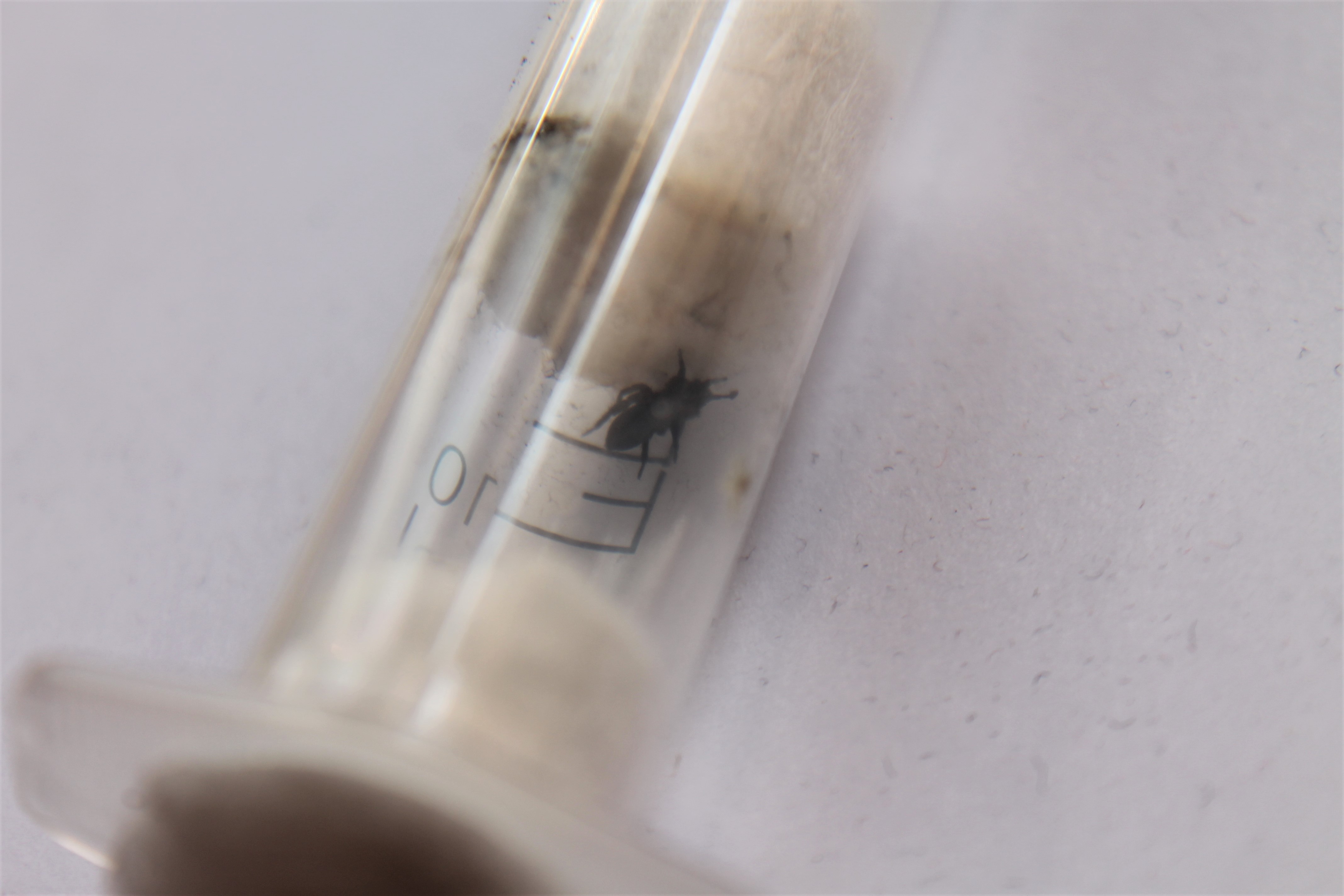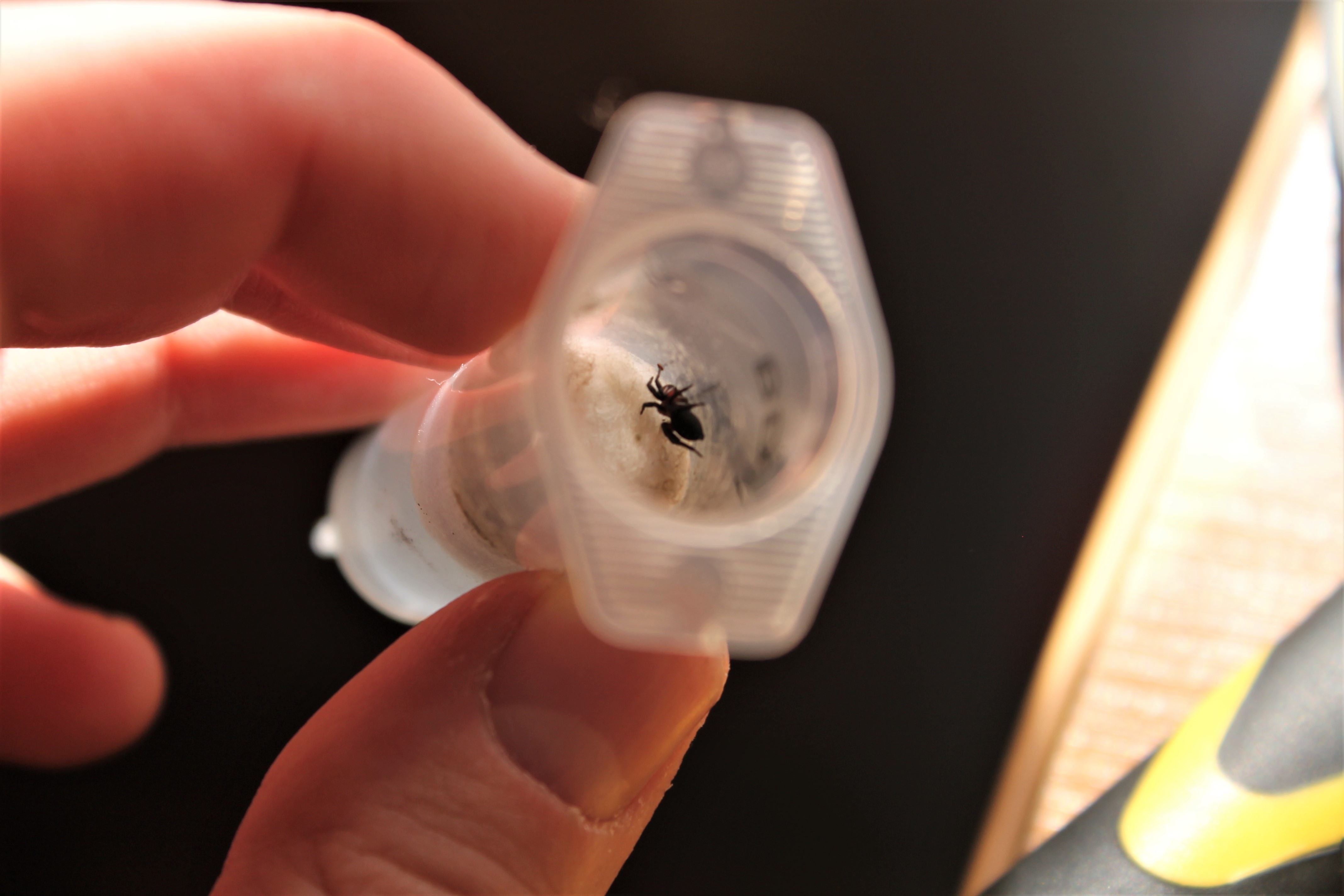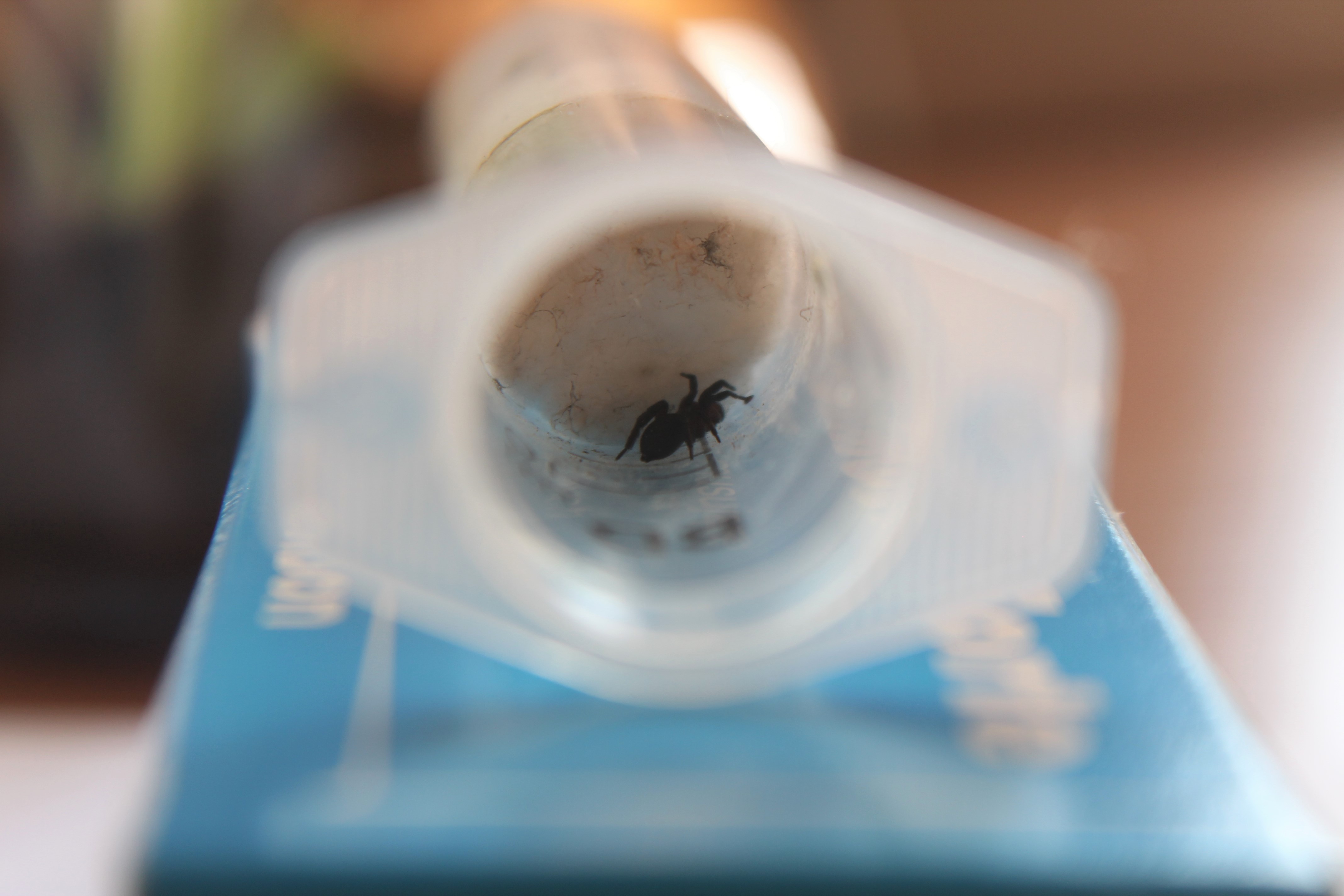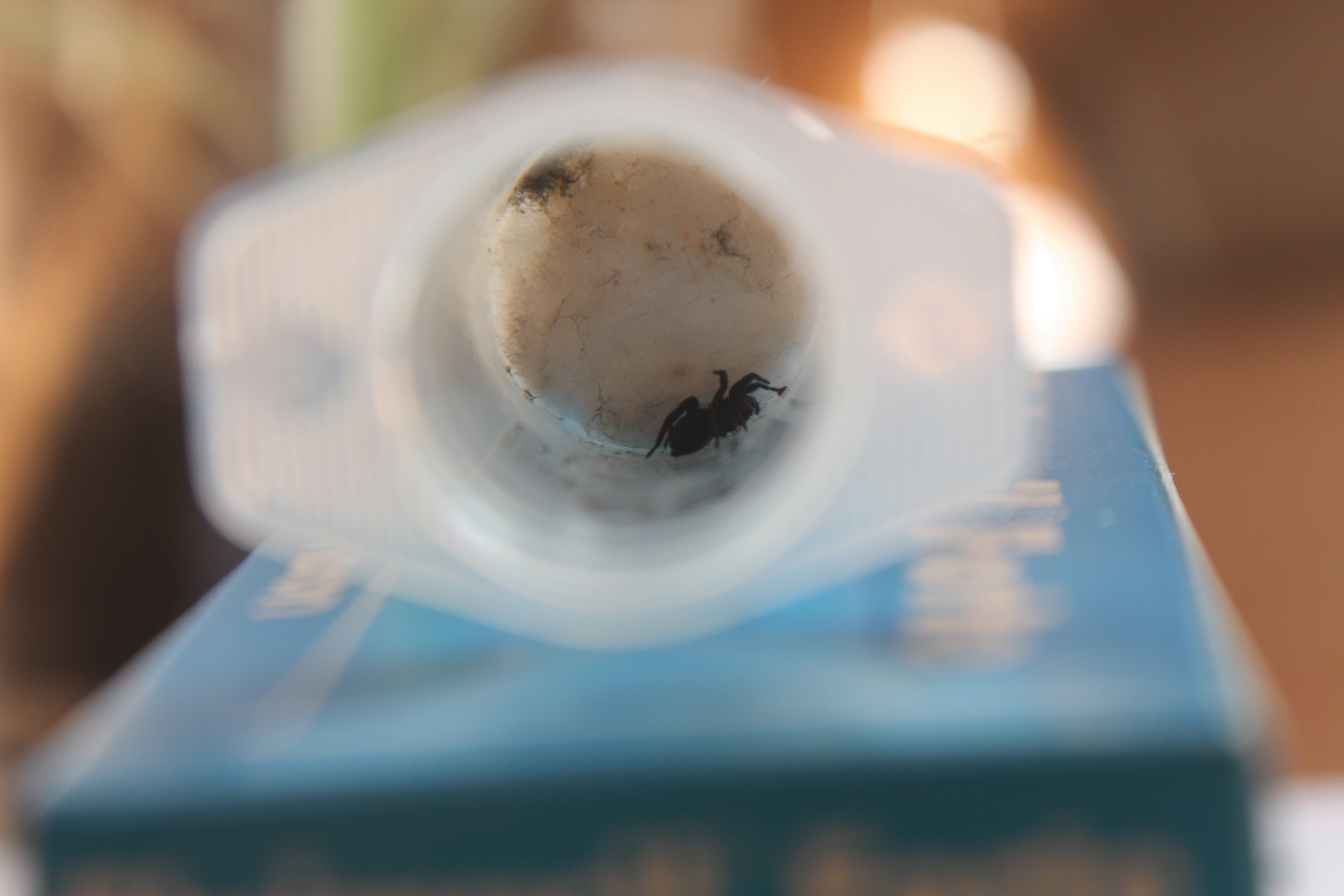 Jak tylko wprowadziłem go do kubeczka to wskoczył do ziemi. Nie miałem pewności czy się przyjmie, czy on w ogóle poluje na muchy. Podrzuciłem mu taką sporą muchę i kilka dni sobie chodziła. Myślałem już żeby ją wyeksmitować, a tu rano patrzę, a mucha leży ma plecach złożona i lekko rusza skrzydłami. Myślę sobie O!, coś tu się dzieje. Po jakimś czasie patrzę, a mucha została wciągnięta nieco pod ziemię.