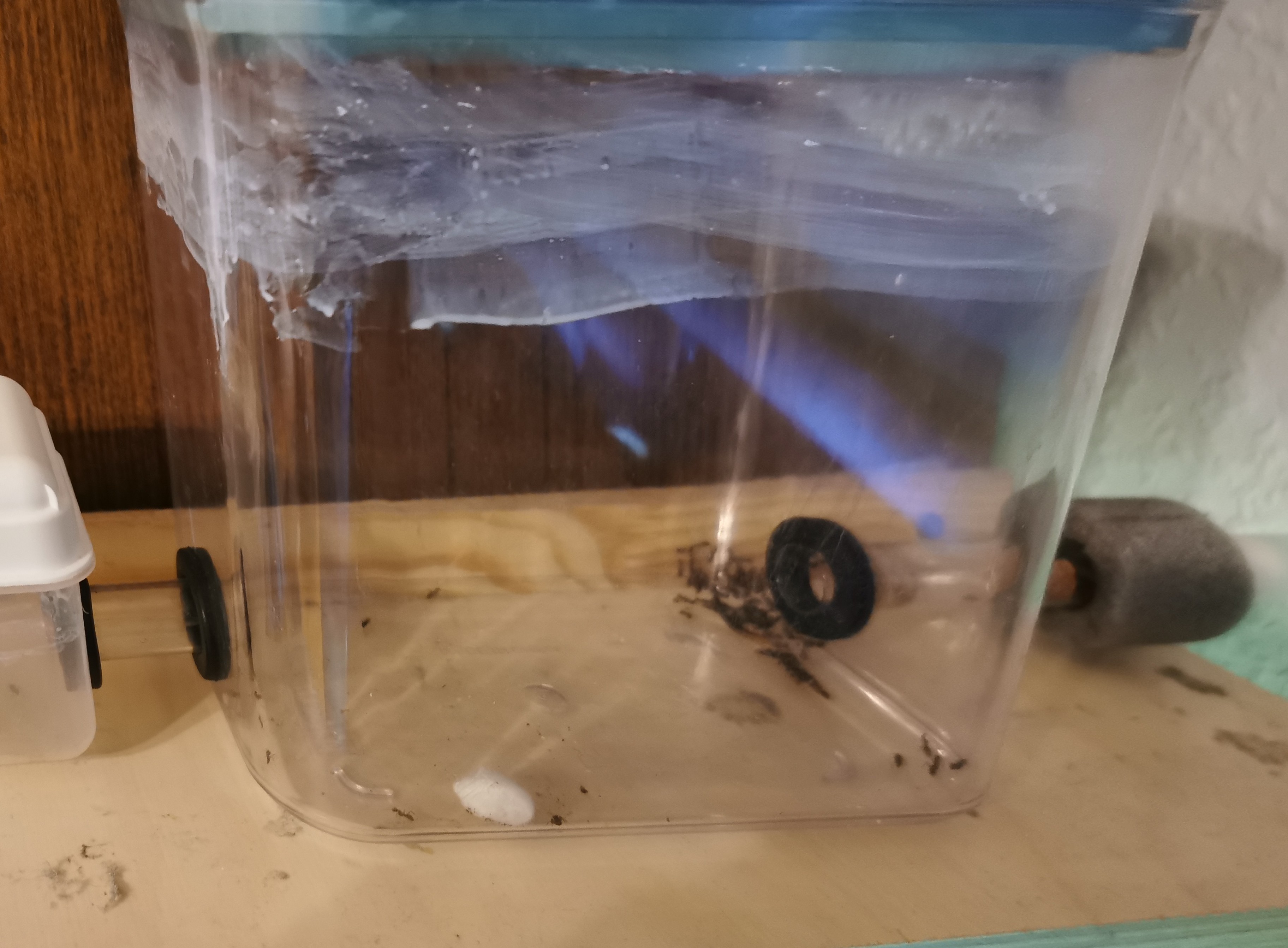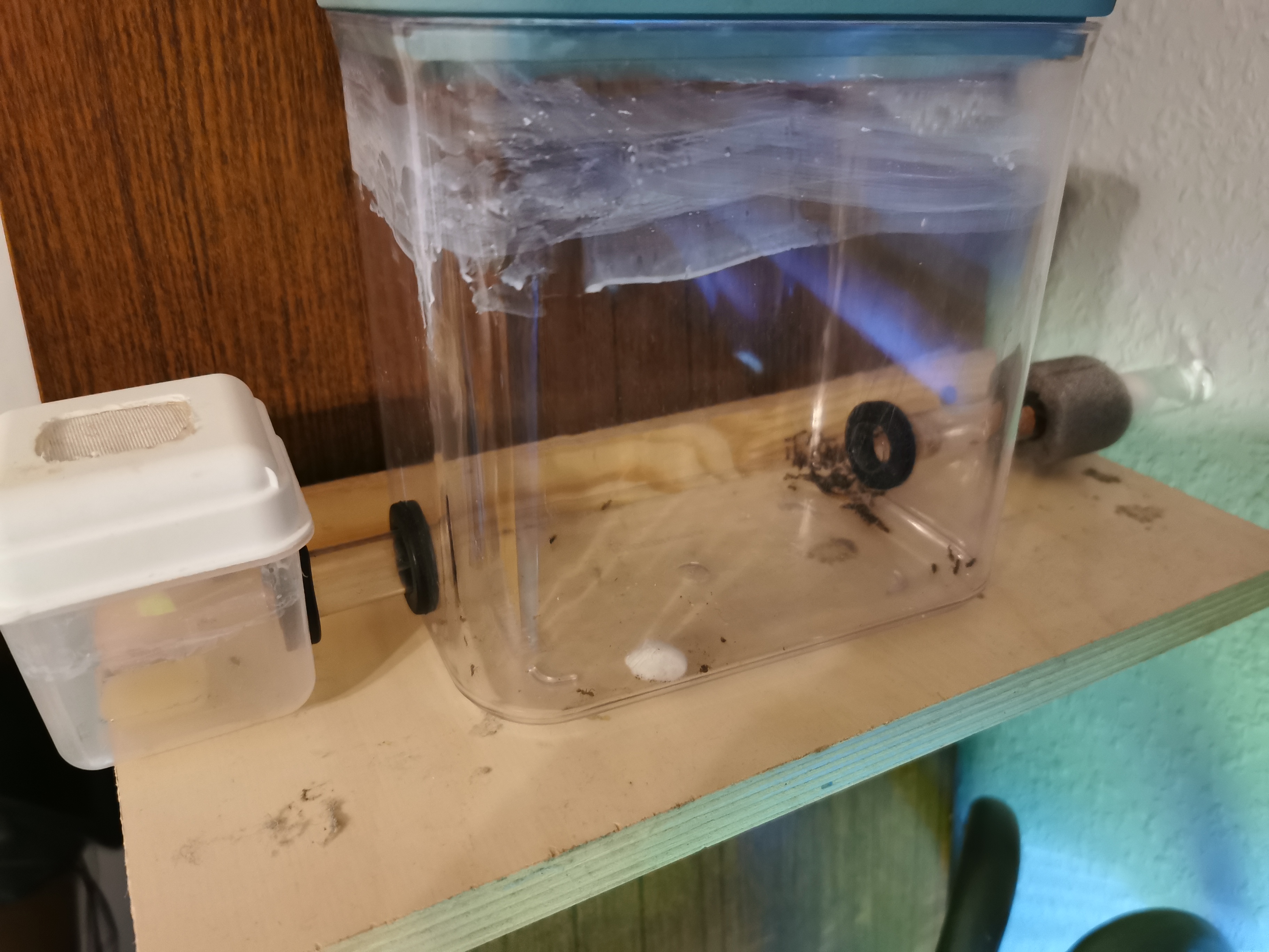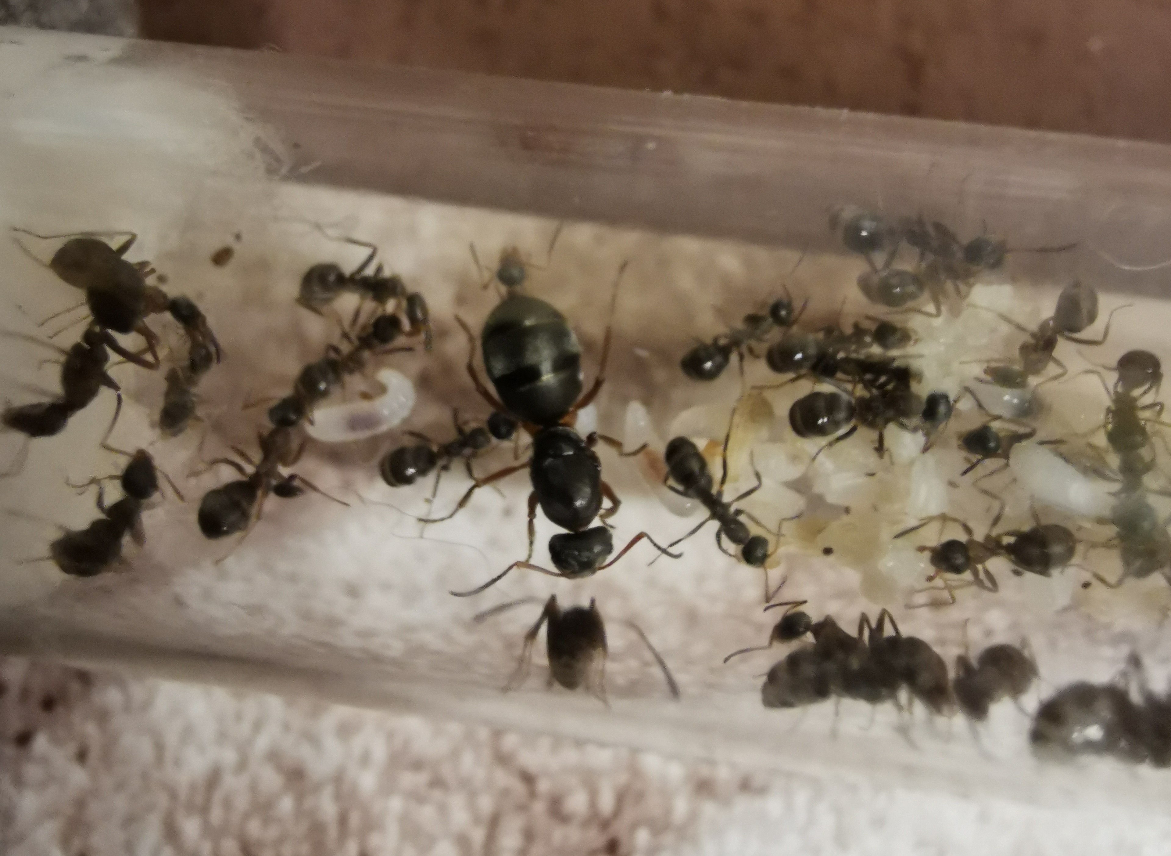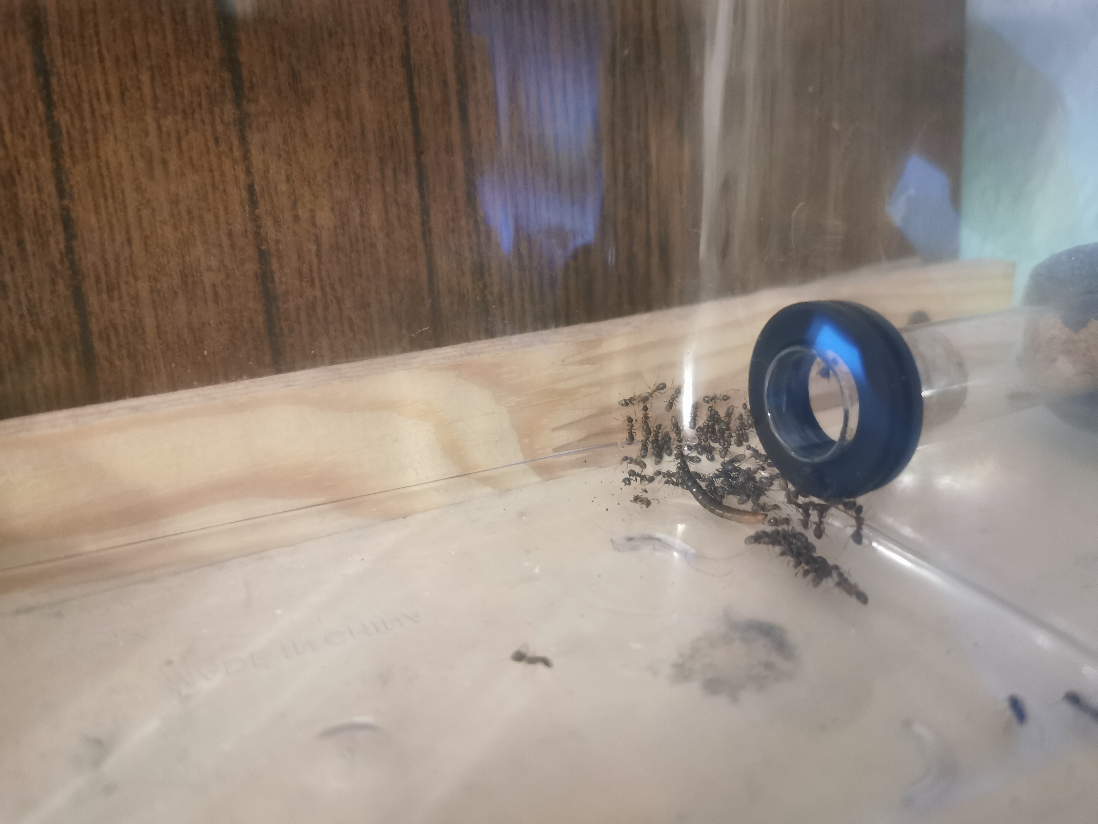 Mam wrażenie że noszą wodę do starego gniazda, bo jej ubywa. Odkleiłem nawet czerwoną folię ze starej probówki, i teraz już dwa tygodnie mieszkają w świetle, zamiast się przenieść do zaciemnionej nowej. Poczekamy zobaczymy.