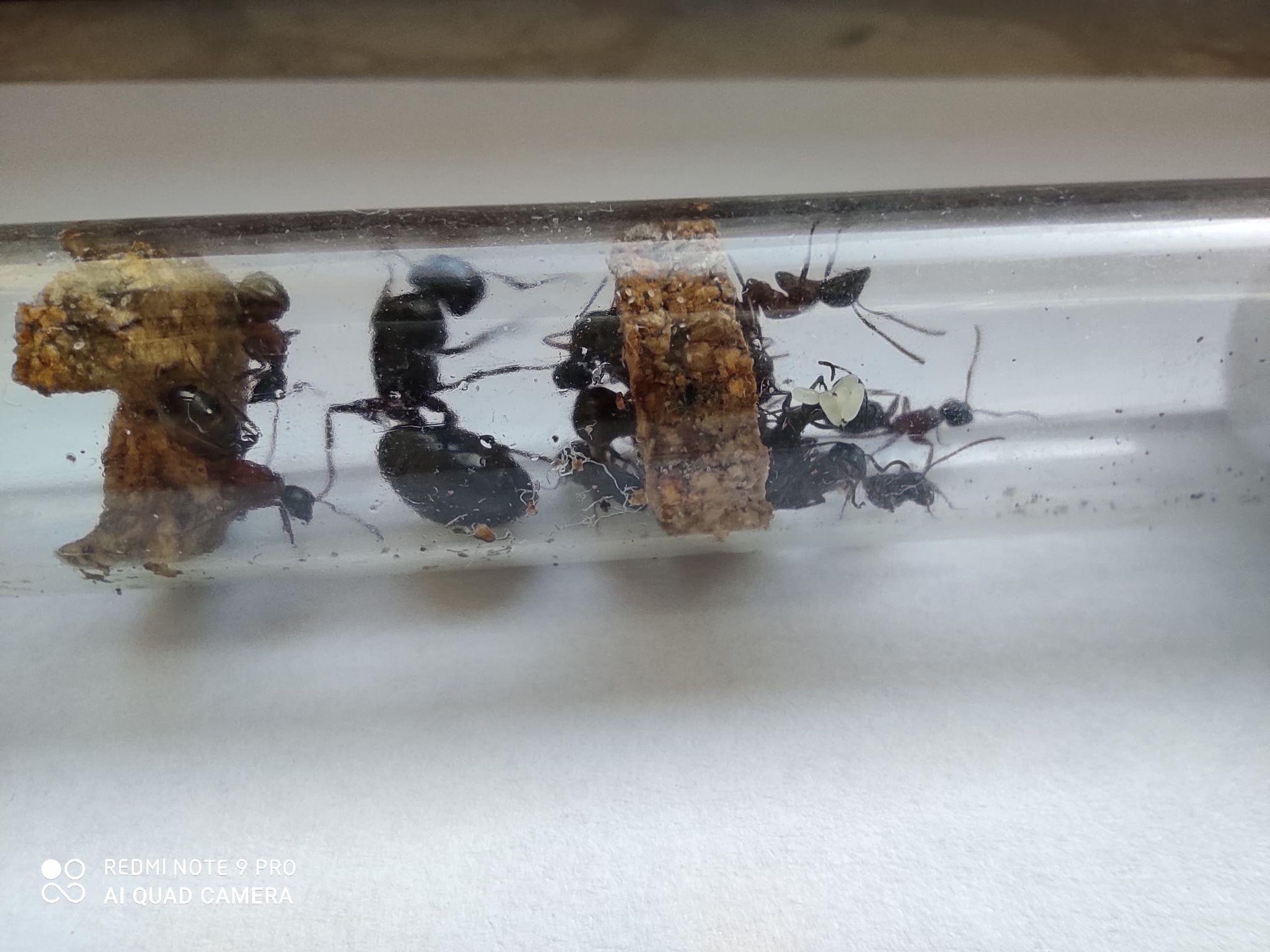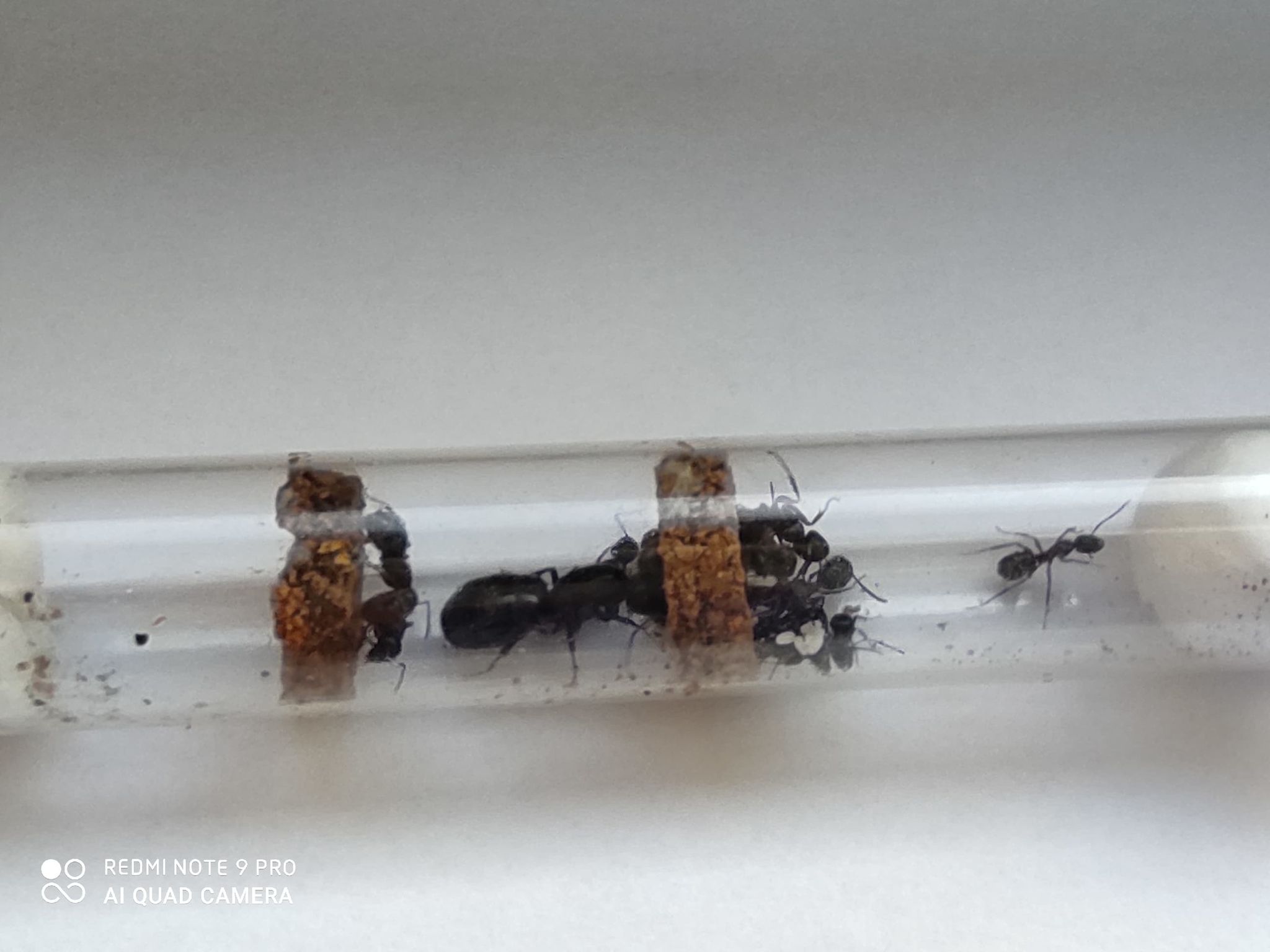 W korku wycięły drugie, mniejsze wyjście i królowa się zaklinowała. Myślałem że wyjdzie ale nie, w dodatku z odwłoka królowej zaczęło coś wyciekać. Po 2-3 godzinach dałem probówkę do lodówki. Zasnęły i rozciągnąłem lekko korek. Kolonia jest w spokoju, jakimś cudem może królowa nie uszkodziła sobie narządów i będzie składać jaja.