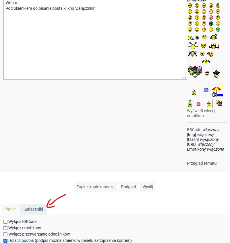 Pod okienkiem do pisania posta kliknij "Załączniki": Następnie "dodaj pliki".