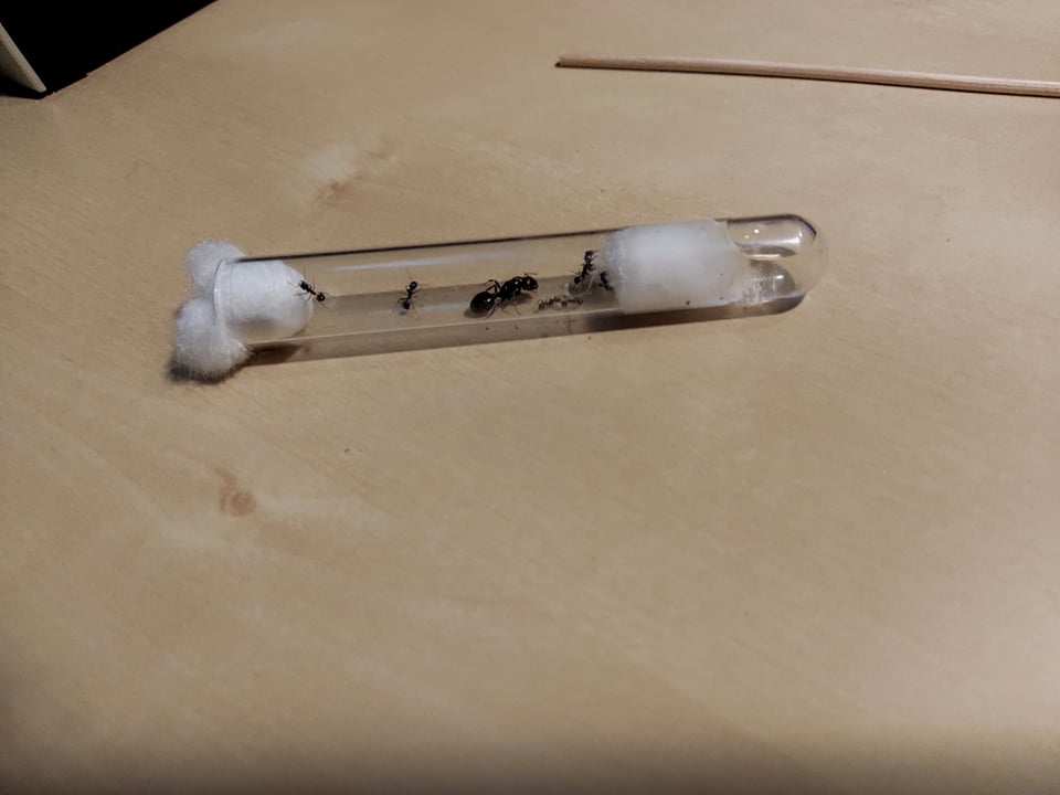 Probówka jest pionowo, nie ma szans żeby do niej weszły... :? Widzę też że na arenie nie ma miejsca by ją położyć. W takim przypadku chyba zostaje jedynie możliwość położenia czegoś mniejszego, np strzykawki zamiast probówki, albo (co wydaje mi się szybsze i pewniejsze) rozkręcenie gniazda i umieszczenie ich w probówce, pytanie czy są jaja (nie mylić z larwami i poczwarkami)?.