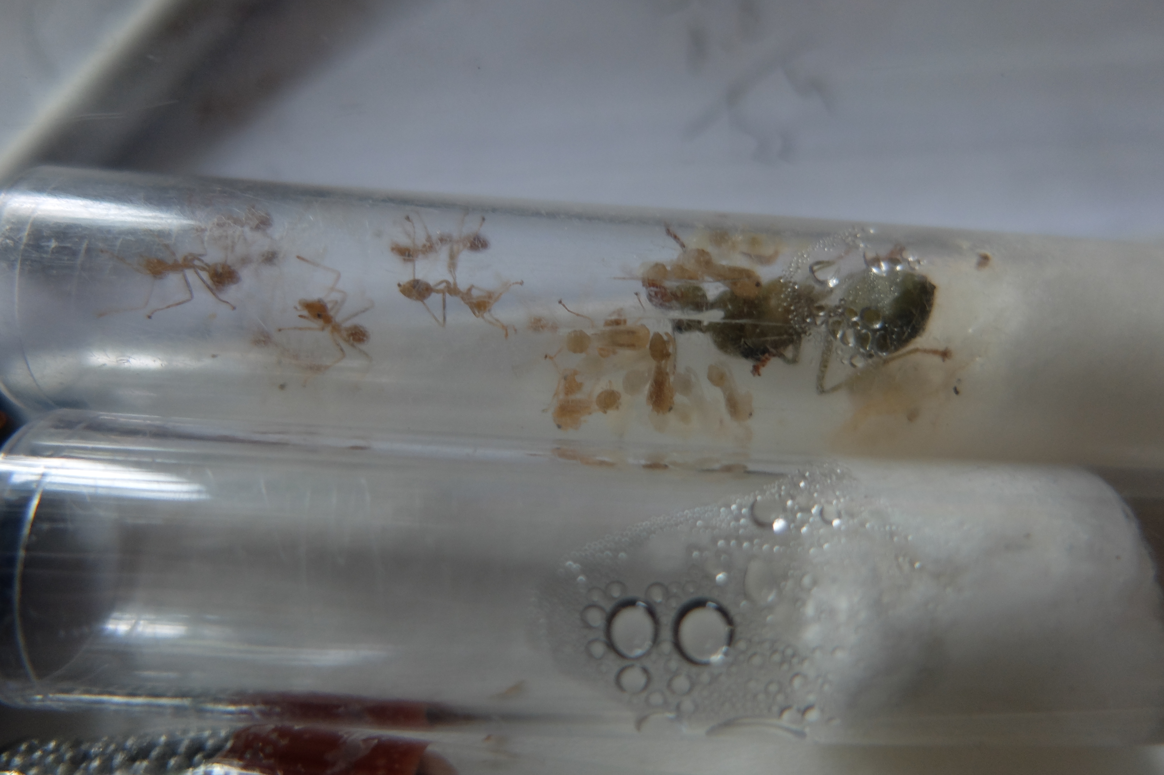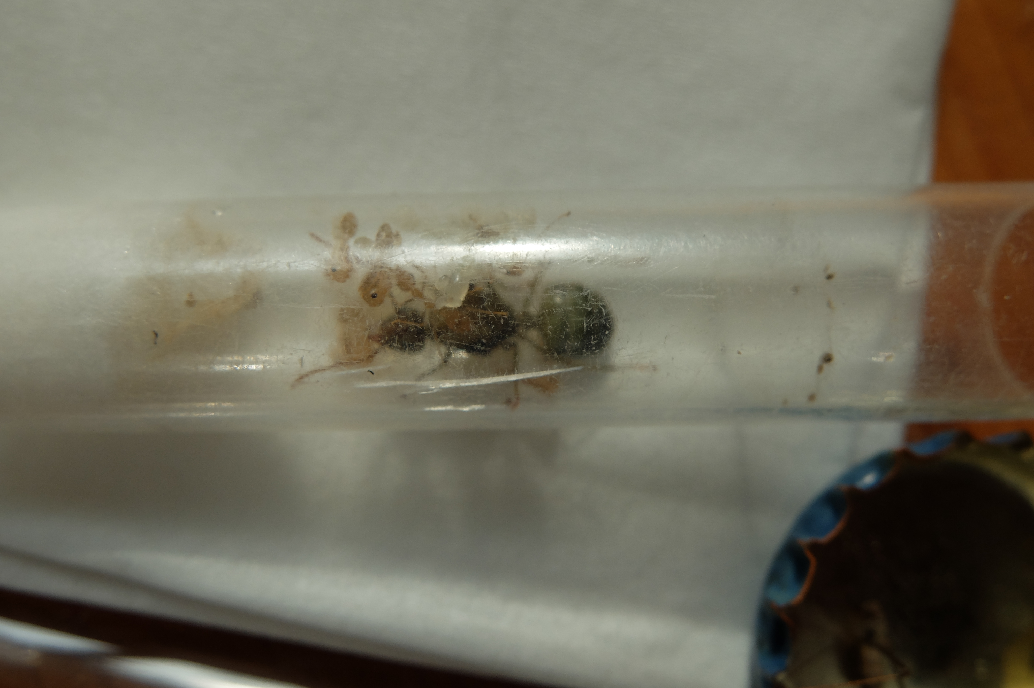 Kolonia wygląda na rozwijającą się. Robotnic <> kilkanaście, jajka i larwy. W dzień całkiem aktywne. Coraz dalej wypuszczają się poza probówkę. Natomiast pojawiło się kilka trupków, co mnie martwi. Ok. 5 W zostało wyniesionych na wieczne furażowanie