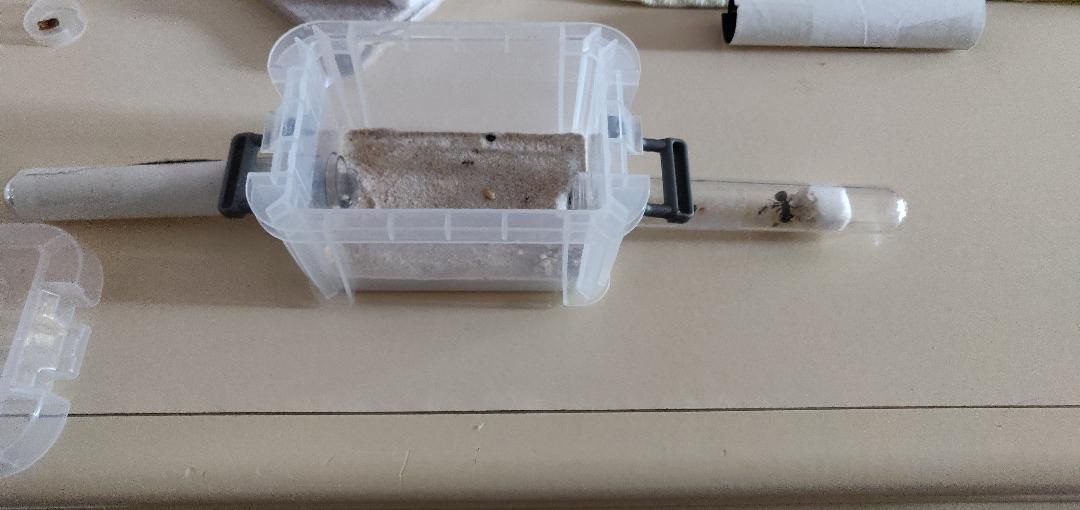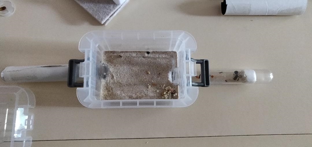 Jakiś tydzień temu postanowiłem dać im mini arenę żeby łatwiej było podawać pokarm. Zrobiłem ją z mini pudełka z pokrywką jak na zdjęciach. Wysiąłem dwa wejścia na probówki i zalałem fugą na około pół centymetra. Dla wizualnego efektu posypałem nieco piasku ale i tak większość odpadła po wyschnięciu fugi. Arena od góry zabezpieczona fluonem a w pokrywce otworki wentylacyjne.