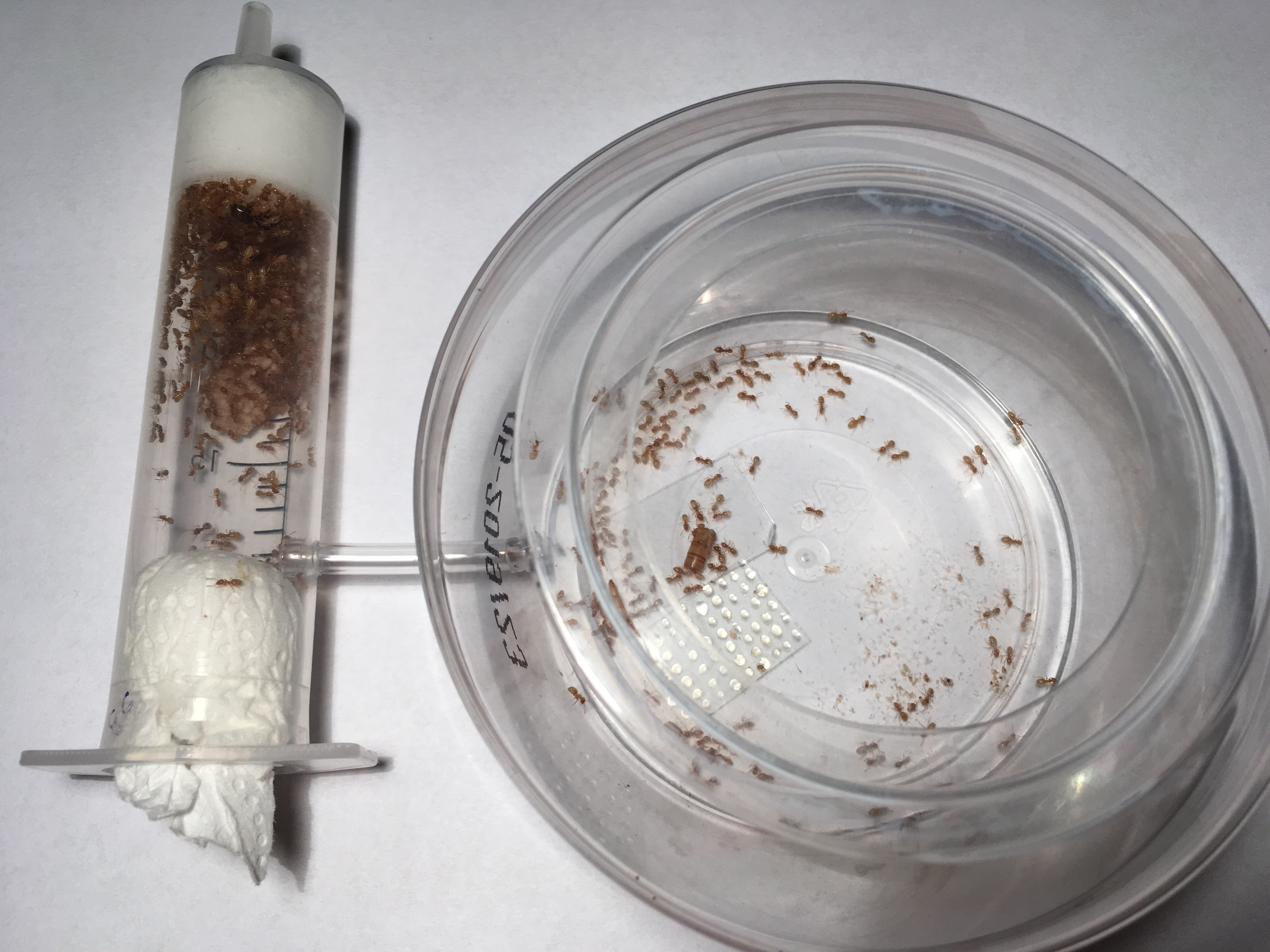 Próbówka jest niestety zbyt mała aby móc w niej wydzielić komory więc na dzień dzisiejszy nic nie zmieniam. Przeprowadzę je do formikarium jak będzie ich więcej albo w próbówce pojawi się deficyt wody, albo pojawią się trudności w karmieniu kolonii.