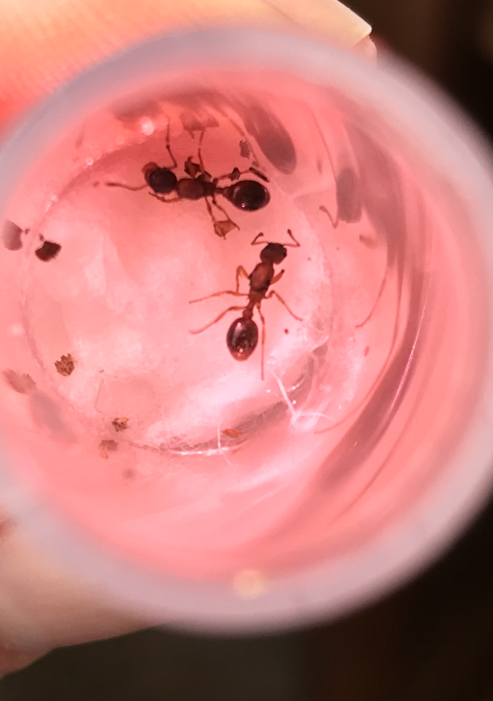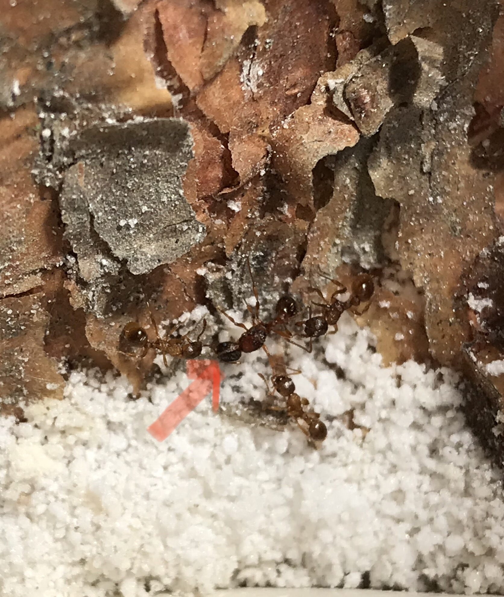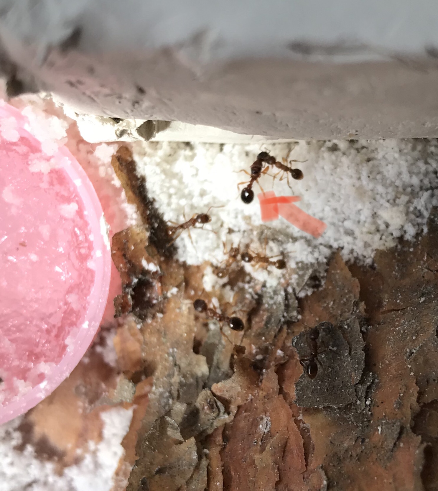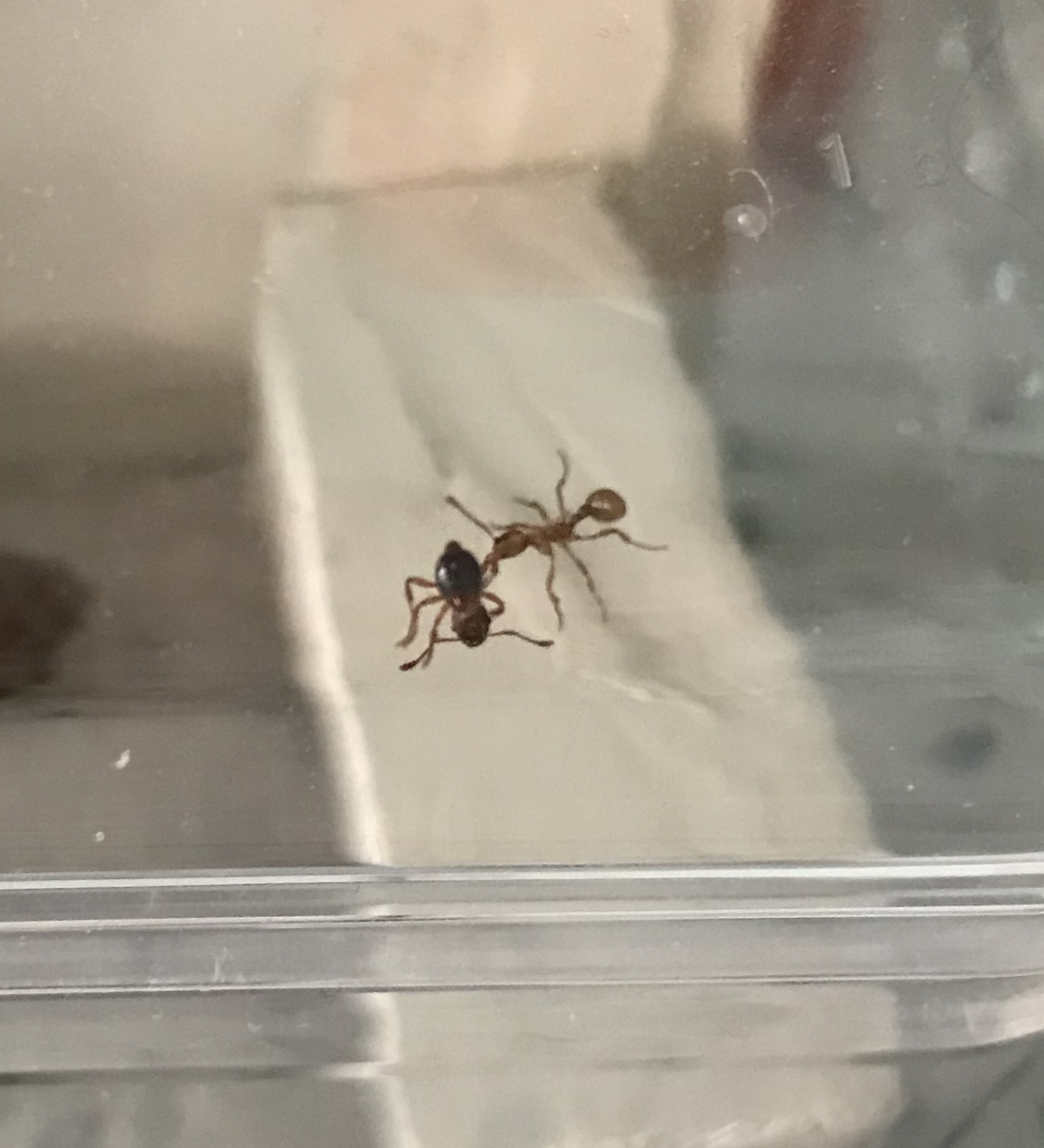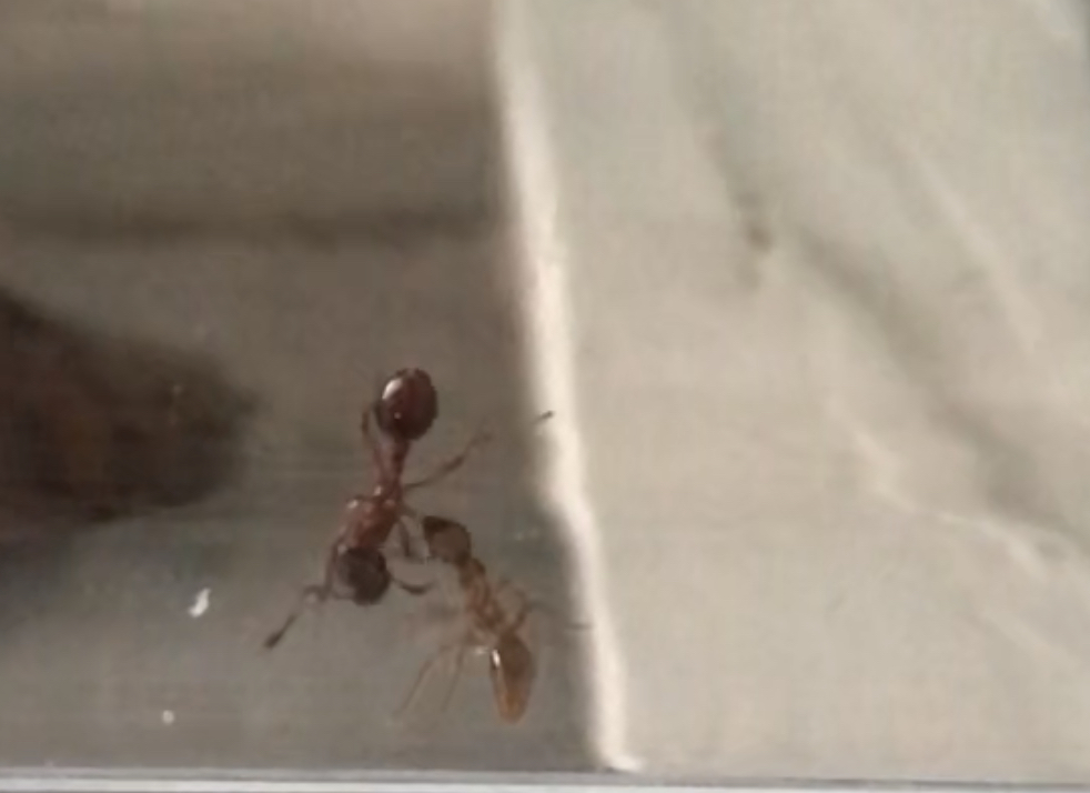 Witam wszystkich 🙂 mam mała kolonie myrmica rubra. Wczoraj rano moja córka znalazła w piaskownicy „dużą mrówkę”, która wyglądała jak te z mojej kolonii. Postanowiłyśmy sprawdzić, jak zachowa się reszta po włożeniu jej na arenę. Co ciekawe - nowa została z każdej strony sprawdzona, obejrzana i spróbowana - teraz jedna z moich mrówek nosi ja po całym formikarium. Tamta nowa, puszczona wolno - chodzi normalnie, nie brakuje jej żadnej części ciała ale ta moja mrówka nie odstępuje jej na krok. Nosi ja ciagle, ciągnie czasem w różne strony, „prowadzi” tam gdzie chce. Czasem w kilka gdzieś ja wciągają. Inne właściwie ja ignorują, zajmuje się nią głównie ta jedna. Nie mam 100% pewności ze to ten sam gatunek, podejrzewam ze może być, bo wyglada jak te moje większe (chociaż sama nie wiem już) chociaż nie widzę gołym okiem aż takich dużych różnic, a zrobić wyraźne zdjęcie to wyzwanie...u nas w ogrodzie ani przy domu nie widziałam żadnej podobnej nigdy, same nigerki..chyba mogę ja zostawić tam, bo juz ponad 24h daje sobie radę, nie walczą i przeszła a raczej została przeniesiona bez problemu przez rurkę z jajami i larwami (bo za cholerę nie chcą się przenieść nigdzie indziej) jak mi się uda, wrzucę filmik, bo narazie nie chce się załadować, zostają tylko średniej jakości foty. Co sądzicie? Jakieś podpowiedzi?
