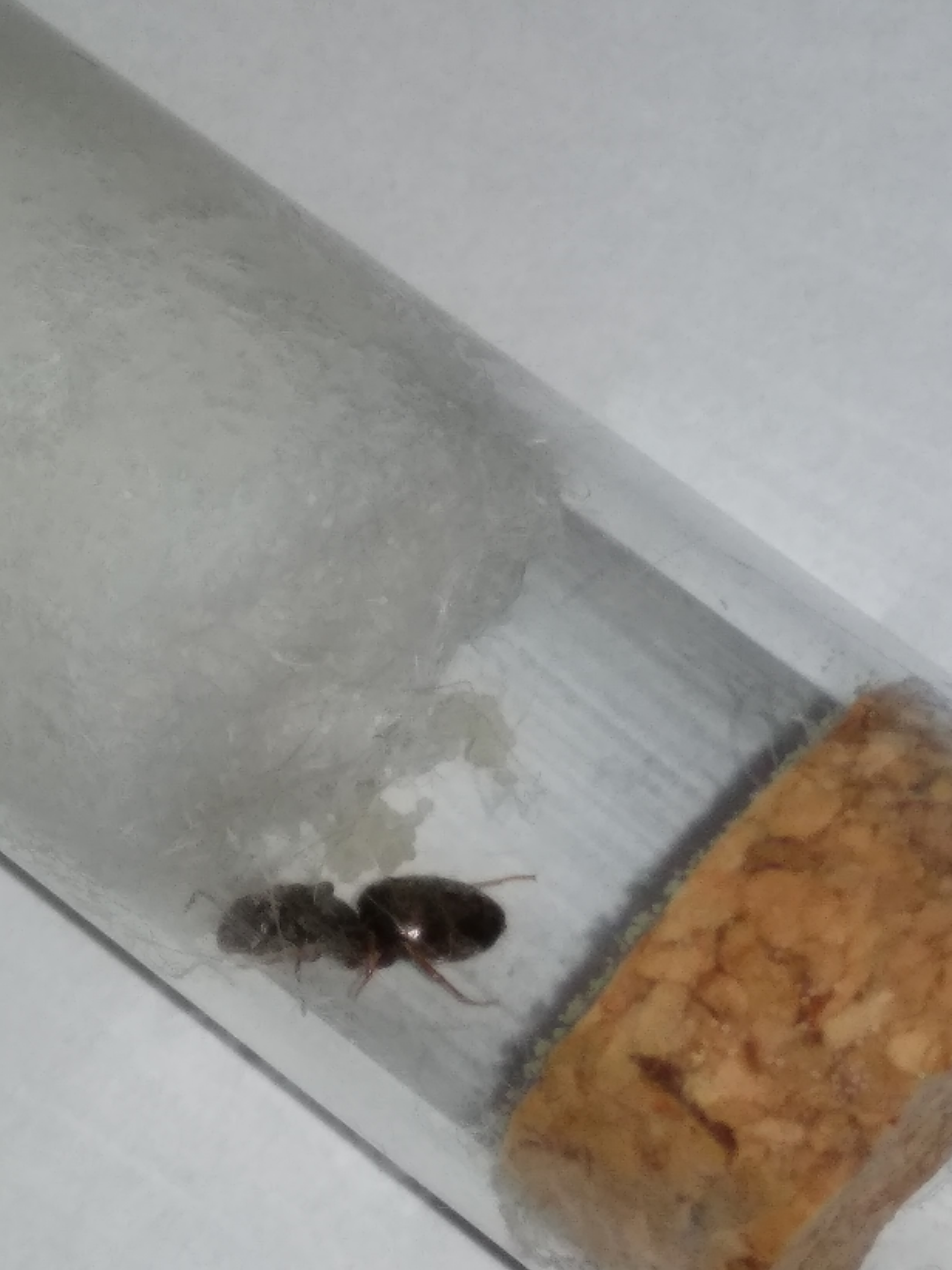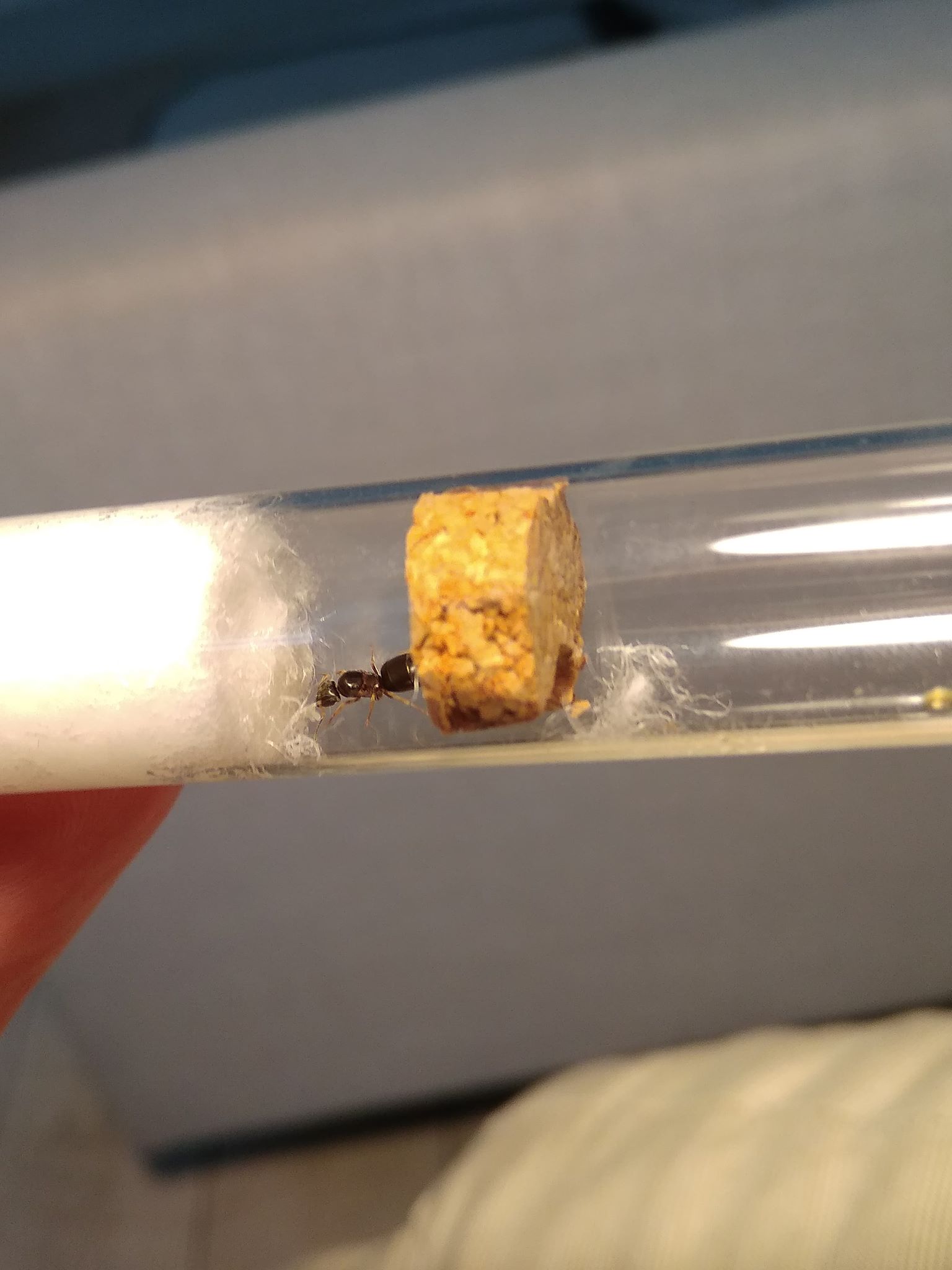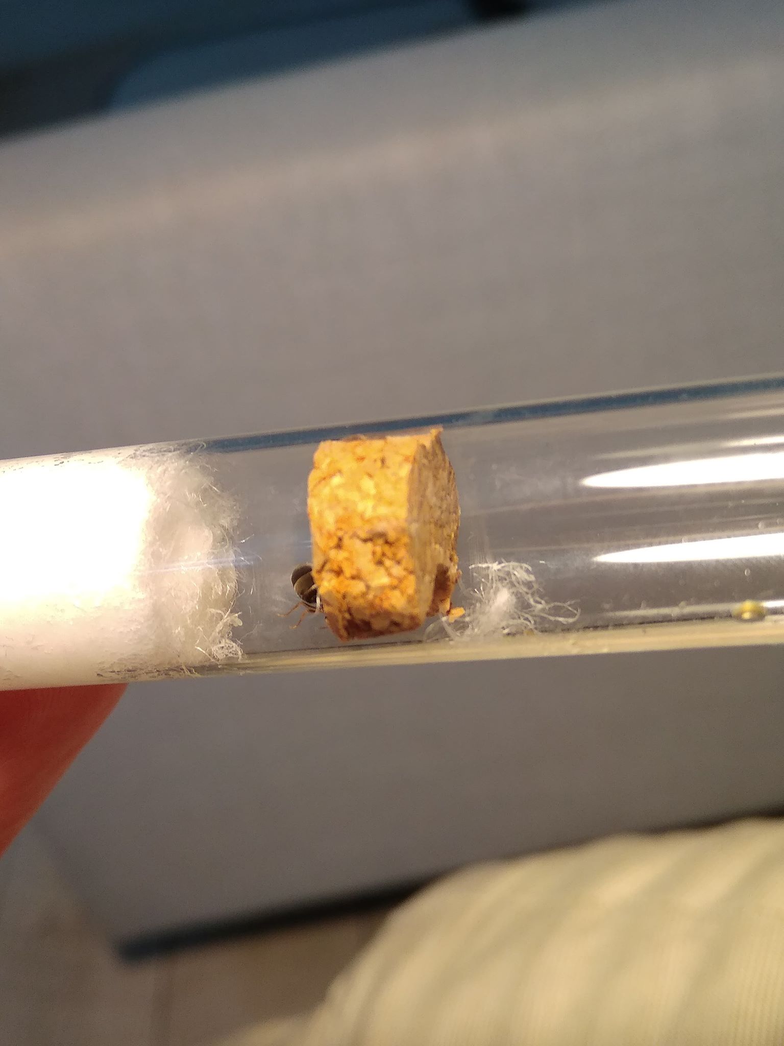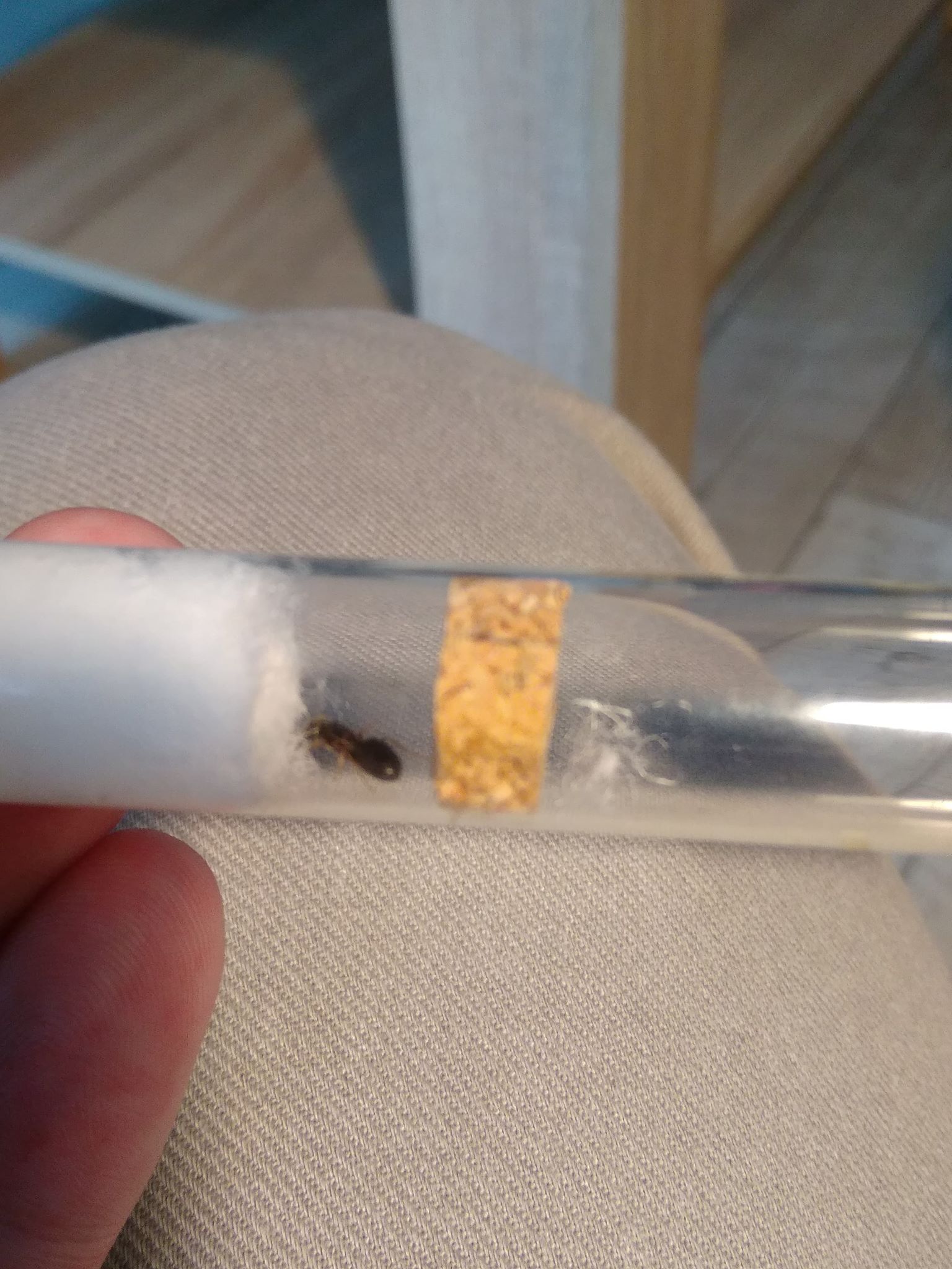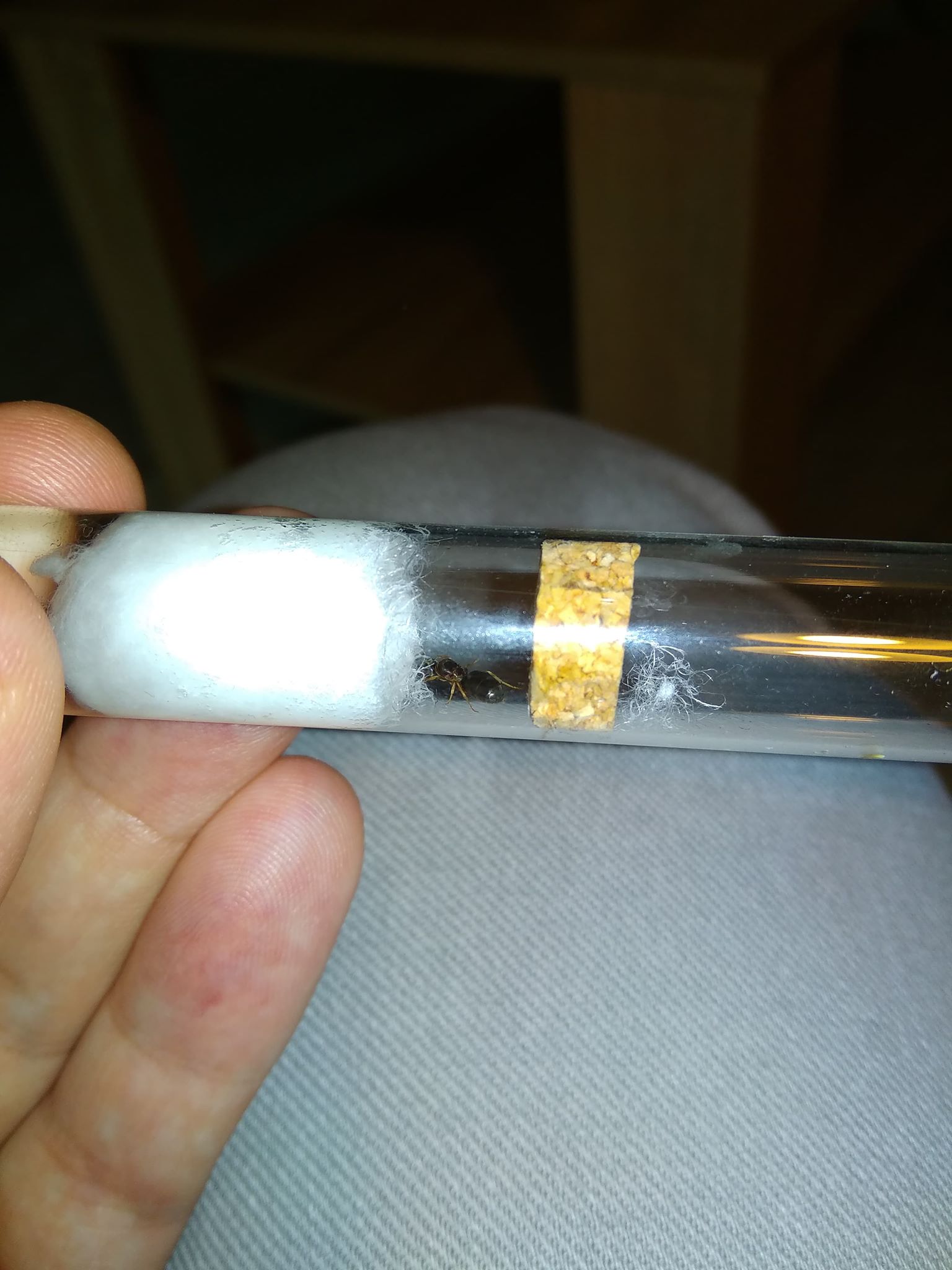 14 czerwca - złapałem swoją pierwszą w życiu królową. Idąc wraz z żoną chodnikiem, ta druga (której kazałem patrzyć pod nogi) zauważyła wielką mrówkę, która gnała jak strzała przed siebie. Wielkość 08-0.9 mm. Złapałem ją do wcześniej w tym celu przygotowanej strzykawki z dwóch stron zaślepionej watą. Po przyniesieniu do domu, zrobieniu zdjęć w celu identyfikacji gatunku, przeniosłem królową do first stepa (startera) zrobionego ze szklanej probówki. Przenosiny były banalne proste, bo królowa biegała w tę i z powrotem. W probówce zrobiłem komorę za pomocą korka. Królowa po pierwszym szale schowała się w przejściu pod korkiem i tam siedziała przez dobą po czym przeniosła się na korek od strony wilgotnej waty. Do probówki dałem kroplę miodu, która niemal błyskawicznie zainteresowała moją królową.