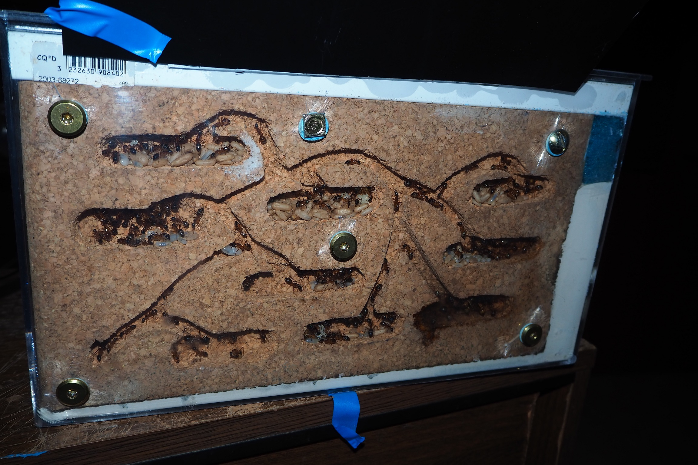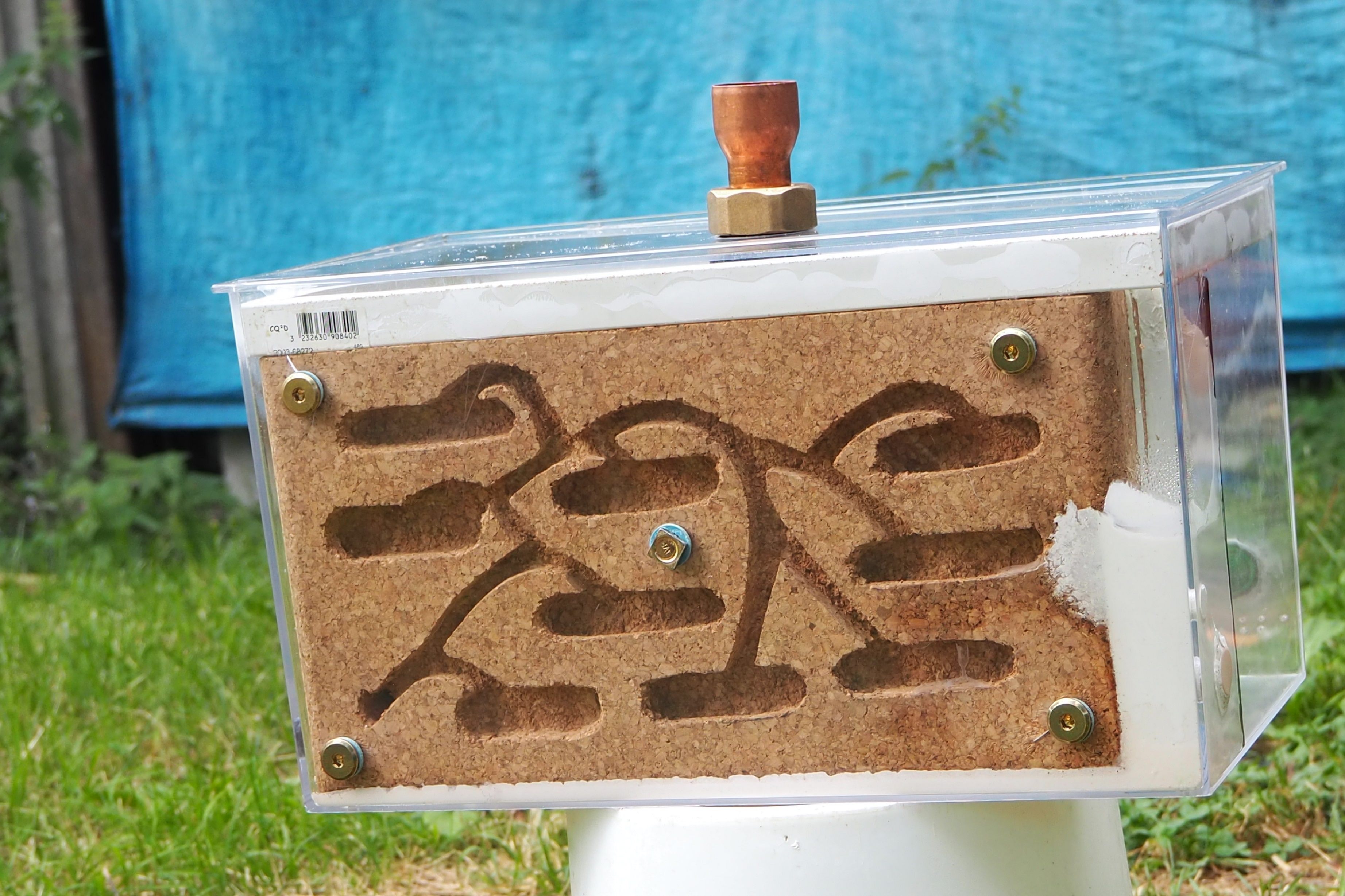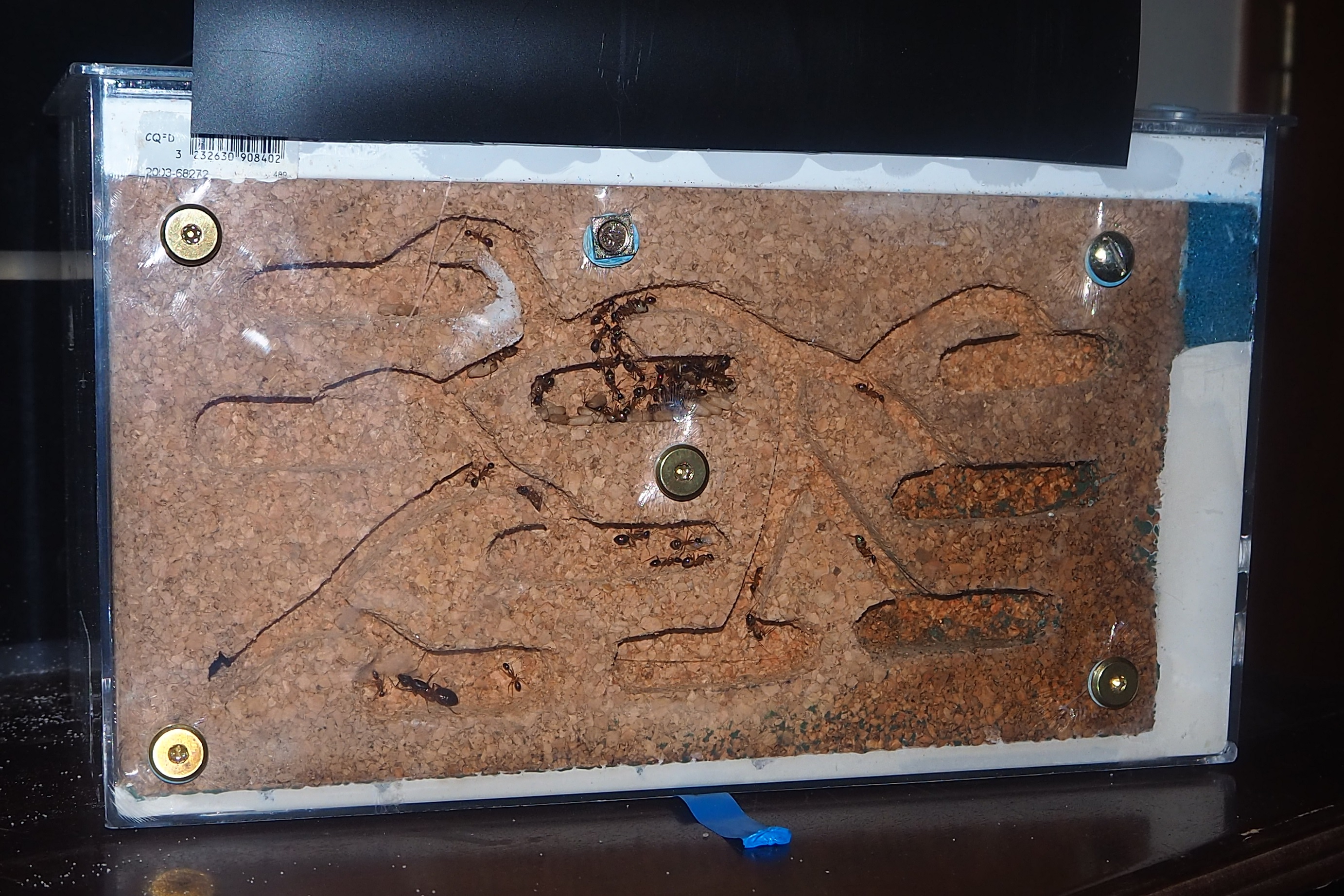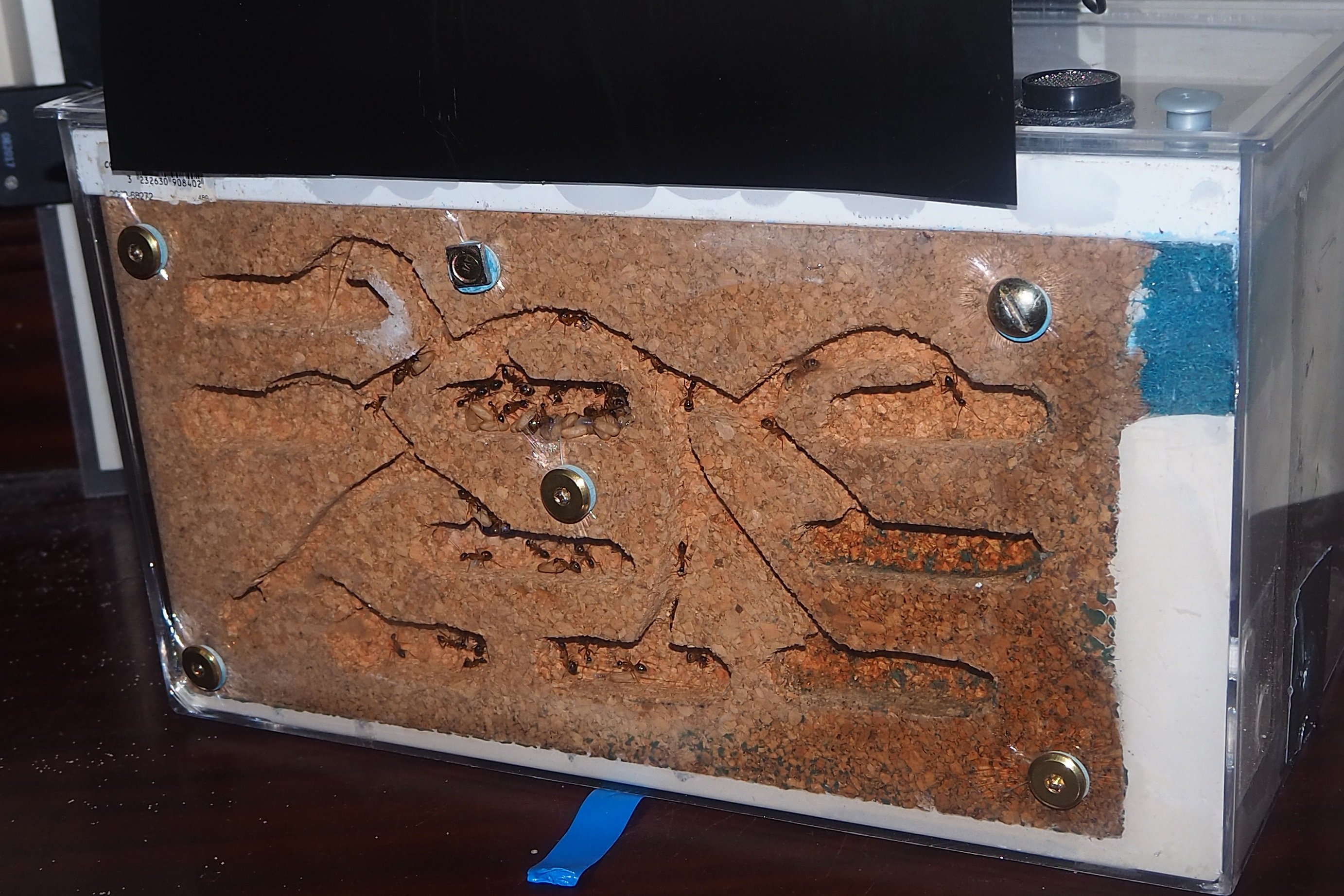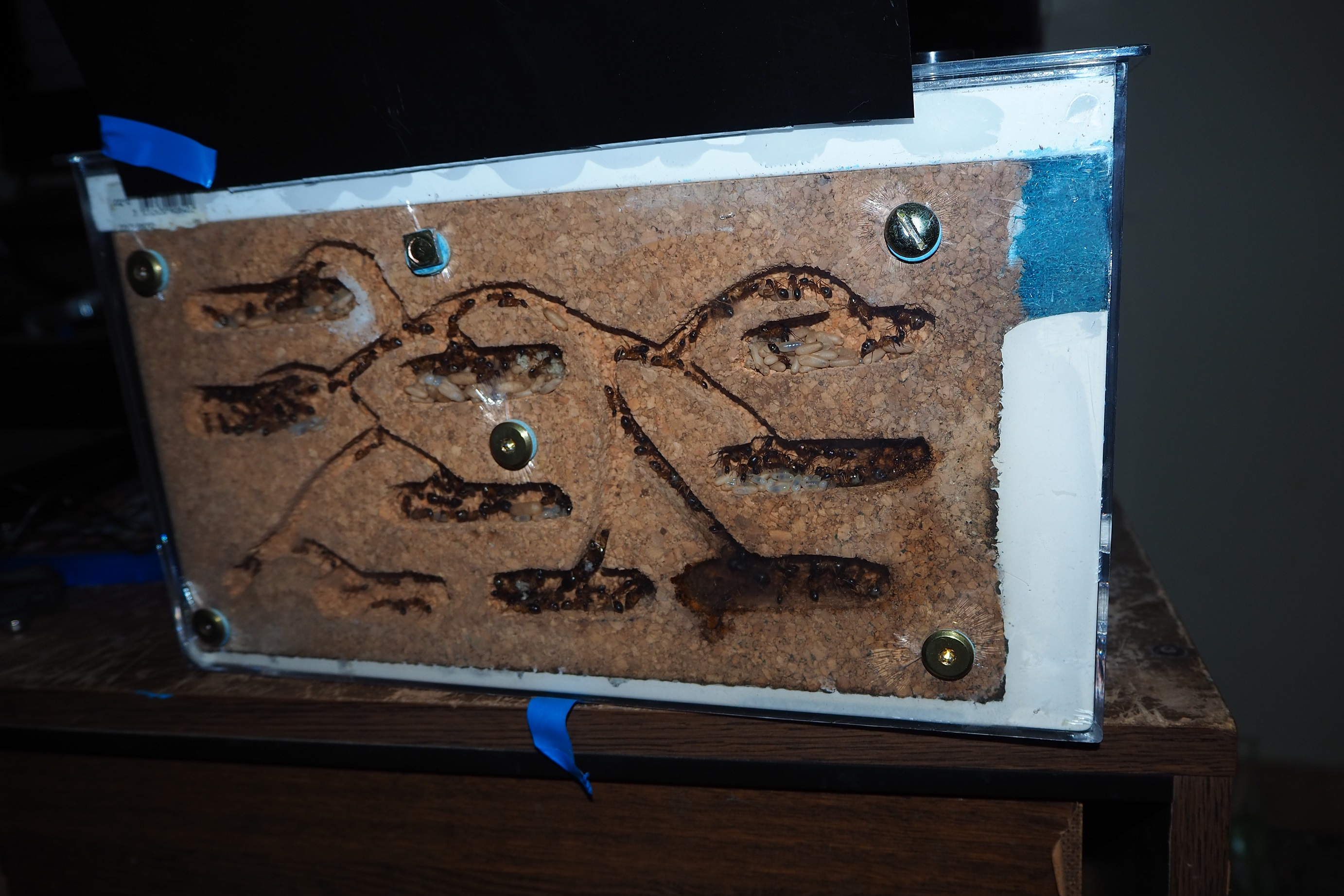 Nie myślałeś aby w korku takich rozmiarów zamiast wycinać tyle komór to zrobić tylko jedną? Królowa wraz z kilkoma robotnicami siedzi w tej komorze, a wraz z rozrostem kolonii mógł byś obserwować zmiany w gnieździe polegające na tym że kolonia sama sobie poszerza gniazdo wedle własnych upodobań.Mnie osobiście podobają się najbardziej gniazda ziemne.