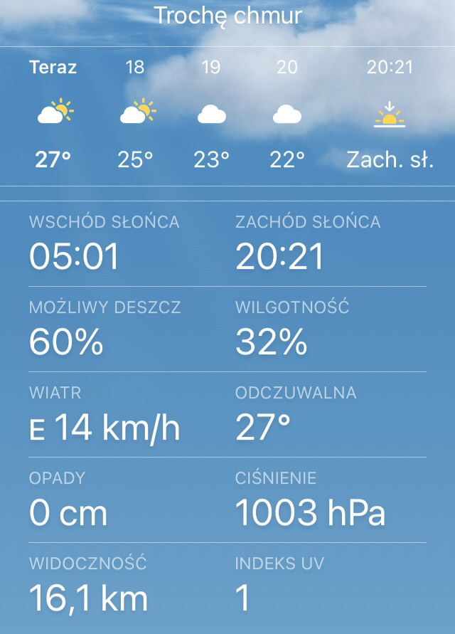 26 stopni, pochmurno ze słońcem, wilgotność 31%, 1007hpa, indeks uv 1, widoczność 16,1km, wiatr 18km/h ssw, możliwy deszcz 20%.