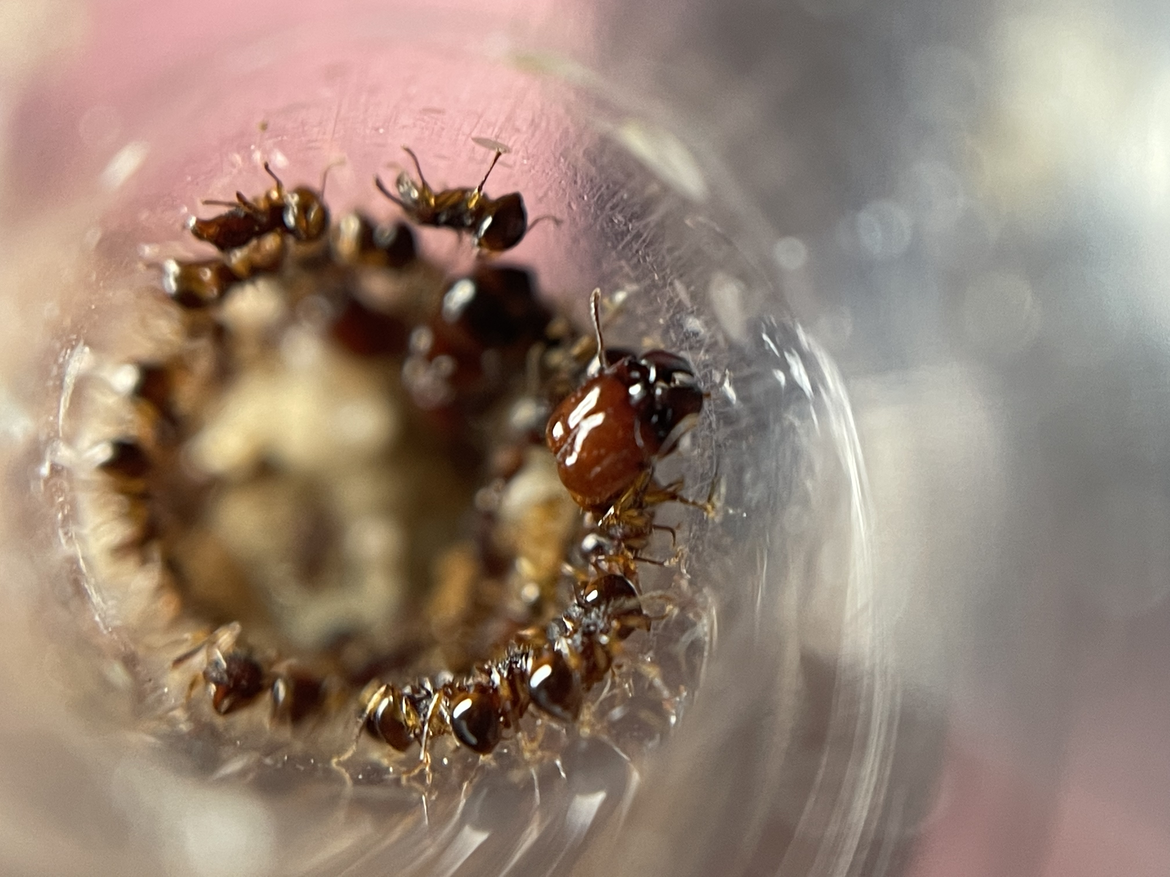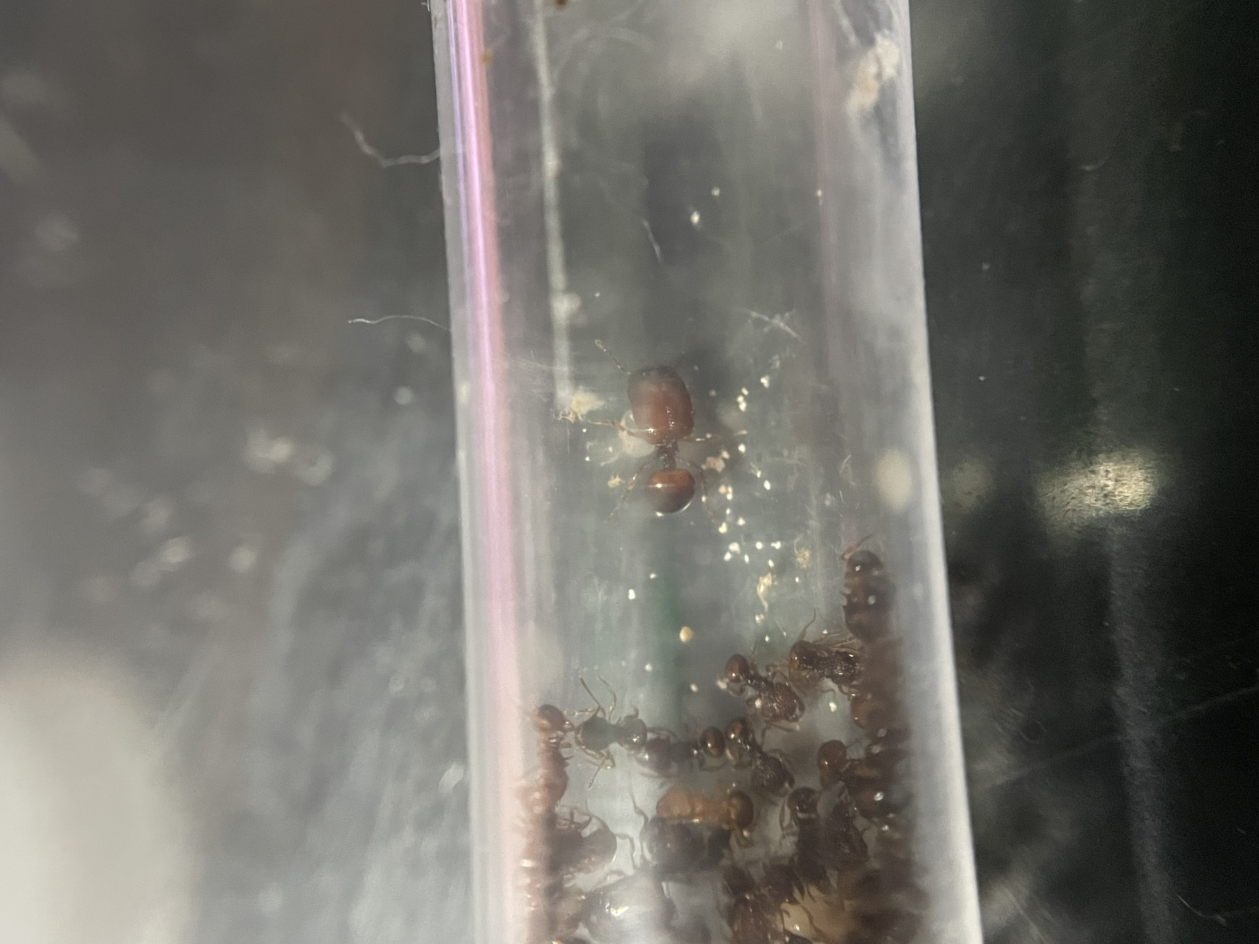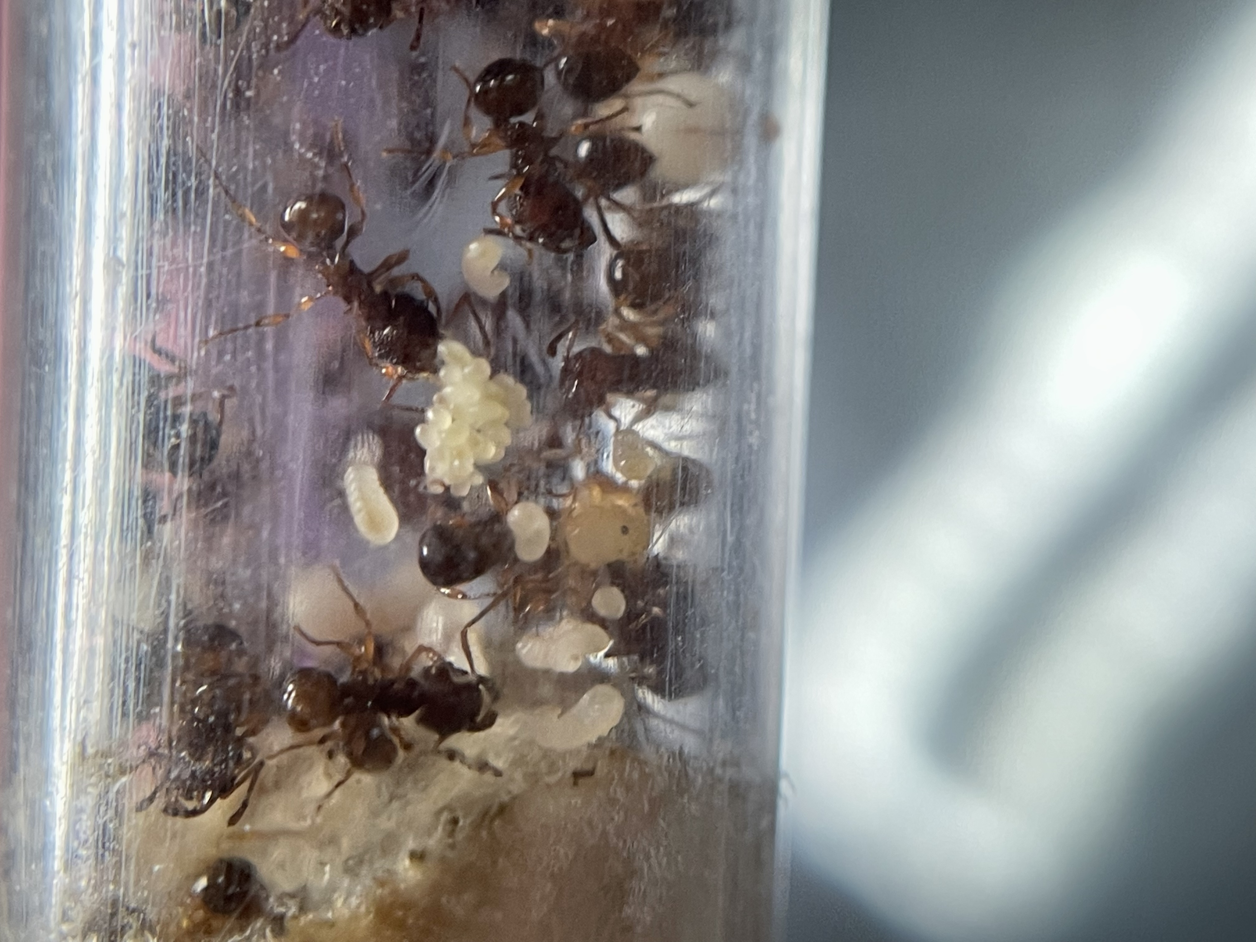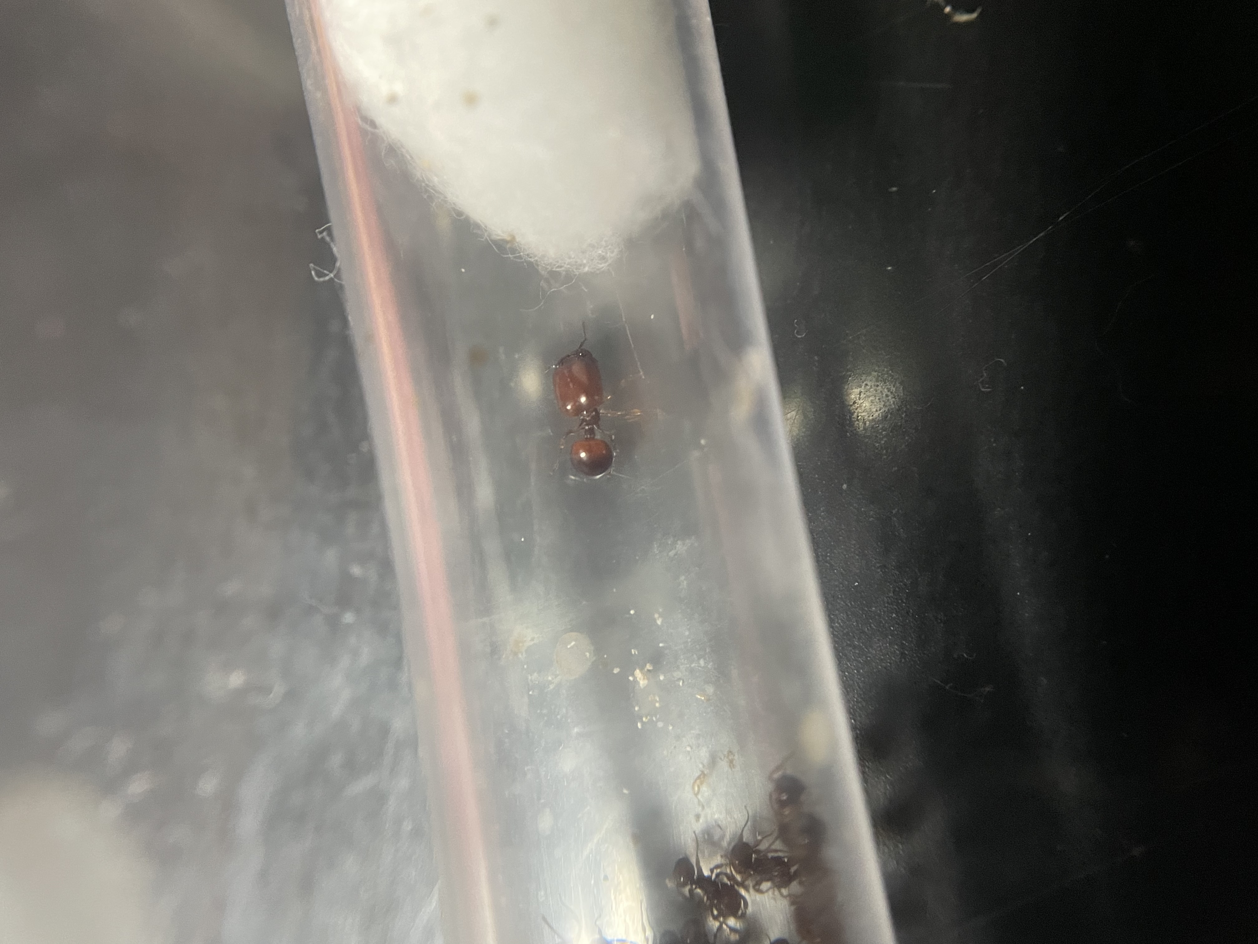22.03 otrzymałem kolonię Acanthomyrmex w której skład wchodziła królowa i około 30 robotnic. Obecnie kolonia posiada około 40 robotnic, poczwarki larwy i jajeczka więc mogę powiedzieć, że rozwija się naprawdę ładnie. Chciałbym się podzielić jednym z moich obserwowań, gdyż zauważyłem, że tak naprawdę bez przerwy na końcu probówki stoi minimum jeden żołnierz tak jakby pilnował wejścia do gniazda, kiedy reszta kolonii jest przy wacie. Generalnie to mróweczki są mega urocze i co jakiś czas będę wrzucał aktualizację
