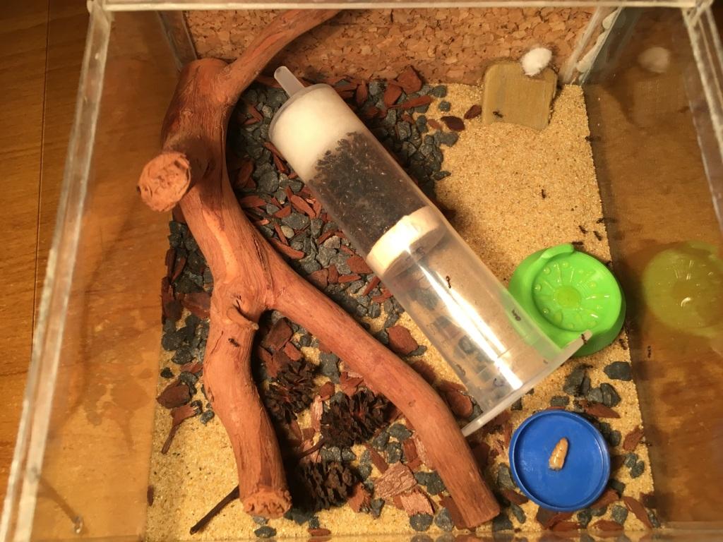 Można, choć nie tyle że nalewasz zakrętkę do pełna bo się w nim potopią, kilka kropel. Ja osobiście odcinam ten gwint i zostaje takie płaskie, widać na tym zdjęciu (te niebieskie, gdzie jest kawałek mącznika): Jeśli to dla Messor planujesz, to one podobno prawie nie tykają miodukubamis111 pisze: wt 29 sie, 2023 I jeszcze mam jedno pytanie czy można podawać mrówką miód z zakrętki od np wody