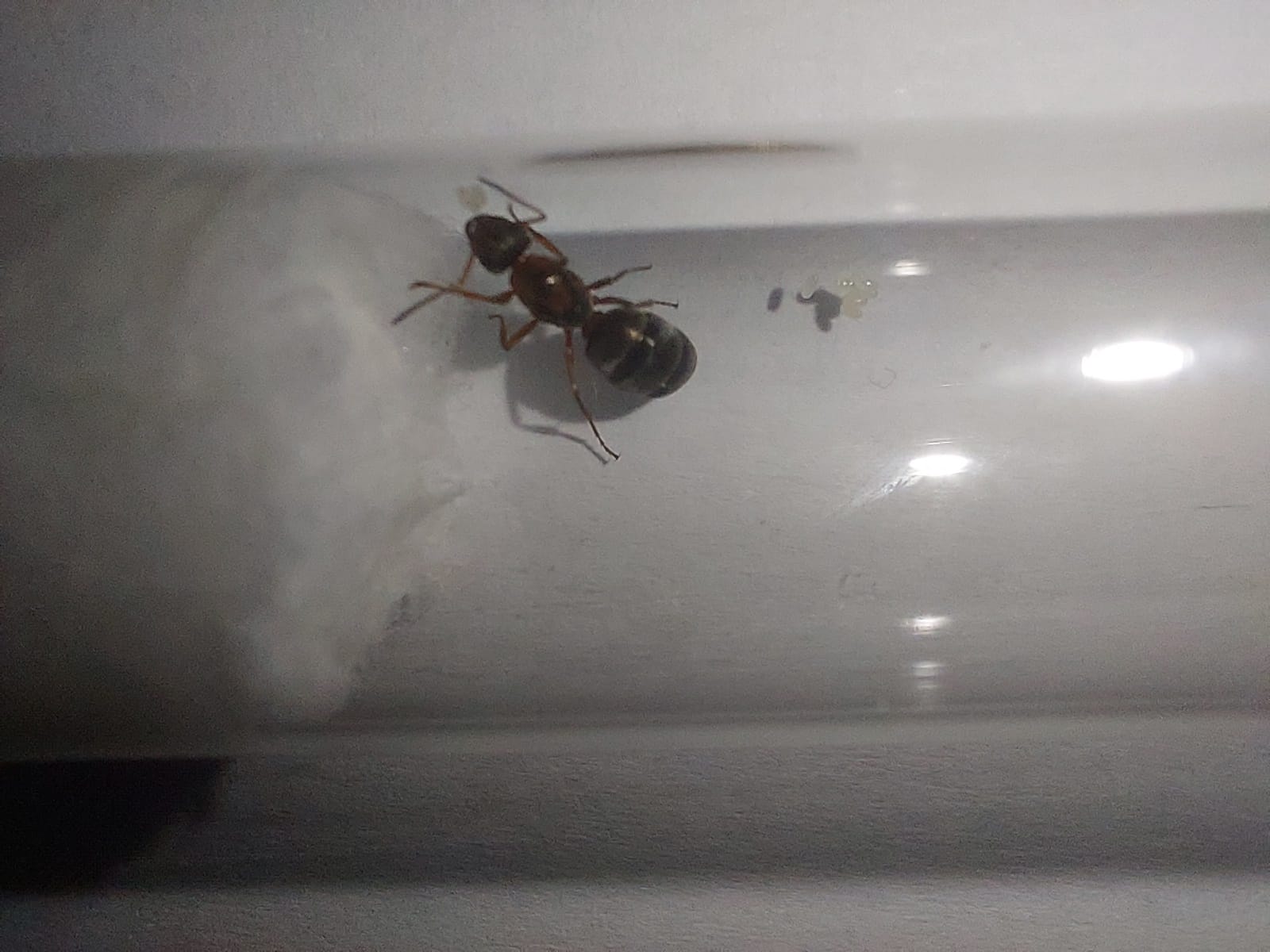 1. Dosyć niewielka, jakies 7-8 mm, w normalnym świetle wydaje się zupełnie czarna. Wyraźne przewężenie przed odwlokiem: 2. Zdecydowanie większa, szczególnie jeśli chodzi o 'szerokość'. Długość w okolicach 1 cm. Czerwone odnóża, na ciele też widoczne czerwone akcenty. Jak widać po zdjęciu, ta już zdążyła znieść jajka: Gdyby ktoś potrzebował więcej zdjęć to służę pomoca, proszę tylko dać znać